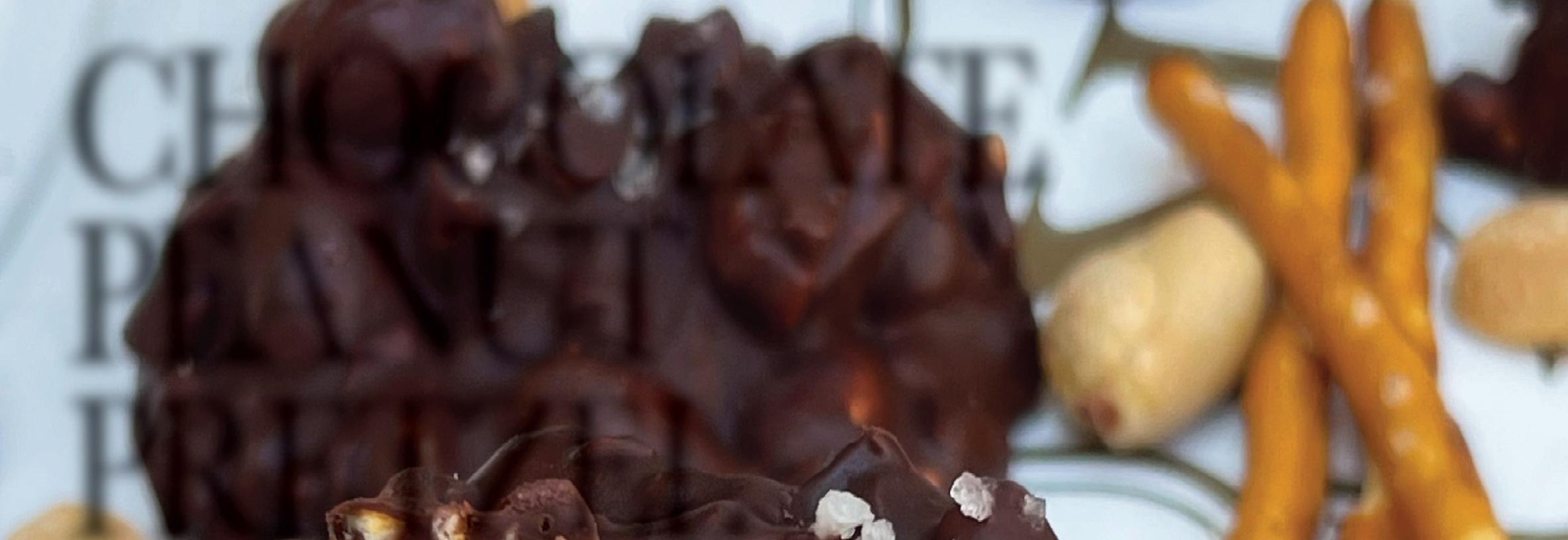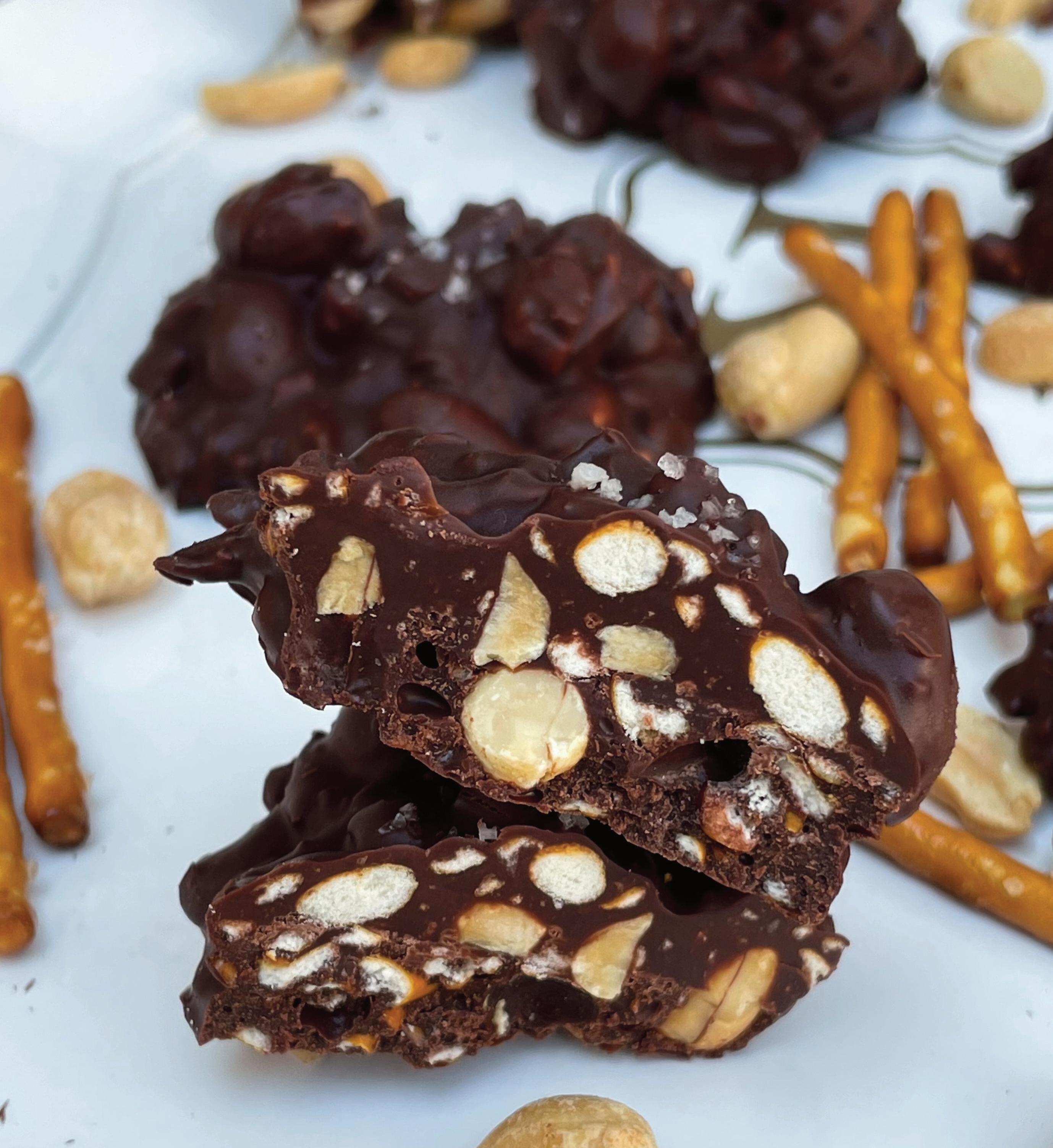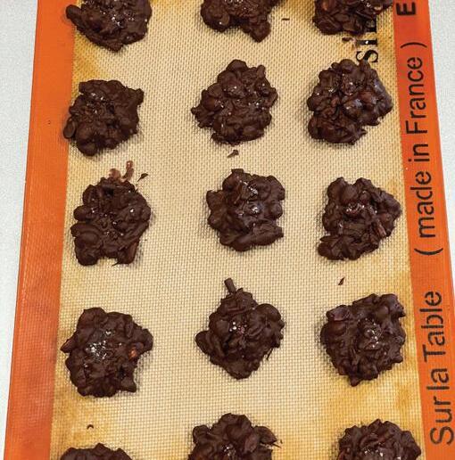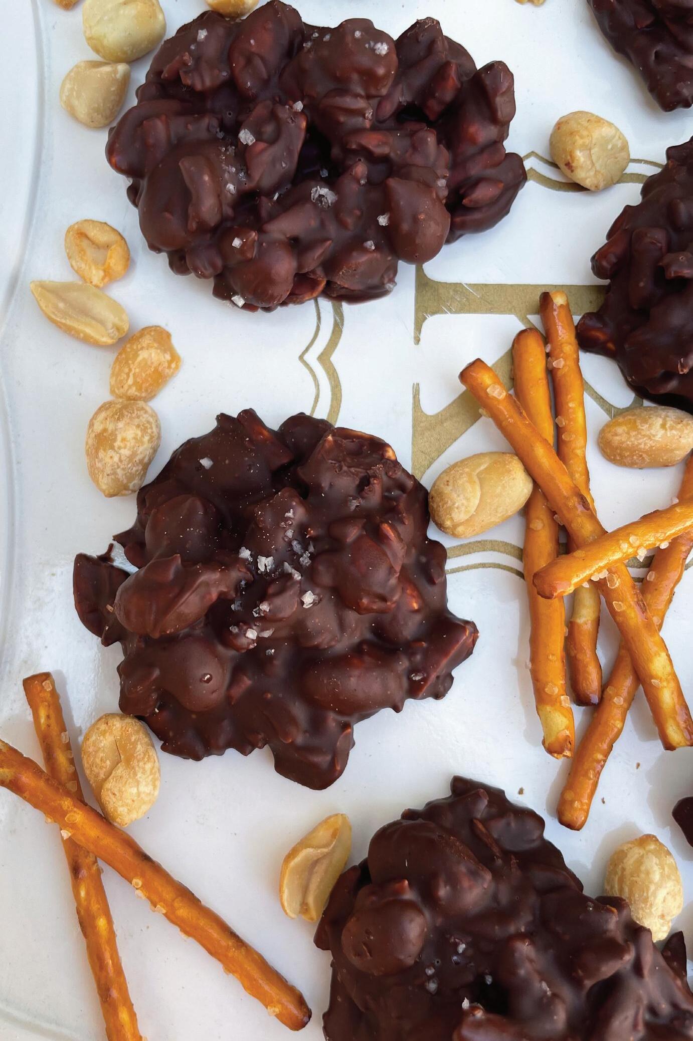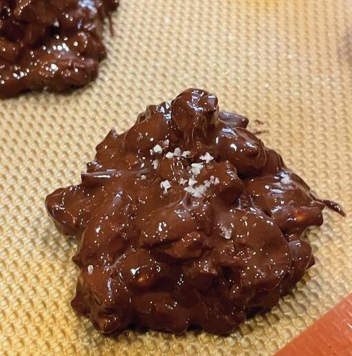 (2) Stir in crushed pretzels and peanuts. Drop spoonfuls onto cooking sheets lined with wax paper or silicone mats. Sprinkle a little sea salt on top.