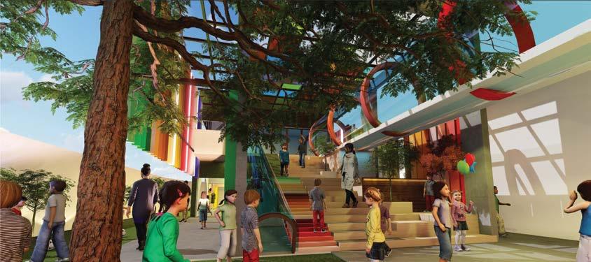 This design for BGS Kindergarten School combines playful, vibrant spaces with nature, featuring open green areas and a colorful façade. The layout encourages interaction through a central staircase and open-plan design, creating a seamless indoor-outdoor learning environment.