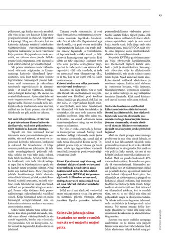 personalivaldkonna värbamise prioriteedid aastate lõikes täpselt paika, ehk milline üksus milliseid ohvitsere-allohvitsere-spetsialiste vajab ja mis aastal keda juurde saab. Selle järgi saab teha tellimusplaani, mille KVÜÕA saab võtta oma järgmise aasta ohvitserikandidaatide värbamisplaani aluseks. Koostöös KVÜÕA-ga töötame praegu välja ohvitseride karjäärimudelit, mis tõenäoliselt tugineb kahele sambale – juht ja staabiohvitser. Samaaegselt töötatakse välja ka allohvitseride karjäärimudel, mis peaks valmis saama juuni lõpul. Need annavad meile aluskriteeriumid, milliseid allohvitsere ja ohvitsere vajame, kuidas neid värbame ja teenistuses hoiame, välja õpetame, täiendusõpetame, teenistuses rakendame ja millal kellelgi on aeg tähtajaline teenistus lõpetada. Kõik need küsimused saavad vastuse selle aasta jooksul. Kaitseväe taastamise ajal Rootsit külastanud ohvitseridele tutvustati Rootsi karjäärimudelit, kus sõjakooli lõpetavale noorele ohvitserile joonistati ette kogu tema karjäär. Kunas jõuame sinnamaale, et meie ohvitserid ei peaks lühikese etteteatamise järgselt oma karjääris järske pöördeid tegema? Meil on tõesti praegu roteerimisega probleeme ja ma võin siiralt lubada, et need ei kao lähiaastatel, ükskõik mida personaliosakonnad ka ei teeks, ükskõik kui hästi me ka ei tegutseks. Kui meil on viis polti ja kaks mutrit, siis me ei saa kõigile kindlasti mutreid, rääkimata seibidest. Meil on puudu keskmiselt 47% vanemohvitseridest. Peastaabis on puudu 44 vanemohvitseri. Piirnumbri annab kokku see, et välisteenistuses olijad on peastaabi kirjas, aga nemad täidavad oma kohust väljaspool Eesti piire. See tähendab, et töökoormust ja pingeid on kohapeal olijatel rohkem, kui inimene teadliku teenistusega täita jõuab. Kõige rohkem demotiveerib see, kui inimesel on ülesandeid rohkem, kui ta suudab täita, sest ta ei saa ühtki asja täita nii põhjalikult, nagu ta ohvitserina tahaks. Ta tahaks näha oma tegevuse tulemust, seda analüüsida ja korrigeeritult edasi minna. Me teeme praegu kõike korraga: plaanime ja viime ellu ning seda muutunud keskkonnas ja alamehitatuse tingimustes. Suurem osa meie stabiilse arenguga naaberriike on ju külma sõja järgselt läinud oma armeede vähendamise teed. Meie alustasime tühjalt kohalt ning pi-
