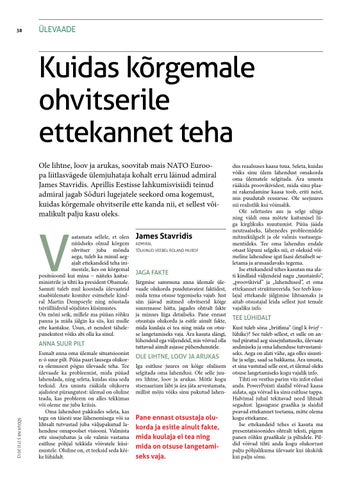 Kuidas kõrgemale ohvitserile ettekannet teha Ole lihtne, loov ja arukas, soovitab mais NATO Euroopa liitlasvägede ülemjuhataja kohalt erru läinud admiral James Stavridis. Aprillis Eestisse lahkumisvisiidi teinud admiral jagab Sõduri lugejatele seekord oma kogemust, kuidas kõrgemale ohvitserile ette kanda nii, et sellest võimalikult palju kasu oleks.