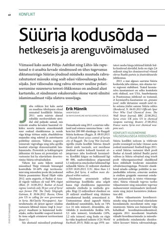 Süüria kodusõda – hetkeseis ja arenguvõimalused Viimased kaks aastat Põhja-Aafrikat ning Lähis-Ida raputanud n-ö araabia kevade sündmused on ühes tugevamas diktatuuririigis Süürias jõudnud nüüdseks muutuda rahvarahutustest mässuks ning sealt edasi välisosalusega kodusõjaks. Just välisosalus ning rahva süvenev usuline polariseerumine suureneva terrori õhkkonnas on andnud alust kartusteks, et sündmuste eskaleerudes oleme varsti silmitsi islamimaailmast välja ulatuva ususõjaga.