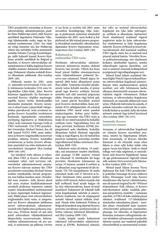 Rahutused ja umbusaldus ÜRO vastu Hoolimata rahvusvahelise administratsiooni initsiatiivist muutus olukord Kosovos taas ärevaks. Vähem kui kuus kuud pärast lõpliku otsustusprotsessi aasta väljakuulutamist puhkesid Kosovos taas rahutused. Nimelt uppus 16. märtsil 2004 kolm albaanlasest poissi Ibari jõkke. Vaatamata tõendite puudumisele teatas kohalik meedia, et poisse ajasid taga Kosovo serblaste koerad, mistõttu nad olid sunnitud põgenema jõkke. Õnnetus juhtus väga halval ajal, sest samal päeval korraldati mitmel pool Kosovos meeleavaldusi, kuna mitmetele KVA juhtfiguuridele oli esitatud süüdistus 1999. aastal toime pandud sõjakuritegudes. Kolme poisi hukkumine aga suurendas viha ÜRO vastu ja lisaks oli see nüüd suunatud ka kohalike serblaste vastu. Vägivallalaine levis üle kogu provintsi, hoolimata KFORi jõupingutustest seda ohjeldada. Kohalike albaanlaste liidrid õhutasid vägivalda veelgi ja isegi Rugova, kes oli tuntud kui passiivse vastupanu eestvedaja, keeldus vägivallatsemist hukka mõistmast (KerLindsay 2009: 150). Rahutuste mõju oli tohutu. 19. märtsiks, mil mässamine suudeti ohjeldada, olid peaaegu 51 000 inimest võtnud osa vähemalt 33 intsidendist üle kogu provintsi. Sündmuste tulemusena sai surma 19 inimest, nendest 8 serblast ja 11 albaanlast, ning vigastatuid oli üle tuhande. Üle 550 majapidamise oli maha põletatud, lisaks veel 27 kloostrit ja kirikut. Sündmuste tõttu asustati ümber umbes 4100 inimest, kellest enamik olid küll serblased, kuid nende hulgas oli ka teisi vähemusrahvusi, kaasa arvatud mustlased. Rahutustel oli tohutult halb mõju kogukondade suhetele ja omavahelisele usaldusele, mis oli sõjajärgsetel aastatel vähesel määral tekkida jõudnud. Nende tõttu katkestati Priština ja Belgradi kontaktid ning lõpetati Kosovo provintsi isevalitsuse institutsioonide ja Serbia valitsuse tehnilised läbirääkimised (Ker-Lindsay 2009: 150). Lisaks kõigele muule kahjustasid rahutused rahvusvahelist administratsiooni ja KFORi. Rahutused näitasid,