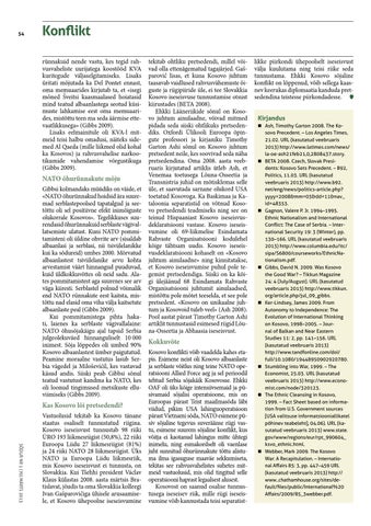 likke piirkondi ühepoolselt iseseisvust välja kuulutama ning teisi riike seda tunnustama. Ehkki Kosovo sõjaline konflikt on lõppenud, võib sellega kaasnev keerukas diplomaatia kanduda pretsedendina teistesse piirkondadesse. Kirjandus Ash, Timothy Garton 2008. The Kosovo Precedent. – Los Angeles Times, 21.02. URL (kasutatud veebruaris 2013) http://www.latimes.com/news/ la-oe-ash21feb21,0,2808437.story. BETA 2008. Czech, Slovak Presidents: Kosovo Sets Precedent. – B92, Politics, 11.03. URL (kasutatud veebruaris 2013) http://www.b92. net/eng/news/politics-article.php? yyyy=2008&mm=03&dd=11&nav_ id=48353. Gagnon, Valere P. Jr. 1994–1995. Ethnic Nationalism and International Conflict: The Case of Serbia. – International Security 19: 3 (Winter), pp. 130–166. URL (kasutatud veebruaris 2013) http://www.columbia.edu/itc/ sipa/S6800/courseworks/EthnicNationalism.pdf. Gibbs, David N. 2009. Was Kosovo the Good War? – Tikkun Magazine 24: 4 (July/August). URL (kasutatud veebruaris 2013) http://www.tikkun. org/article.php/jul_09_gibbs. Ker-Lindsey, James 2009. From Autonomy to Independence: The Evolution of International Thinking on Kosovo, 1998–2005. – Journal of Balkan and Near Eastern Studies 11: 2, pp. 141–156. URL (kasutatud veebruaris 2013) http://www.tandfonline.com/doi/ full/10.1080/19448950902920780. Stumbling into War, 1999. – The Economist, 25.03. URL (kasutatud veebruaris 2013) http://www.economist.com/node/320123. The Ethnic Cleansing in Kosovo, 1999. – Fact Sheet based on information from U.S. Government sources [USA valitsuse informatsiooniallikatel põhinev teabeleht], 04.06). URL (kasutatud veebruaris 2013) www.state. gov/www/regions/eur/rpt_990604_ ksvo_ethnic.html. Webber, Mark 2009. The Kosovo War: A Recapitulation. – International Affairs 85: 3, pp. 447–459 URL (kasutatud veebruaris 2013) http:// www..chathamhouse.org/sites/default/files/public/International%20 Affairs/2009/85_3webber.pdf.