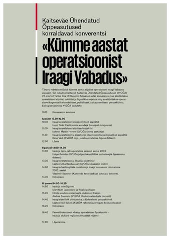 I paneel 10.30–12.00 10.30 Iraagi operatsiooni välispoliitilised aspektid Harri Tiido (Eesti alaline esindaja Euroopa Liidu juures) 11.00 Iraagi operatsiooni sõjalised aspektid kolonel Martin Herem (KVÜÕA ülema asetäitja) 11.30 Iraagi operatsioon ja sissetungi otsustusprotsessi õiguslikud aspektid Rene Värk (KVÜÕA riigi- ja rahvusvahelise õiguse dotsent) 12.00 Lõuna II paneel 13.00–14.30 13.00 Iraak ja tema rahvusvaheline seisund aastal 2003 Holger Mölder (KVÜÕA julgeolekupoliitika ja strateegia õppesuuna dotsent) 13.30 Iraagi operatsioon ja õhusõja doktriinid kapten Mika Raudvassar (KVÜÕA sõjaajaloo lektor) 14.00 Iraagi arheoloogiliste muististe ja Iraagi muuseumi rüüstamine 2003. aastal Vladimir Sazonov (Kaitseväe keelekeskuse juhataja, dotsent) 14.30 Kohvipaus III paneel 14.50–16.20 14.50 Iraak ja inimõigused Mart Nutt (ajaloolane ja Riigikogu liige) 15.20 Etnilis-usuliste vähemuste olukorrast Iraagis Andres Saumets (KVÜÕA ühiskonnateaduste dotsent) 14.40 Iraagi siseriiklik dünaamika ja föderalismi perspektiivid kapten Karl Salum (KVÜÕA rakendusuuringute keskuse teadur) 16.20 Kohvipaus 16.40