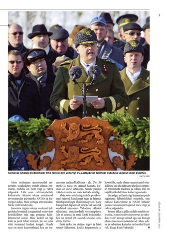 nistuses andnud kalleima – elu. Üle 130 mehe ja naise on saanud haavata. Nemad on meie veteranid. Nende panuse väärtustamine on meie kõikide auvõlg. Meie veteranid ning nende perekonnad vajavad kindlamat tuge ja laiemat tähelepanu kogu ühiskonna poolt. Kahe kuu pärast, täpsemalt jüripäeval, on kõik oodatud siinsamas Vabaduse väljakul tähistama esmakordselt veteranipäeva. Me ei unusta ka neid Eesti kodanikke, kes on jätnud 20. sajandi sõdades oma elu ja tervise. Eesti jaoks on oluline tugev ja hästi toimiv liitlassuhe. Lisaks kogemustele ja