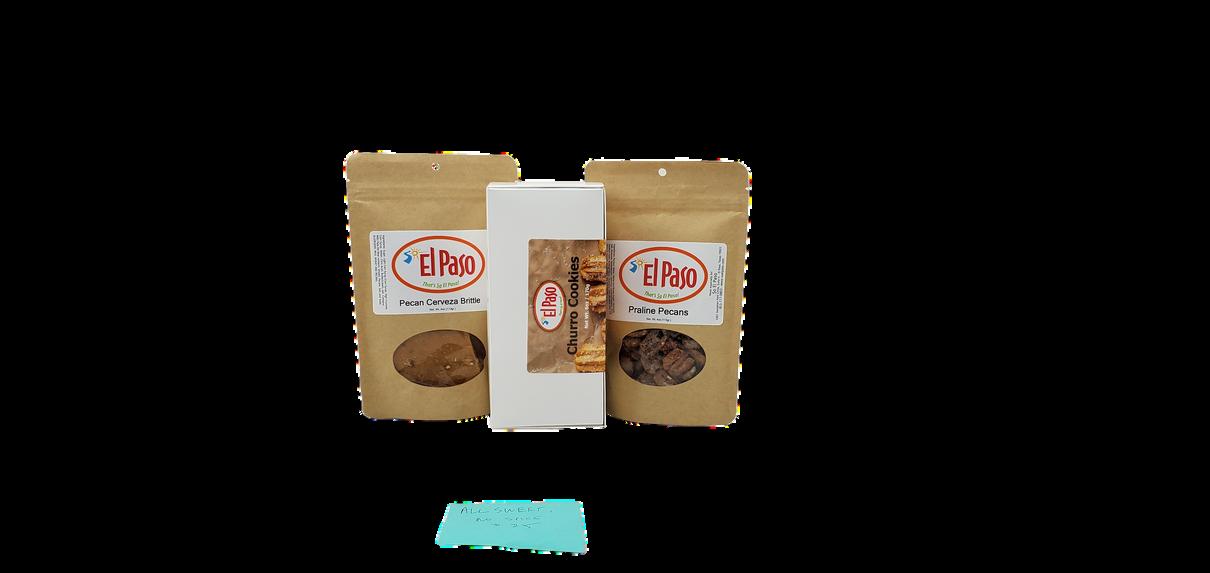 ( 2 ) S a l s a d e M e s a ( 9 o z ) ( 2 ) S a l s a d e A l a m e d a ( 9 o z ) ( 2 ) B u t t e r f i e l d T r a i l M i x ( 4 o z ) ( 2 ) P r a l i n e P e c a n s ( 4 o z ) ( 2 ) P e c a n C e r v e z a B r i t t l e ( 4 o z ) ( 2 ) J a l a p e ñ o P e c a n B r i t t l e ( 4 o z ) ( 2 ) C h u r r o C o o k i e s ( 2 ) T o s t a d a s