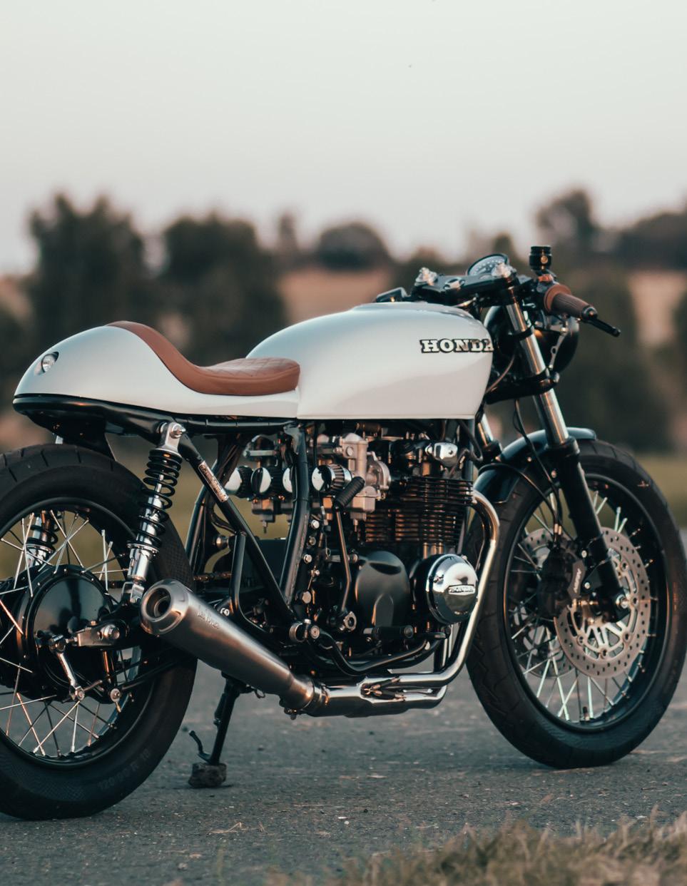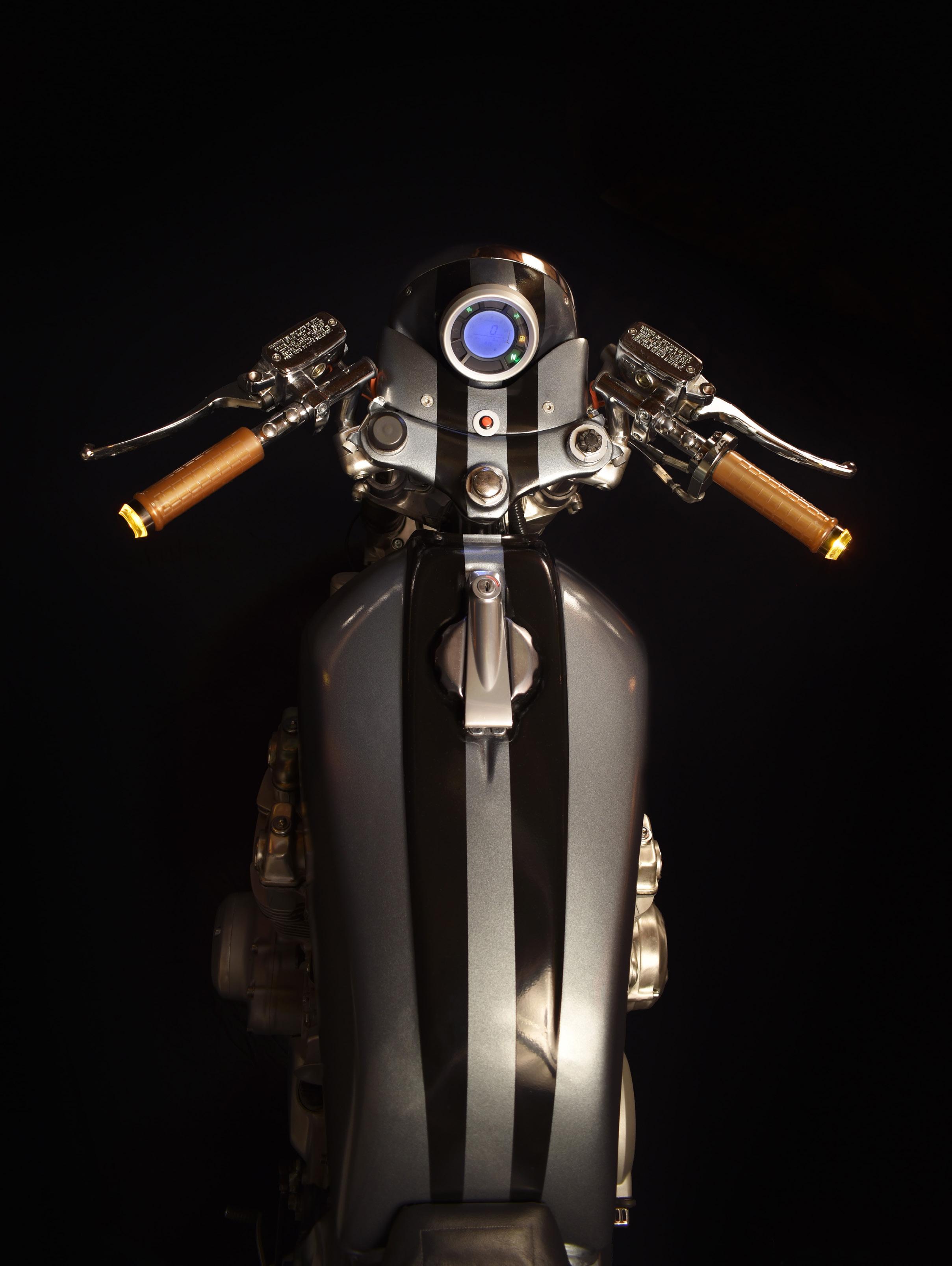 - What do you like best about the finished bike? The part we like best about the bike is the minimalist tail which in my opinion looks quite modern with the LED tail light and the clean finish. We also love the bold overall appearance with the black engine, frame and rims. The muffler helps there, too. Black and white is always a classic combination which is never out of date, especially because the monochrome industrial vibe is so popular today.
