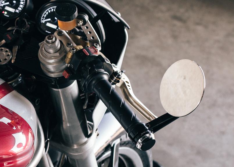With the reassembly of the bike a headlight with LED parking light ring was mounted to give the front end the modern touch we were aiming for. Two modern retro gauges from Daytona were installed and Motogadget Motosign Mini motorbike warning lights in black were integrated into the upper triple tree via CNC machining. In addition, the bike got LSL levers for the Brembo brakes, Motogadget bar-end indicators. It also comes with a stainless-steel license plate mount including Motogadget mini indicators as well as a small rear light, integrated in the rear tube. The wheels are now hugged by Pirelli Diablo Strada tires. Of course, the Ducati is fully road-legal in Germany.