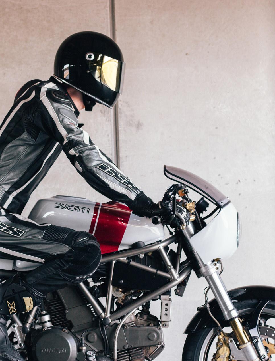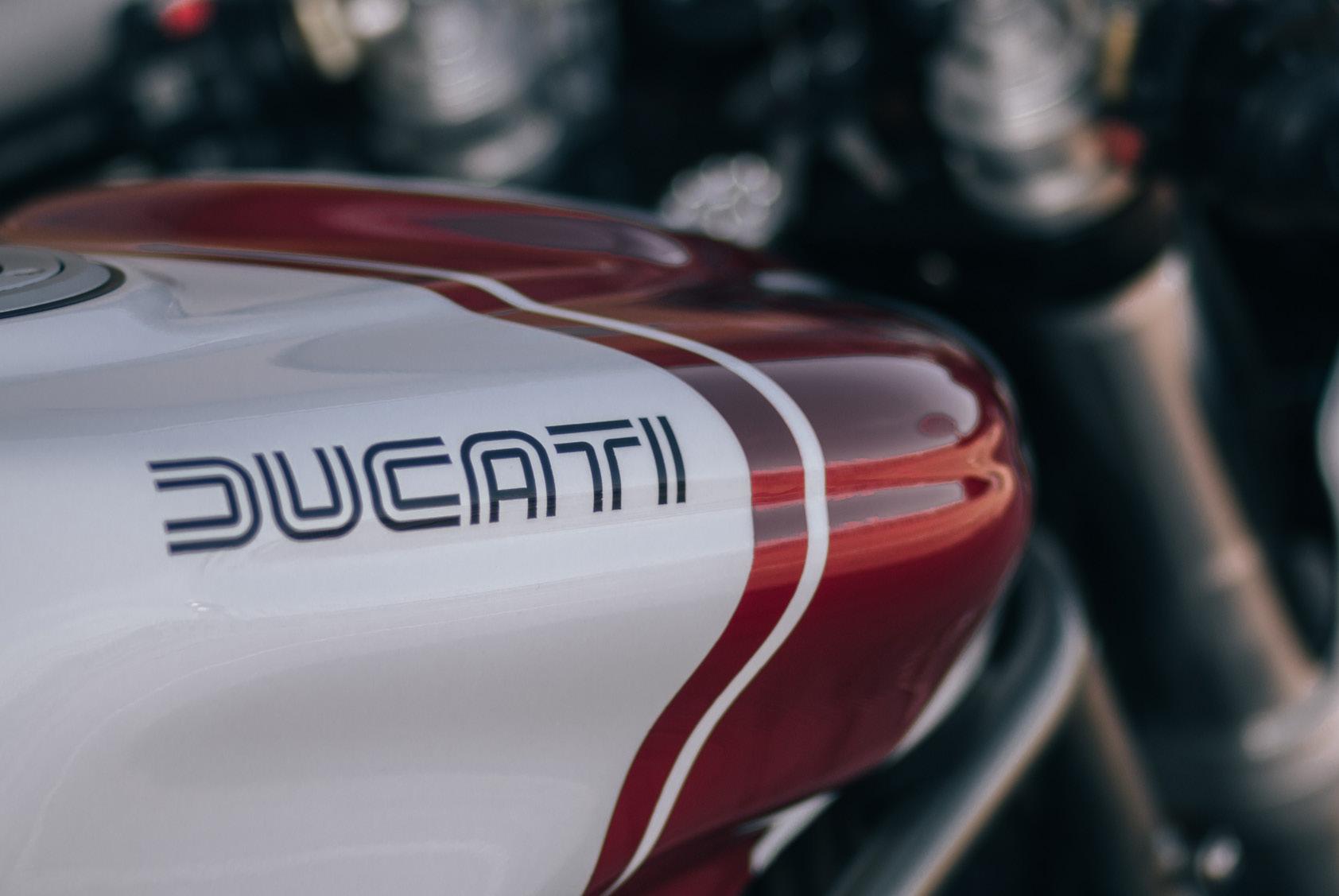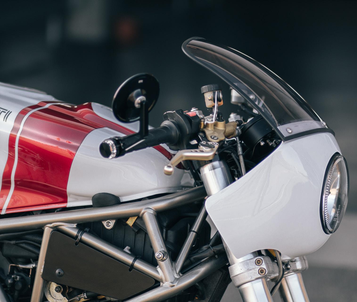 While completely stripping the bike, we refurbished all worn parts and integrated the new electronic components. The exhaust manifold was polished and we fitted two GP-style exhausts with custom mounts to underline the modern racer intention. We wanted to keep the paint scheme simple to let he shapes speak - the logo on the gas tank is a reminder to Ducati’s racing heritage. The paint is finished in Ferrari Rosso Fuoco which is a sophisticated three-layer paint. We actually do all paint work professionally in-house, since one of us is a trained automotive refinisher. The engine and frame got a new layer of paint as well. Original colours were used on the frame and wheels. A fitting dark grey metallic paint was chosen for the engine to create a little contrast. The engine paint was worn down and half gone, probably from contact with clutch fluid and oil.