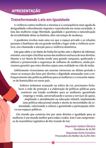 Transformando Leis em Igualdade A violência contra mulheres e meninas é a consequência mais aguda da desigualdade culturalmente imposta e reproduzida em nossa sociedade. A luta das mulheres exige liberdade, igualdade e questiona a naturalização da invisibilidade delas na história: abre um tempo de mudança. A pandemia revelou mais uma vez que o espaço privado e as relações pessoais e familiares são em grande medida o lugar onde a violência acontece, nos chamando a atenção para a violência doméstica. Este guia sobre a Lei Maria da Penha foi escrito com o objetivo de informar, orientar, encorajar e facilitar acesso das mulheres na busca de seus direitos. Mesmo a Lei Maria da Penha sendo uma grande conquista, quebrando o silêncio e promovendo a segurança de milhares de mulheres, ainda precisamos garantir que estes direitos sejam uma realidade na vida de todas. Infelizmente vivenciamos um enorme retrocesso no último período e vimos os avanços das lutas por direitos e dignidade ameaçadas com o enfraquecimento das políticas públicas para as mulheres e o crescente número de feminicídios no nosso país. Embora tenhamos avançado na esfera da Lei, precisamos fortalecer a rede de proteção e a elaboração de políticas públicas para construir um Estado acolhedor para as mulheres: garantindo emprego e renda, universalizando o acesso a serviços de apoio, ampliando o atendimento na educação infantil, implantando uma política educacional ampla e atenta às necessidades da comunidade, valorizando a cultura e garantindo a participação efetiva nos espaços públicos. Um mundo que construa leis por mais direitos e igualdade para as mulheres é um mundo melhor para todas e todos. Este é um compromisso da Assembleia Legislativa do Rio Grande do Sul. Deputado Valdeci Oliveira Presidente da AL/RS