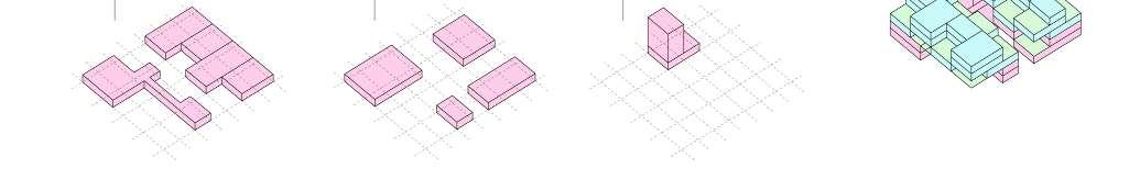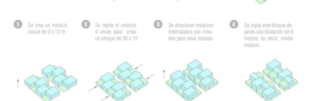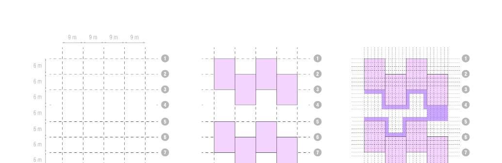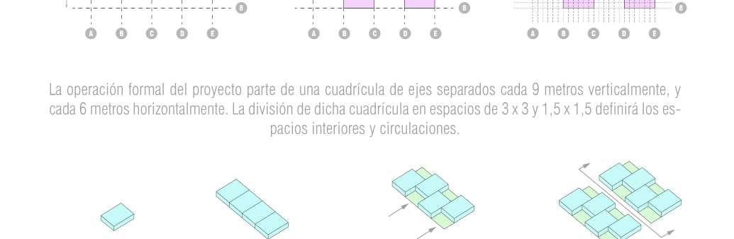 The formal operation of the proyect is based on a grid of axis separated every 9 meters vertically and 6 meters horizontally. The division of this grid in spaces of 3 x 3 and 1.5 x 1.5 will define the interior spaces and circulations.
