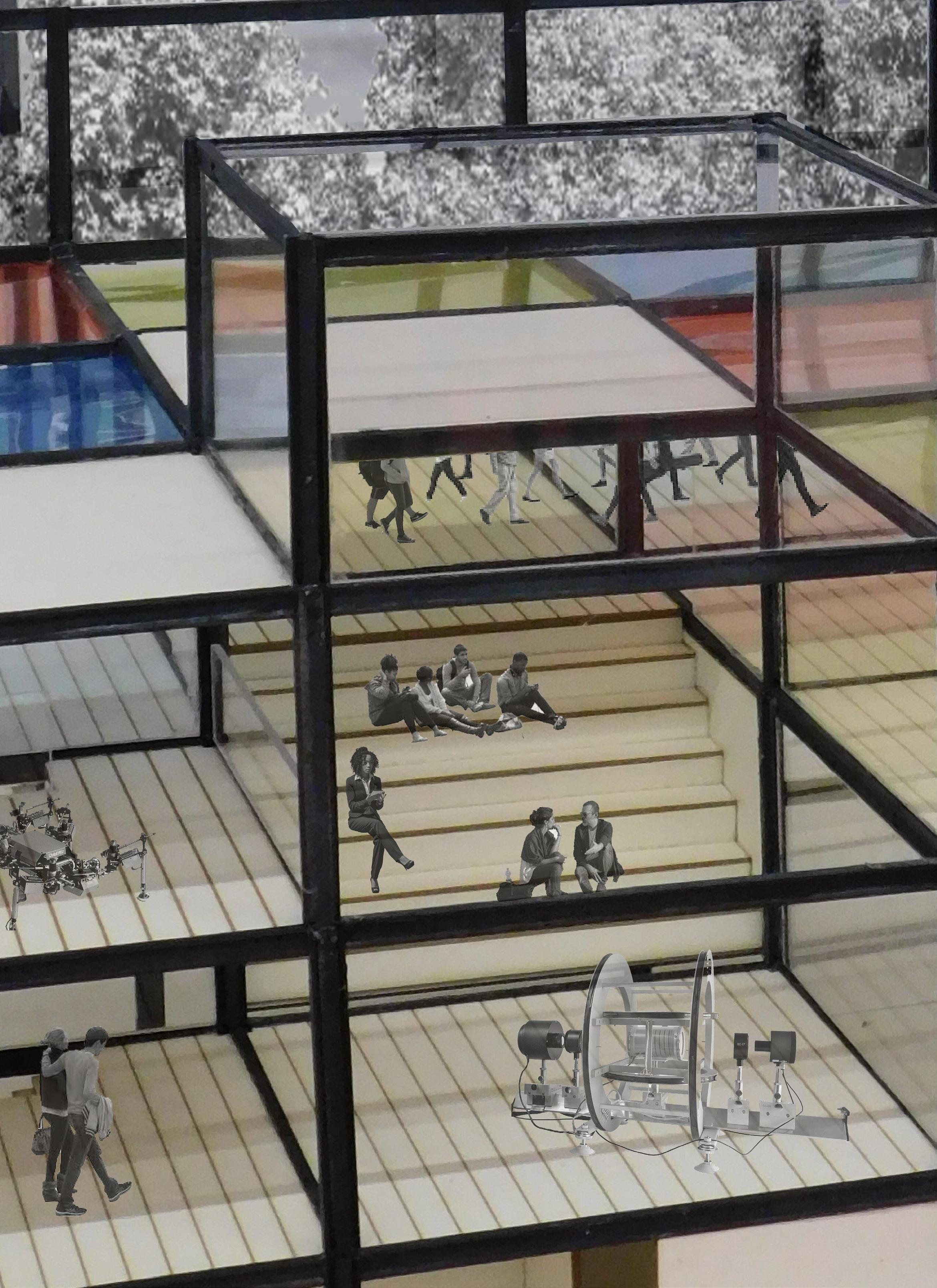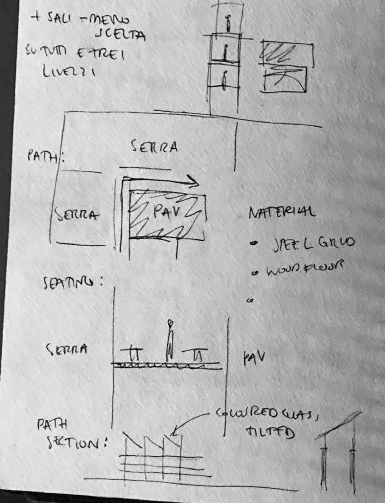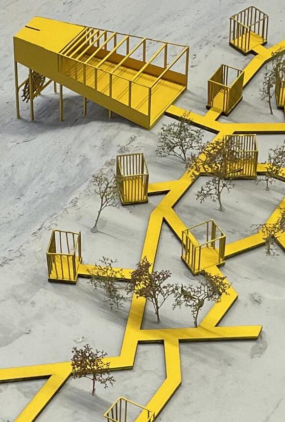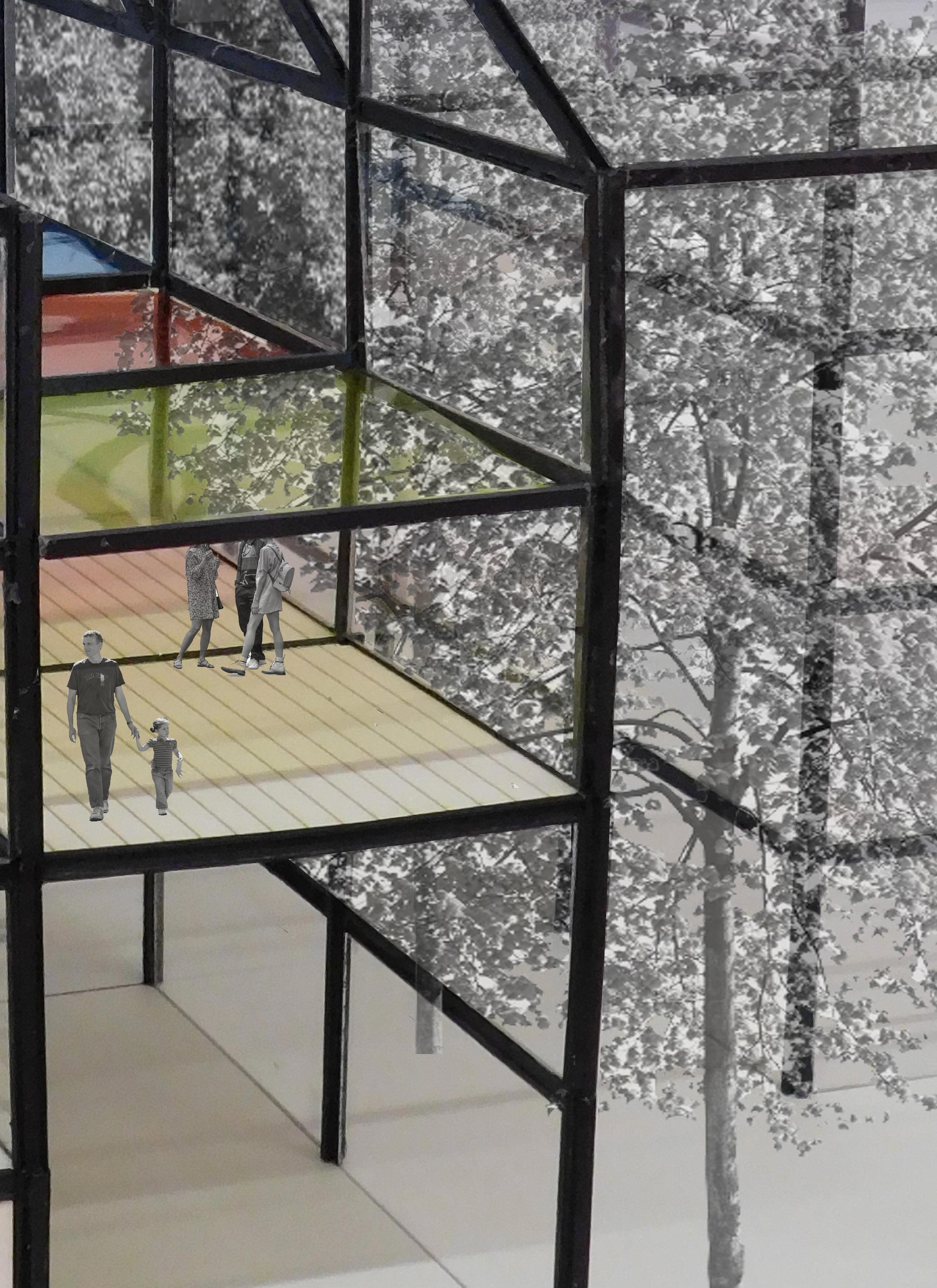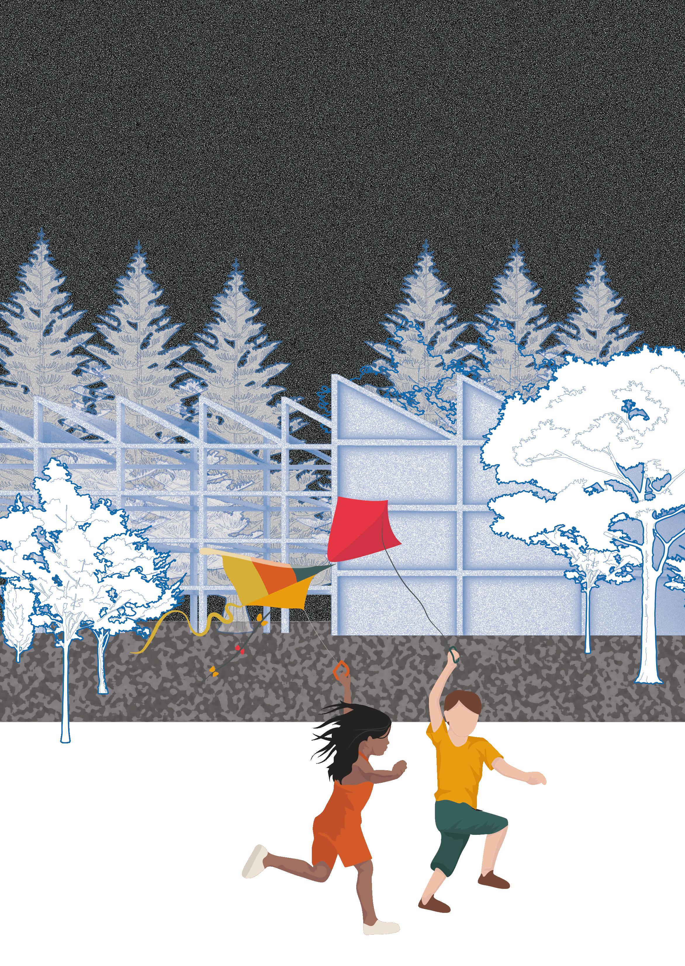 The Factory of Prototypes is set to become an extension of the Bovisa Campus of the Politecnico of Milan to be developed in a reclaimed industrial area known as the “Goccia” for the drop-like shape created by surrounding railways. The functional program includes 8 technical pavillions where distinct spaces between visitors and students were needed and a completely public exhibition pavillion to be inserted within the urban forest that has rosen naturally in the “Goccia”. The pavillions are characterized by a steel structural grid within which technical or exhibition spaces alongside glasshouses. The grid also allows us to create modular steel elevated pathways connecting all pavillions and providing a different experience of the woods. Key elements in the design is the use of coloured glass as covering in spaces for visitors giving a new perception of space and light; and the the juxtaposition of technology and nature both in the pathways and the buildings.