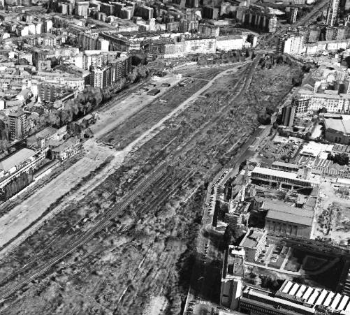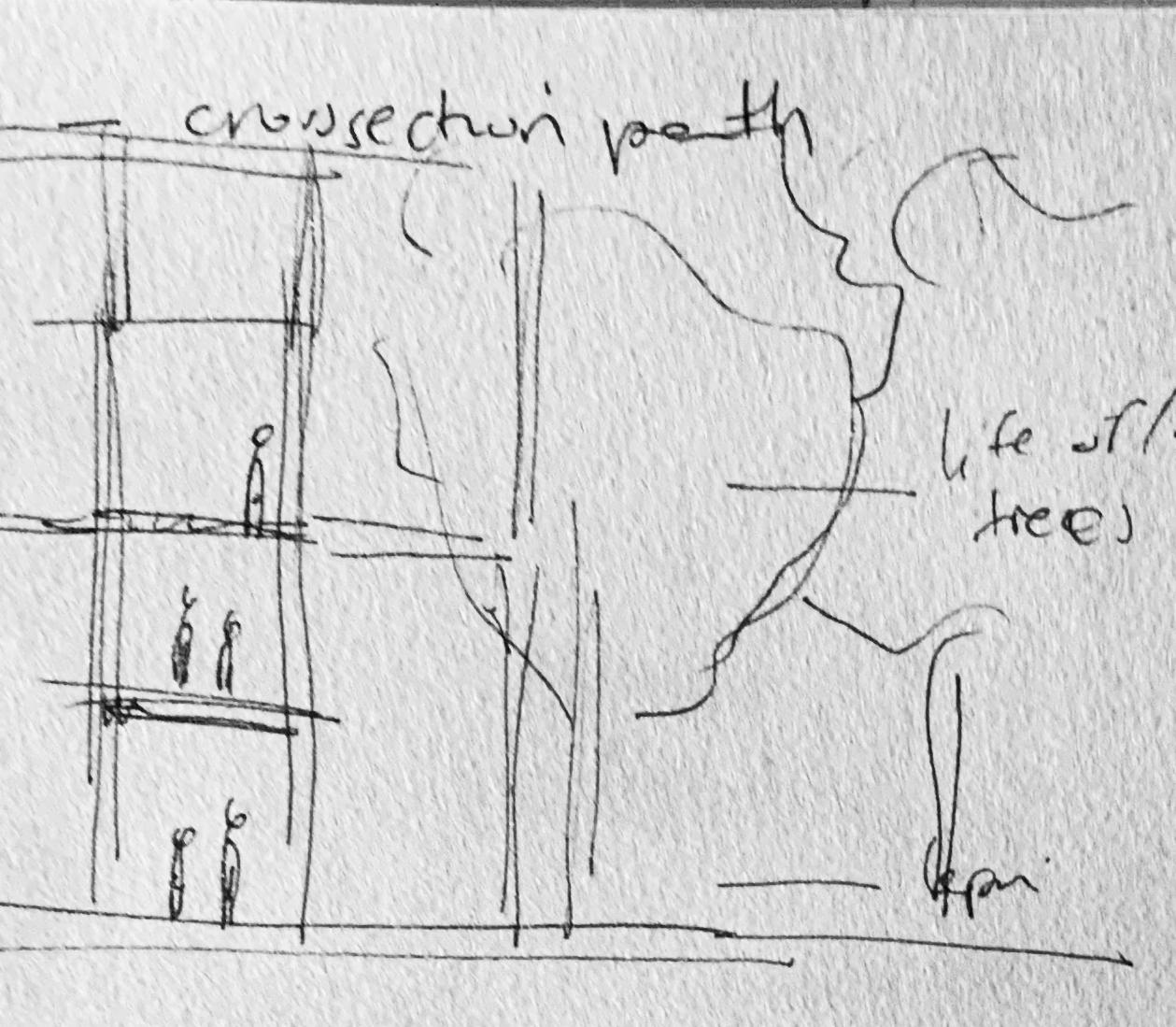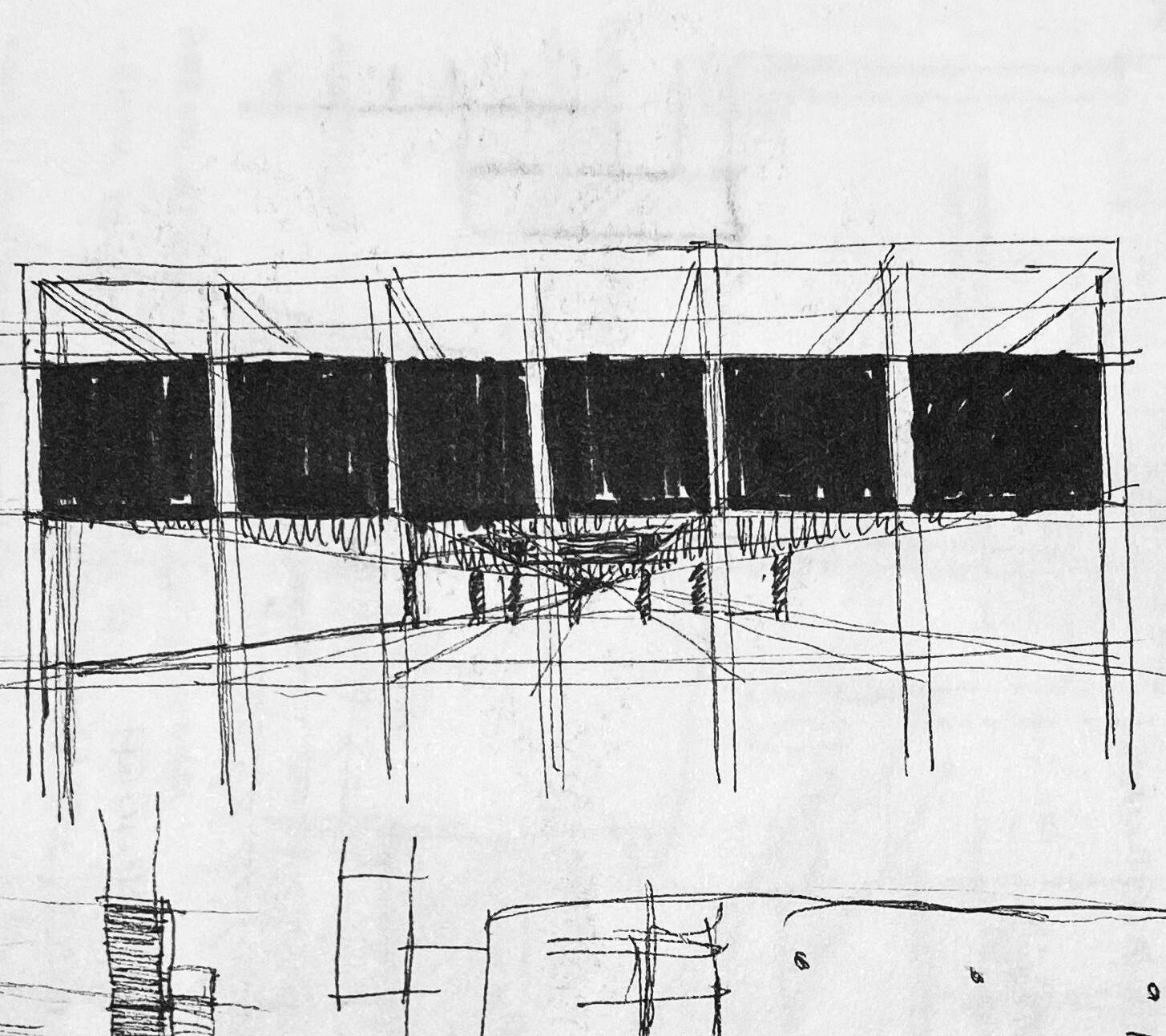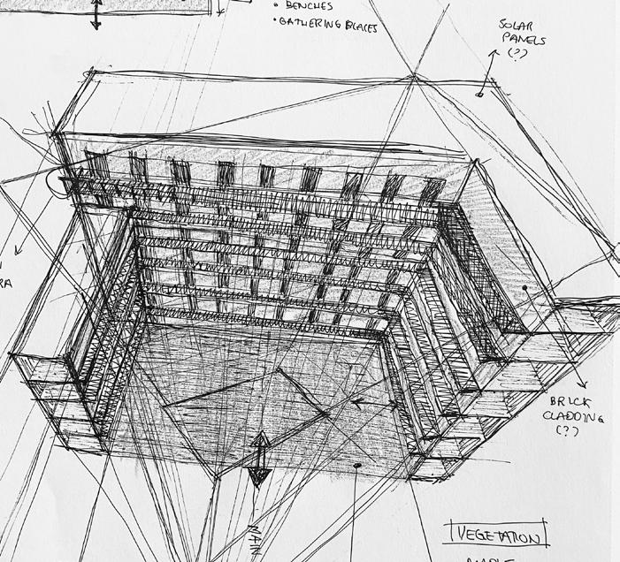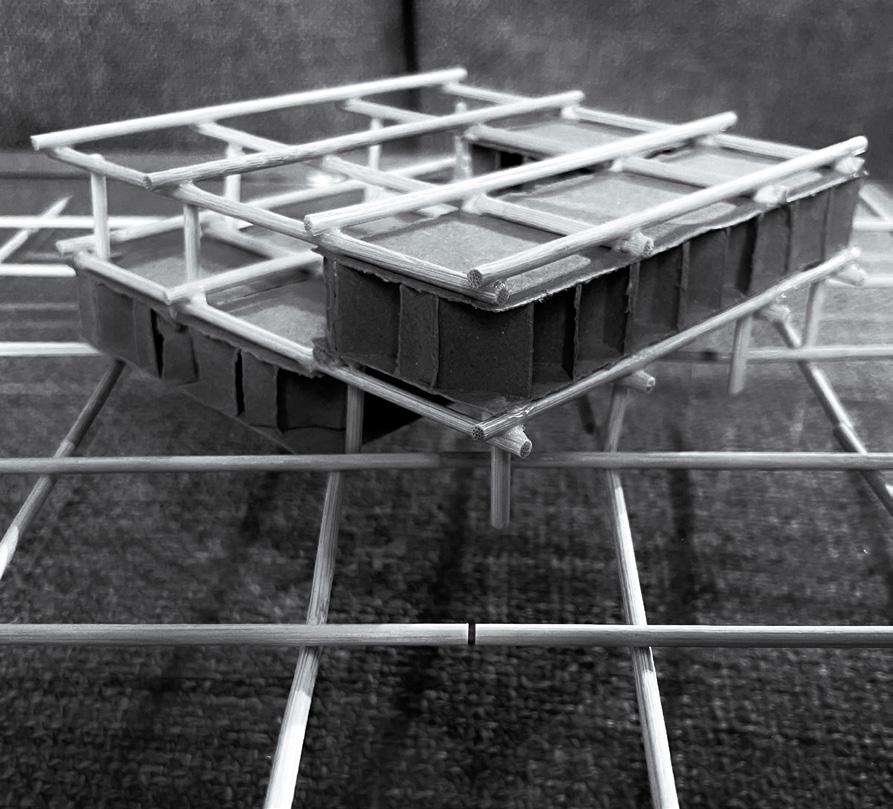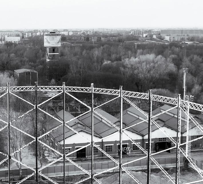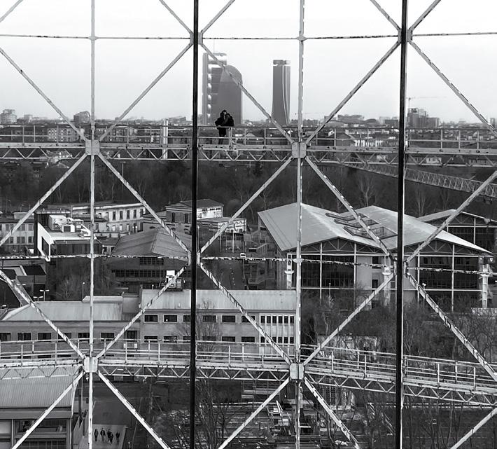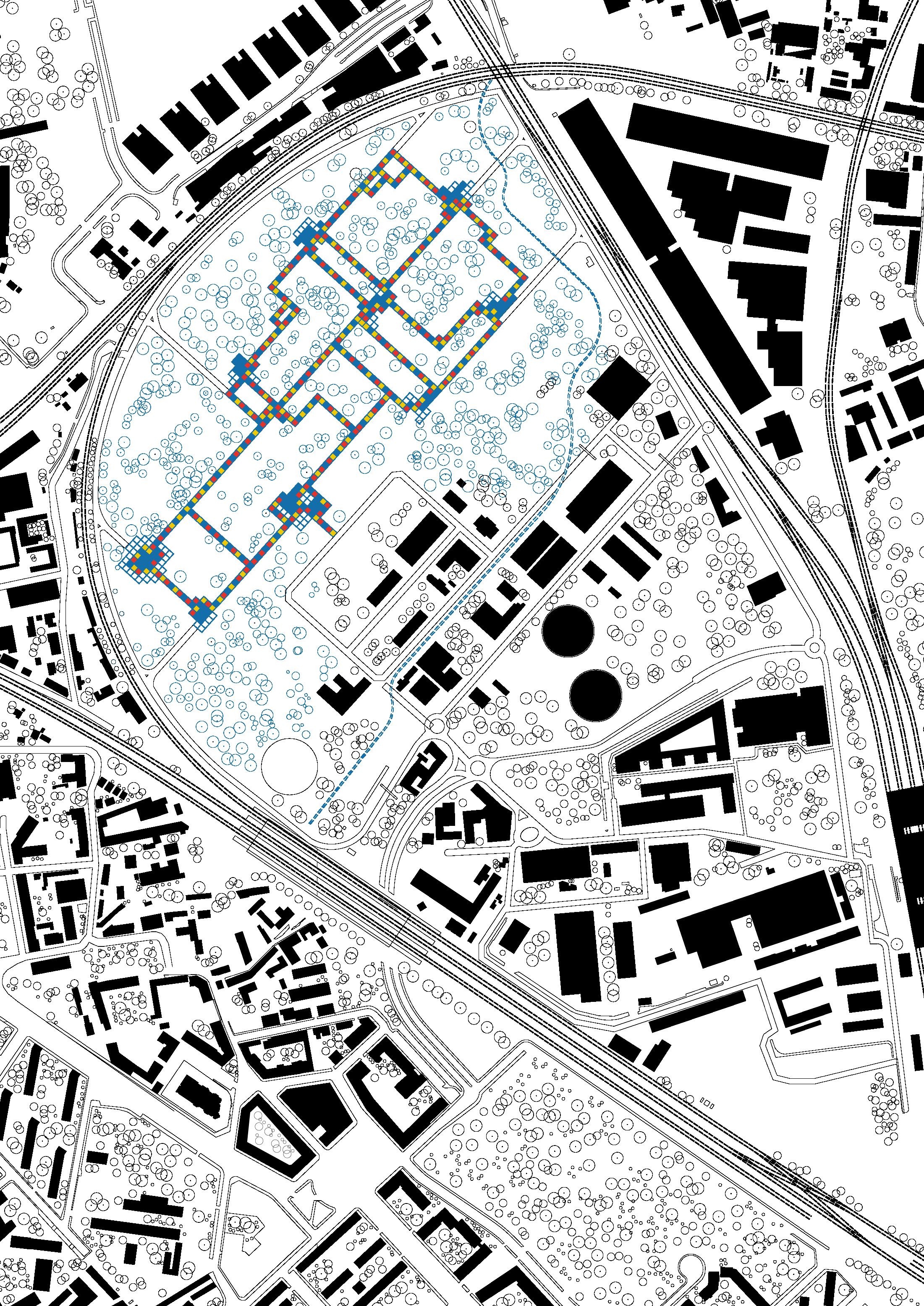 The “Goccia” developed as an industrial center north of Milan in the late 19th century. Iconic in the local landscape is the railway defining the drop-like perimeter and the two gasometers which tower over the industrial heritage brick buildings and urban forest to the north and Politecnico’s Bovisa Campus to the south. The exposed steel framework of the gasometers was crucial in the design process: initially re-interpreted as a continuous grid spreading through the forest, to finally morph into the clusters of vertical modular spaces connected by elevated steel pathways.