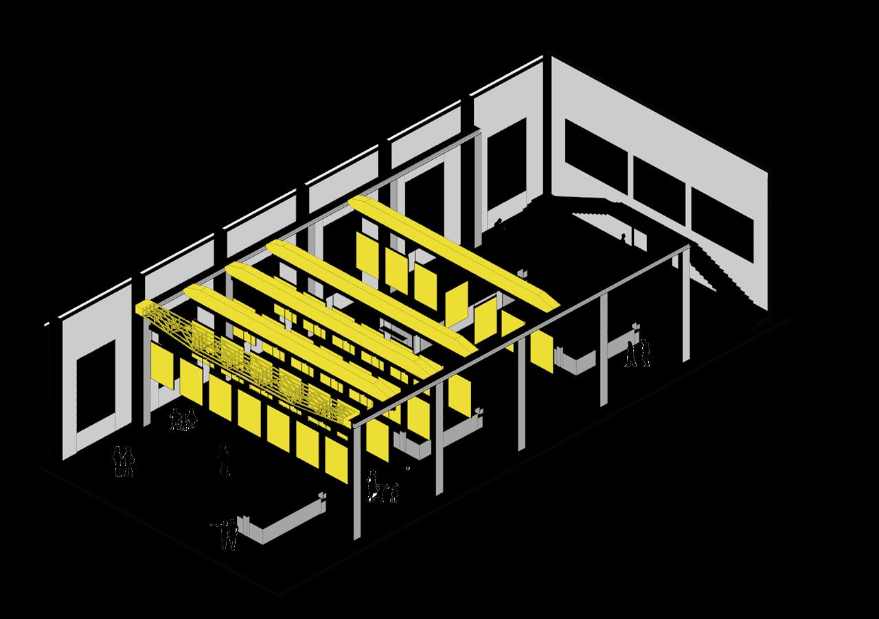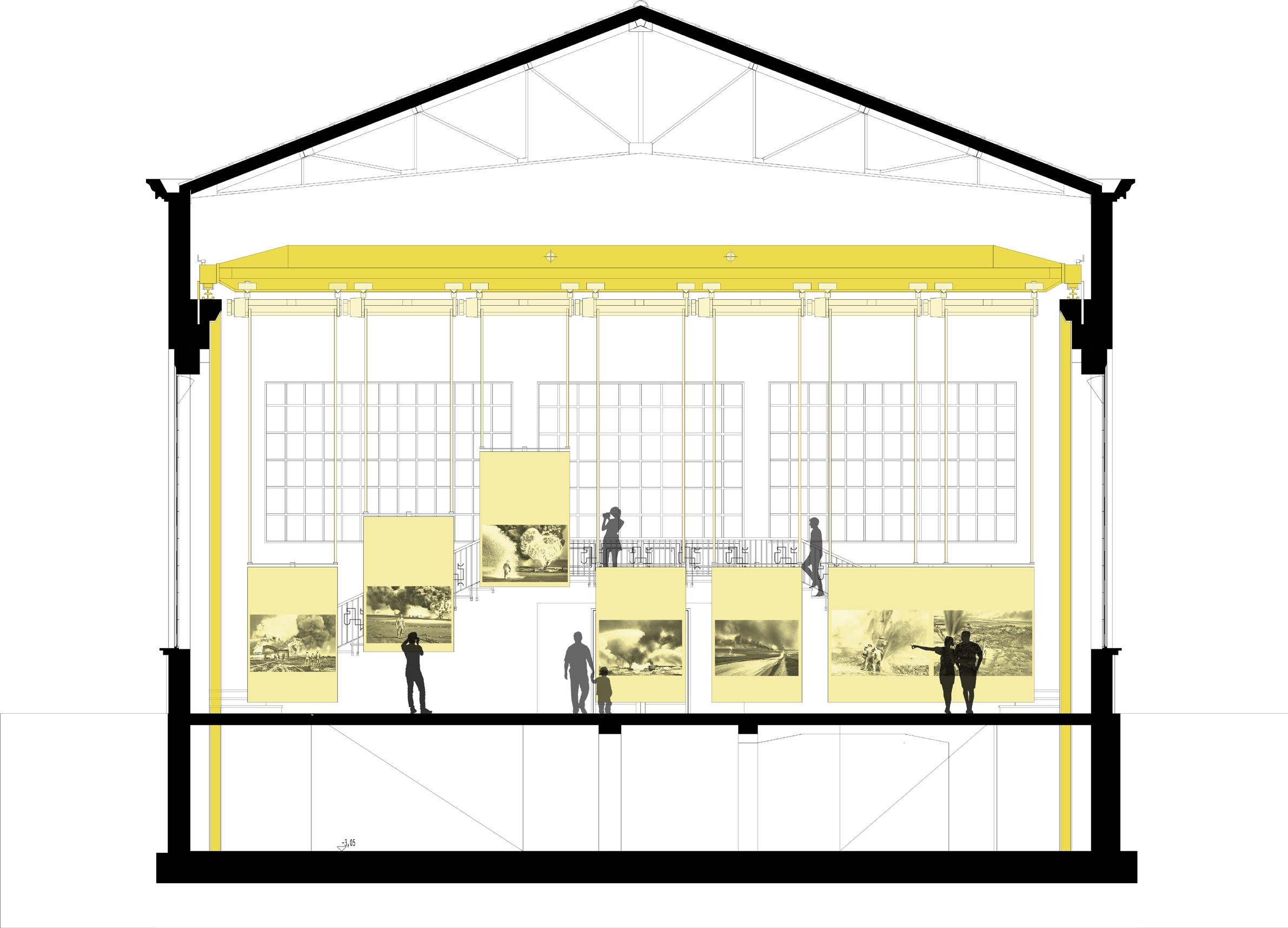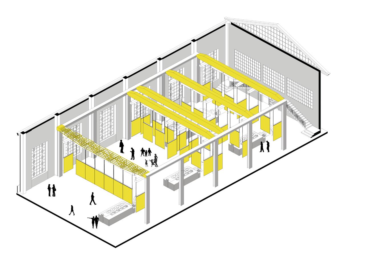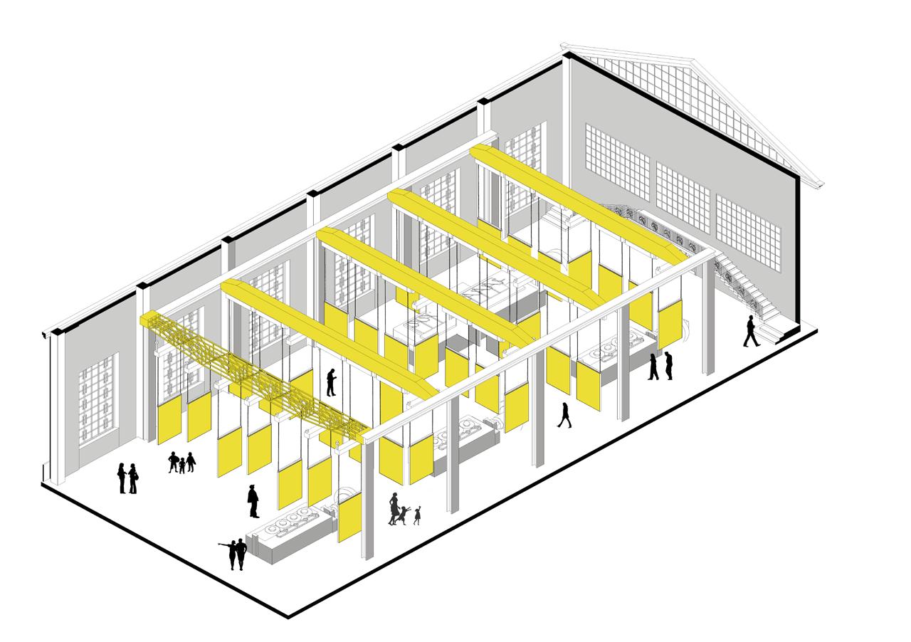 The project rises within the Centrale Termoelettrica designed by Piero Portaluppi, along the river Po. Our vision for the Ecomuseum was that of creating an inclusive space for art and for social gatherings, whilst still communicating the previous identity of the site. The exterior is organized in three zones: the slope leading to the site is used to create an open air auditorium, along the riverside benches provide seating within the vegetation and a small grass path leading the visitor through a series of “industrial machine ruins” belonging to the Impianto Idrovoro, developing across the river just above the Centrale Termica. The use of the carroponte, central element in the intervention, is first seen in the external space where a sequence of 5 fixed bridge cranes frame the main entrance. In the main hall, the fixed pre-existent carroponte is combined with 4 movable new carroponti, distinguished through bright yellow coating, all carrying a series of detachable panels to be used for the exposition of artworks, but also for the subdivision of the main space. The panels can rotate along their central axis and move vertically along the plane thanks to the use of chain hoists giving flexibility to the space.