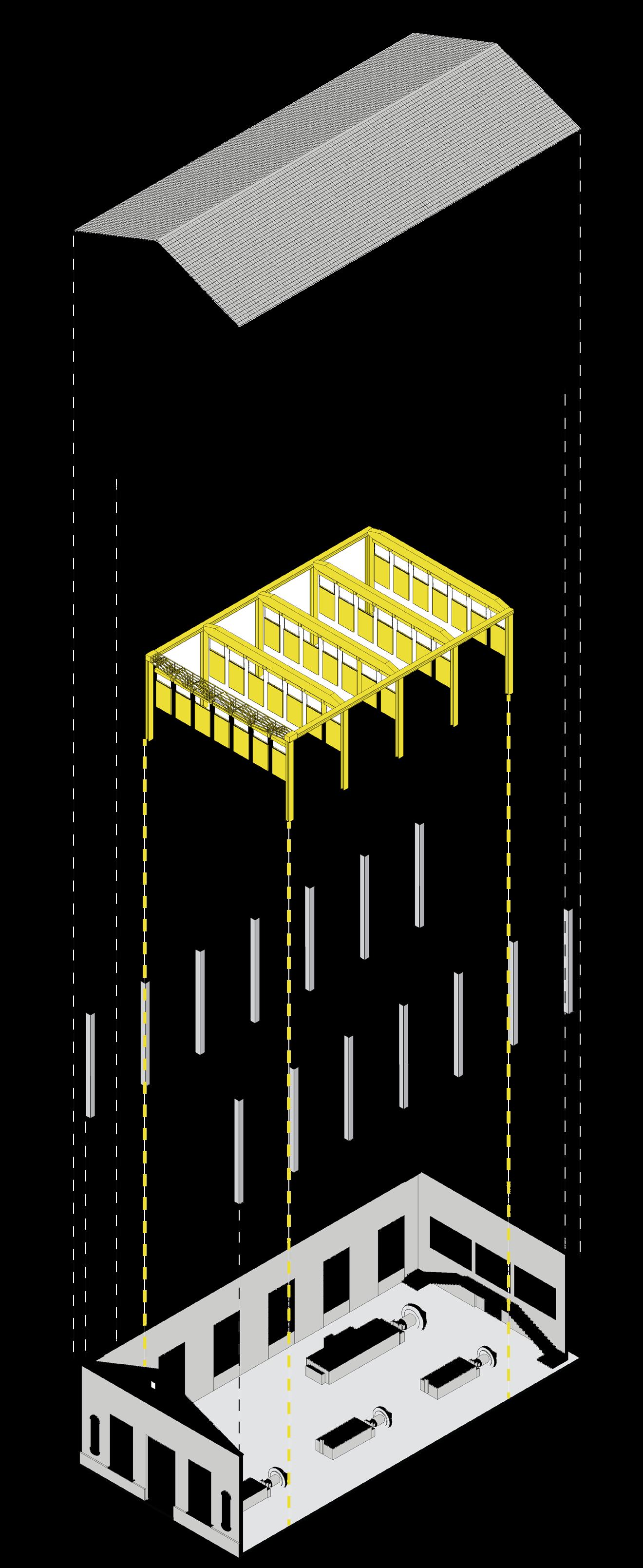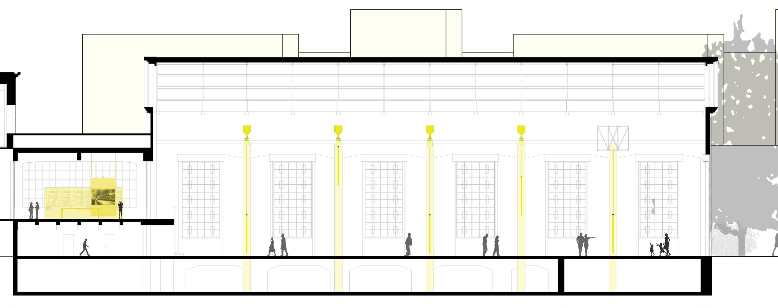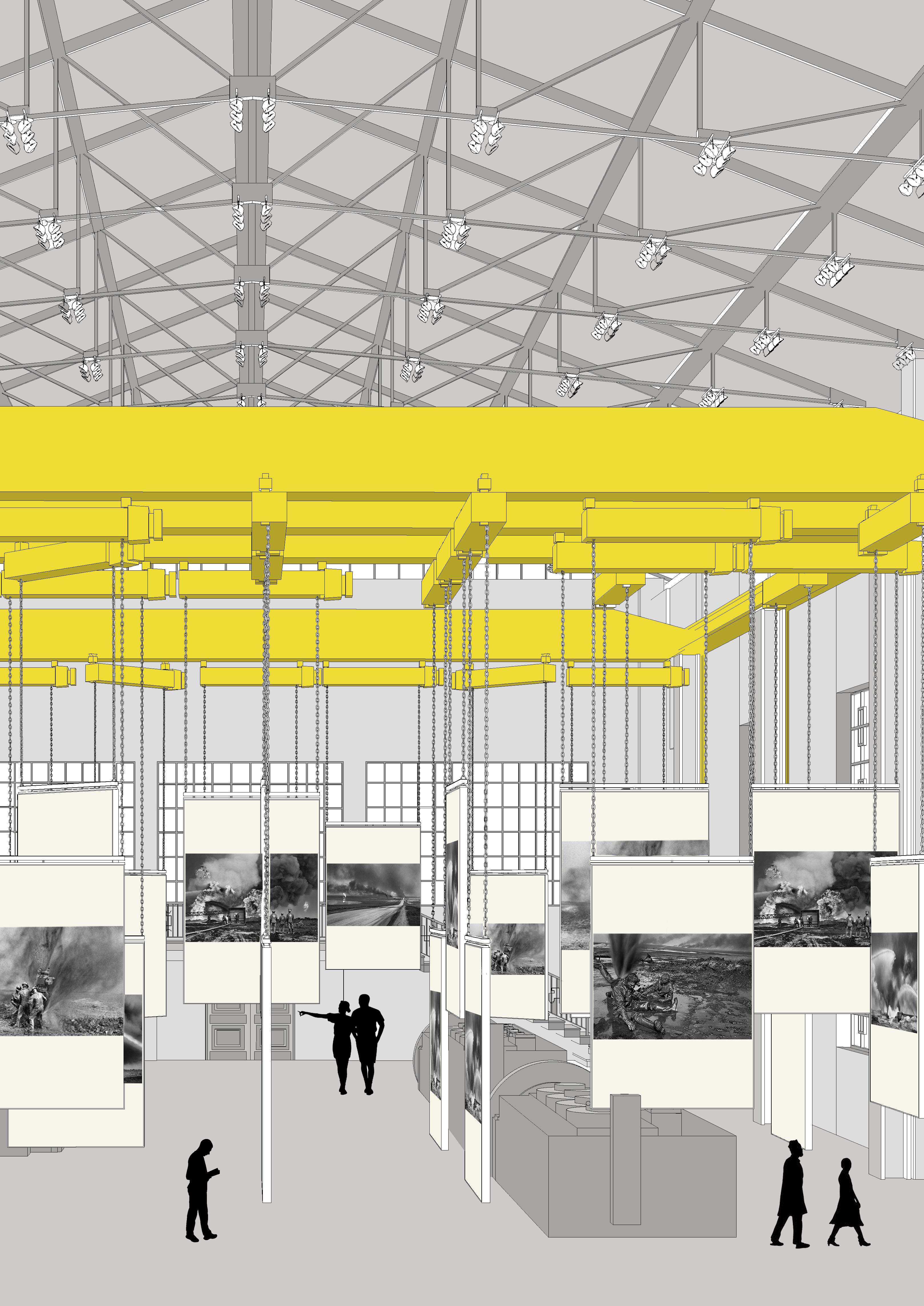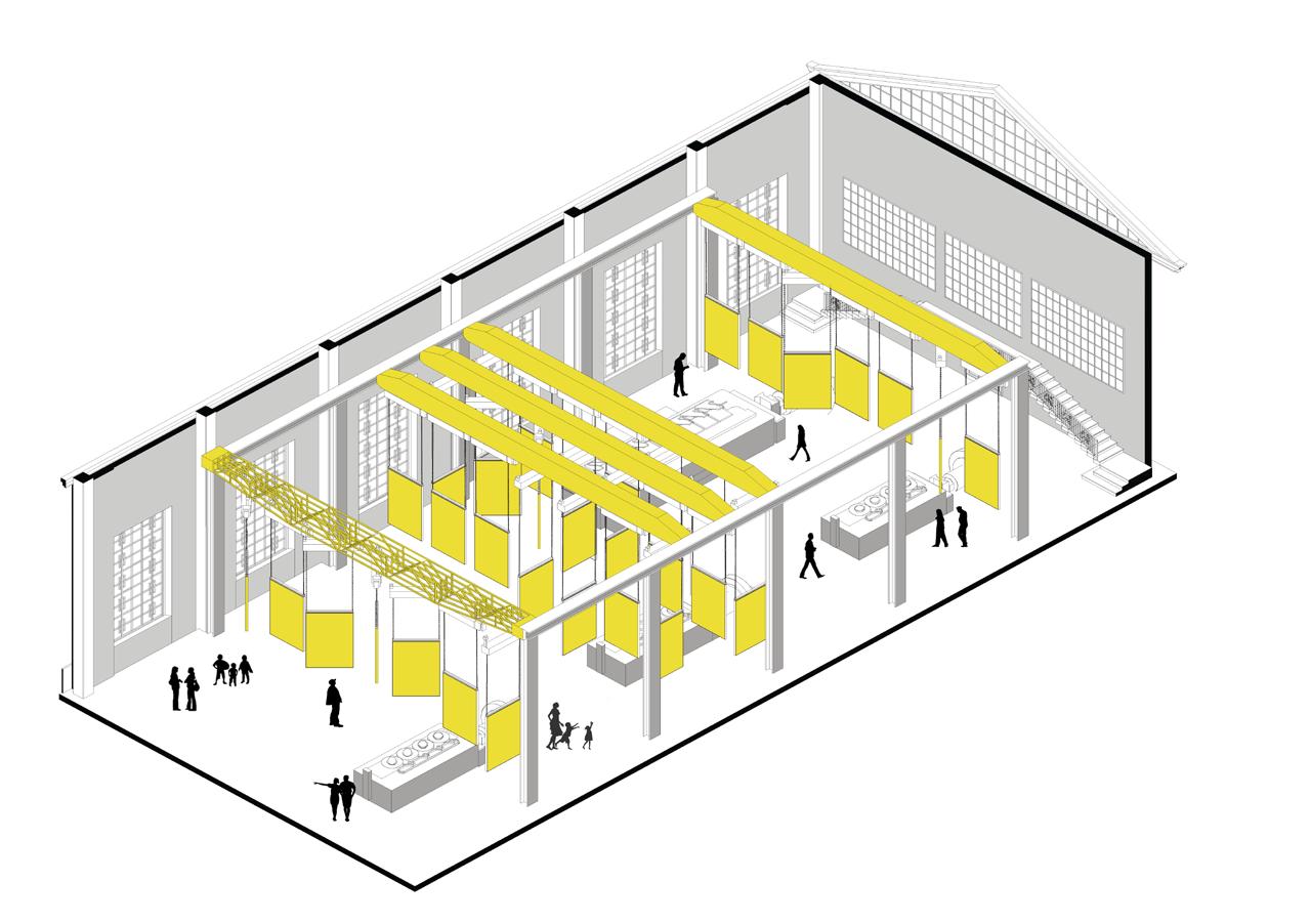 The project rises within the Centrale Termoelettrica designed by Piero Portaluppi, along the river Po. Our vision for the Ecomuseum was that of creating an inclusive space for art and for social gatherings, whilst still communicating the previous identity of the site. The exterior is organized in three zones: the slope leading to the site is used to create an open air auditorium, along the riverside benches provide seating within the vegetation and a small grass path leading the visitor through a series of “industrial machine ruins” belonging to the Impianto Idrovoro, developing across the river just above the Centrale Termica. The use of the carroponte, central element in the intervention, is first seen in the external space where a sequence of 5 fixed bridge cranes frame the main entrance. In the main hall, the fixed pre-existent carroponte is combined with 4 movable new carroponti, distinguished through bright yellow coating, all carrying a series of detachable panels to be used for the exposition of artworks, but also for the subdivision of the main space. The panels can rotate along their central axis and move vertically along the plane thanks to the use of chain hoists giving flexibility to the space.