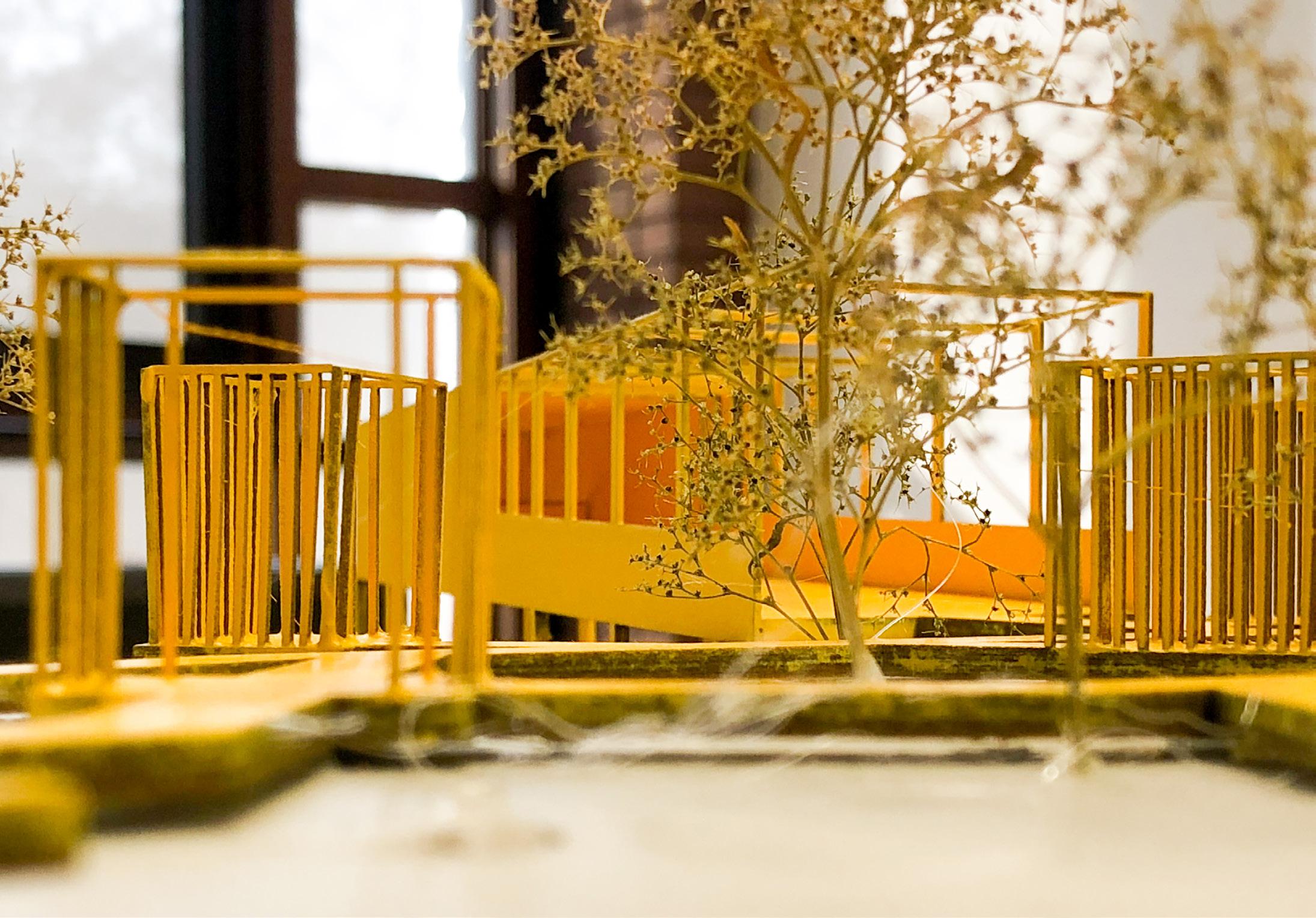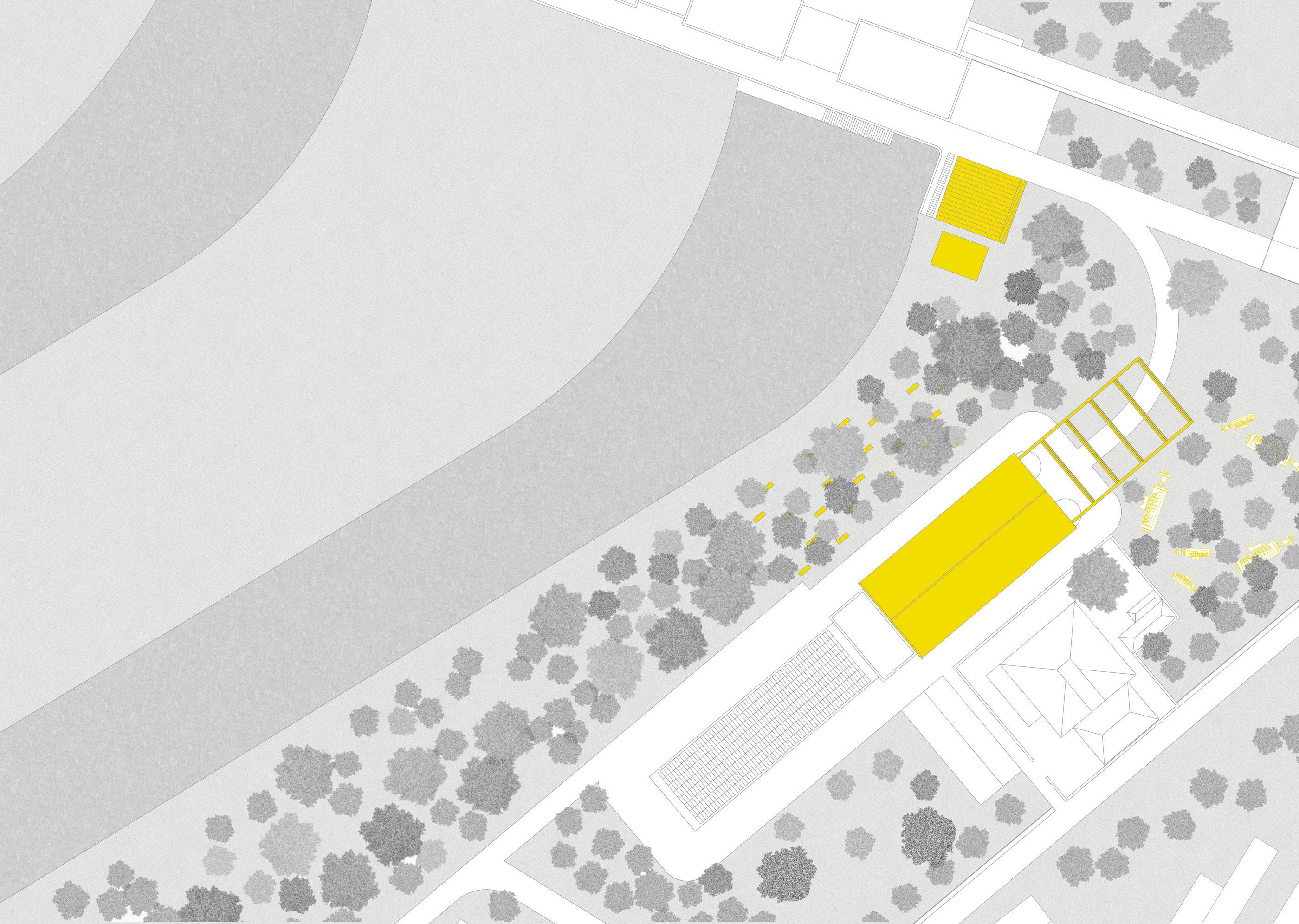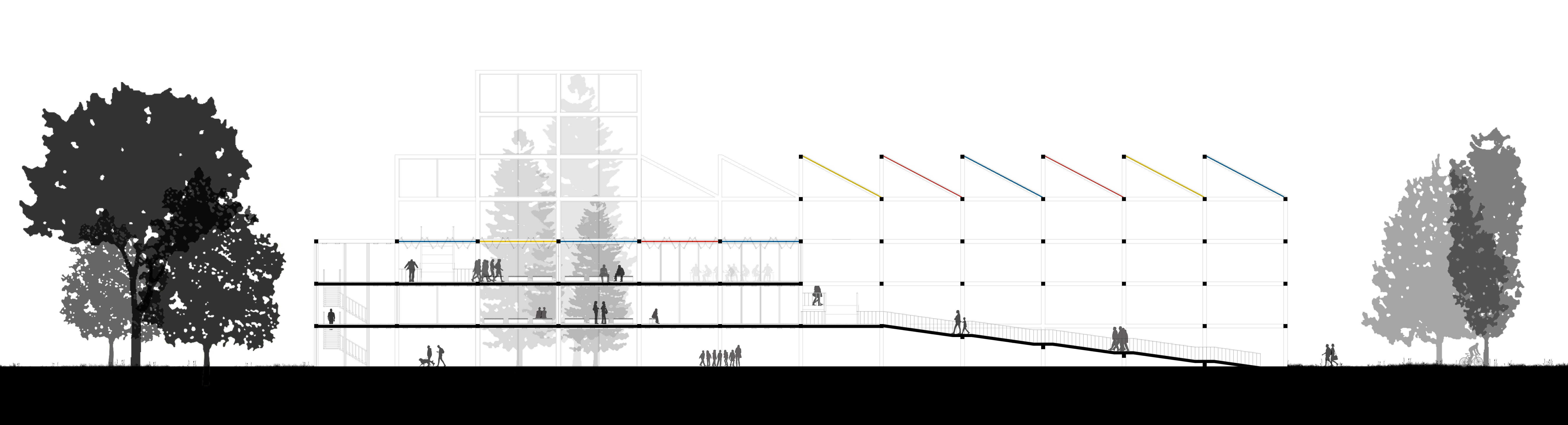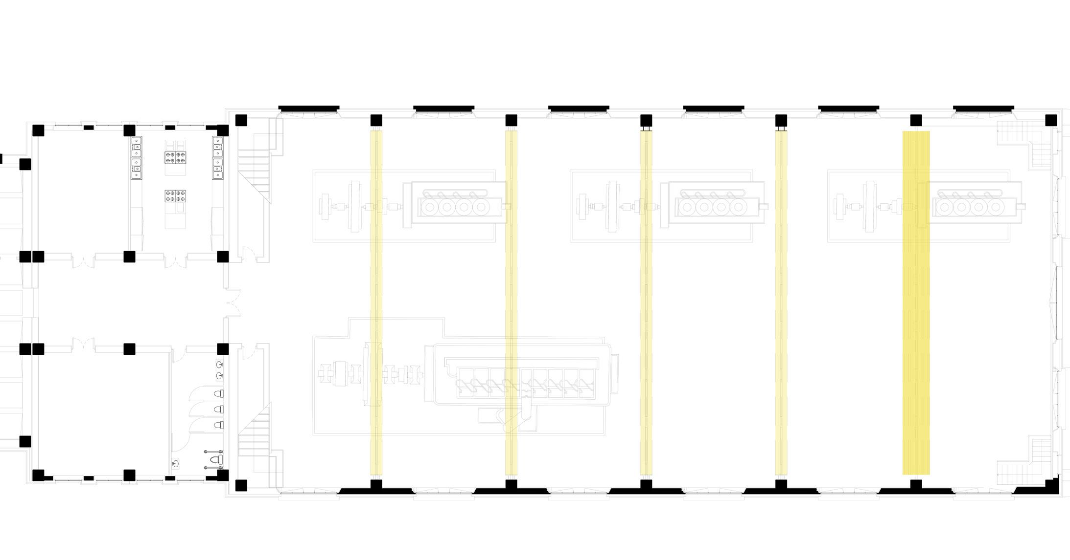 The project rises within the Centrale Termoelettrica designed by Piero Portaluppi, along the river Po. Our vision for the Ecomuseum was that of creating an inclusive space for art and for social gatherings, whilst still communicating the previous identity of the site. The exterior is organized in three zones: the slope leading to the site is used to create an open air auditorium, along the riverside benches provide seating within the vegetation and a small grass path leading the visitor through a series of “industrial machine ruins” belonging to the Impianto Idrovoro, developing across the river just above the Centrale Termica. The use of the carroponte, central element in the intervention, is first seen in the external space where a sequence of 5 fixed bridge cranes frame the main entrance. In the main hall, the fixed pre-existent carroponte is combined with 4 movable new carroponti, distinguished through bright yellow coating, all carrying a series of detachable panels to be used for the exposition of artworks, but also for the subdivision of the main space. The panels can rotate along their central axis and move vertically along the plane thanks to the use of chain hoists giving flexibility to the space.
