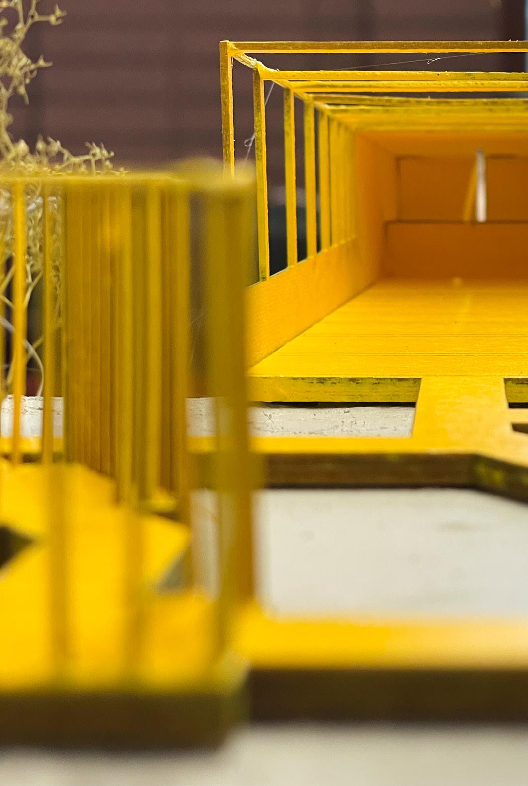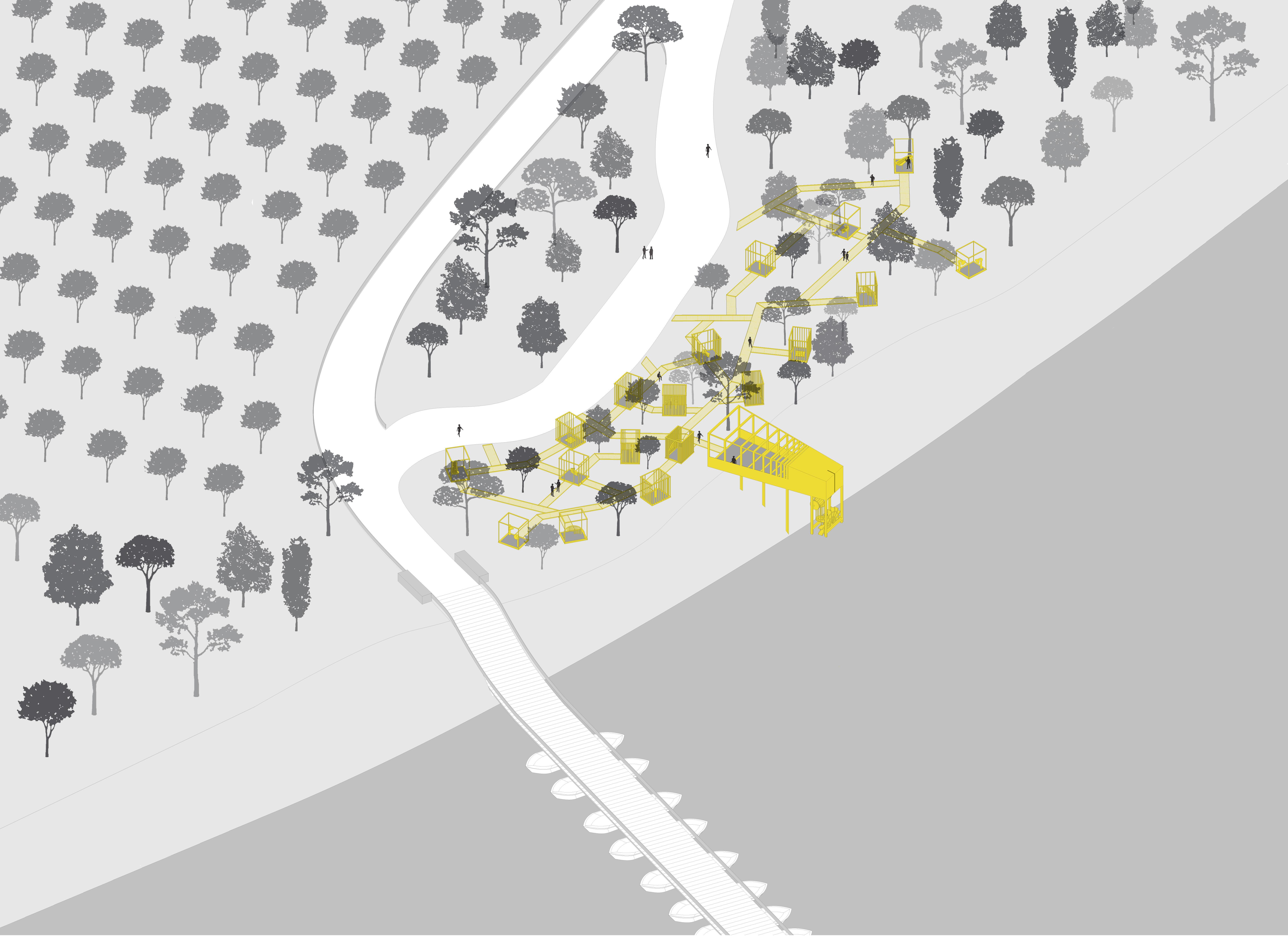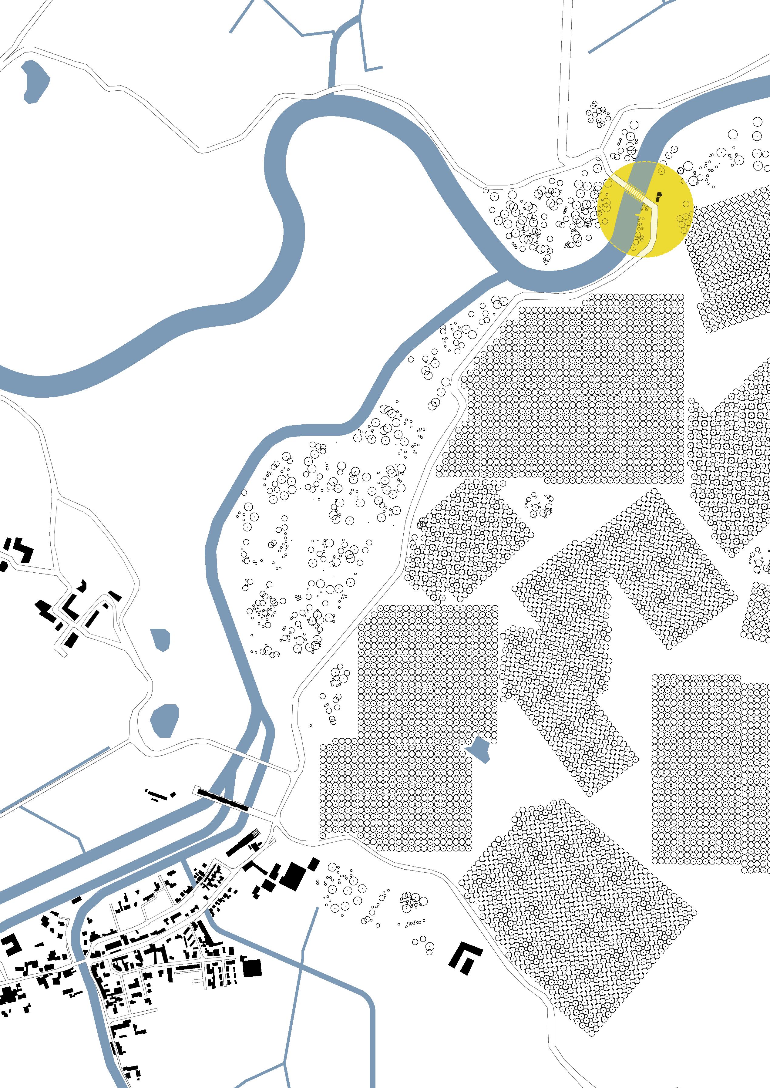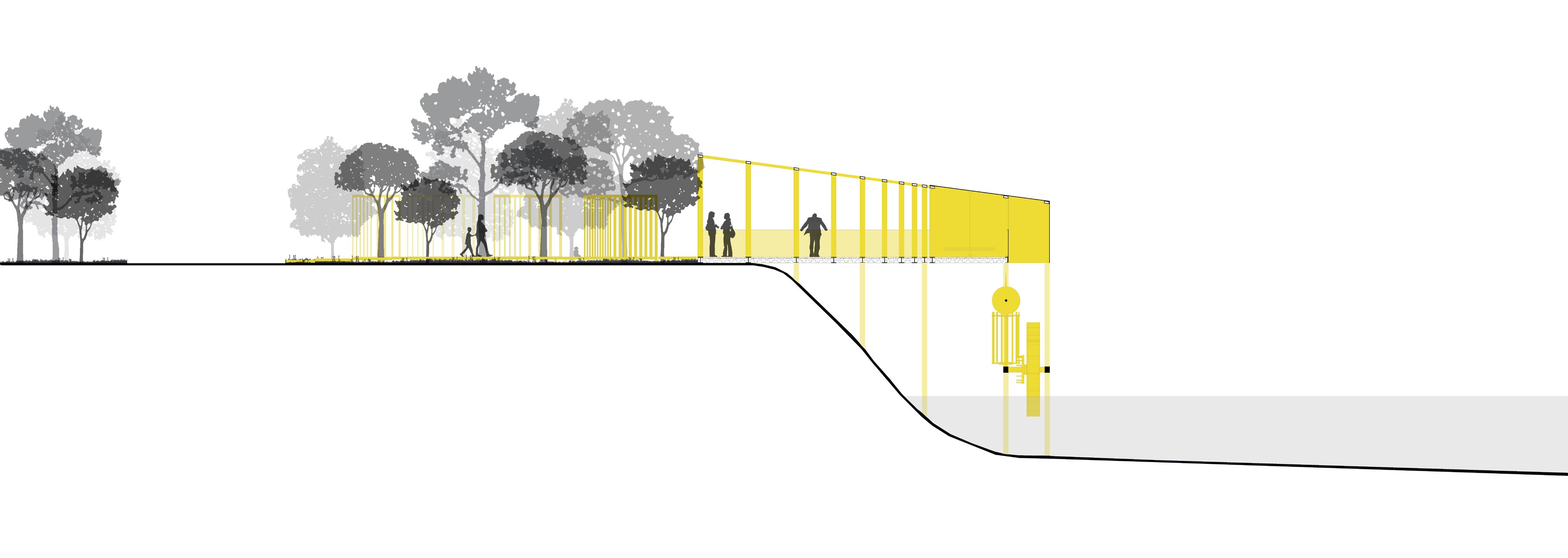 The acoustic and visual landscape is at the core of our pavilion design. Instead of viewing the noise of the boat bridge as an obstacle a sound pavilion and sound garden was designed to complement and enhance the heritage represented by the boat bridge. Sound and the colour yellow, the visual queue for all our interventions, dominate the site. The main pavilion expands onto the water, suspended above the river much like the temporary fishermen’s houses scattered along the Oglio river. A vertical slit becomes the only keyhole to the external landscape, and invites the visitor to look downwards, where a system much like that of a watermill gives voice to the river. The site surrounding the main pavilion becomes, through cubicle structures, each with their individual instrument, a sound garden and playground where visitors can contribute to the acoustic landscape in an experience which looks to briefly merge “musician” and environment.