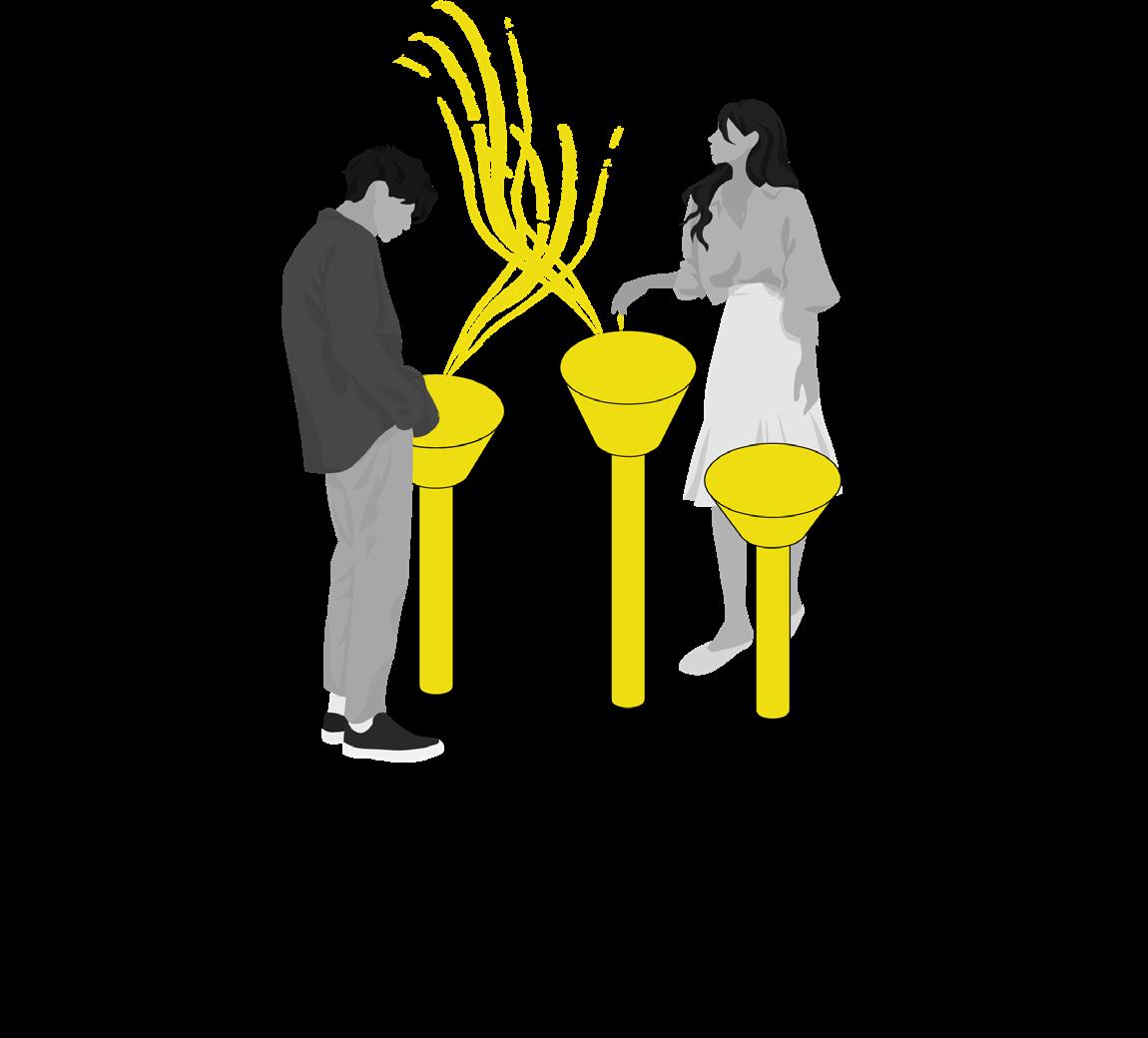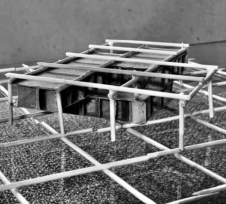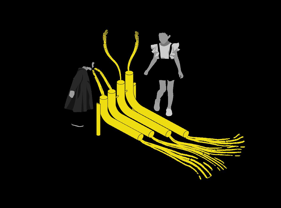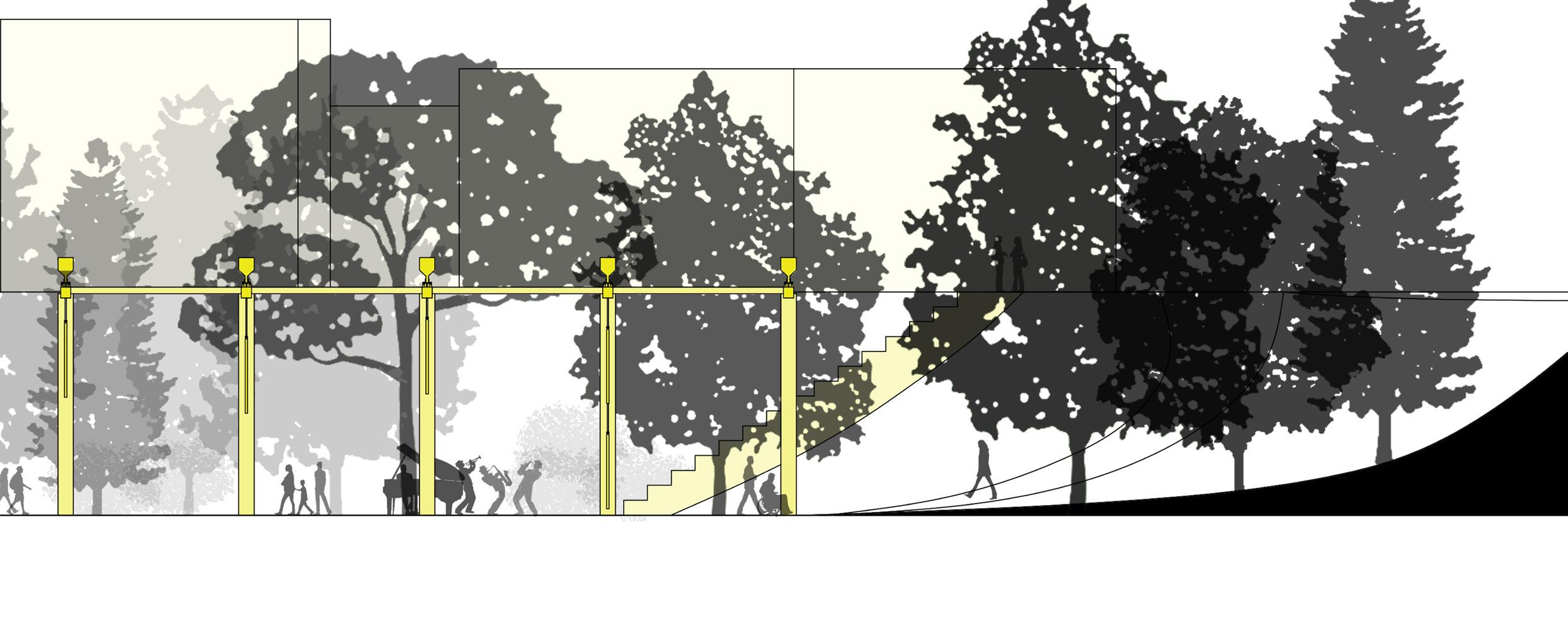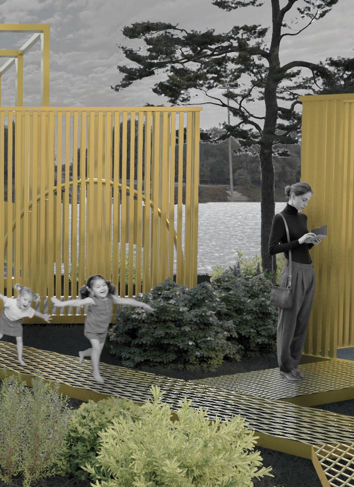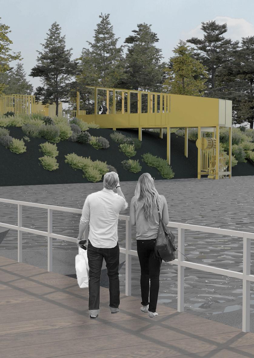 The acoustic and visual landscape is at the core of our pavilion design. Instead of viewing the noise of the boat bridge as an obstacle a sound pavilion and sound garden was designed to complement and enhance the heritage represented by the boat bridge. Sound and the colour yellow, the visual queue for all our interventions, dominate the site. The main pavilion expands onto the water, suspended above the river much like the temporary fishermen’s houses scattered along the Oglio river. A vertical slit becomes the only keyhole to the external landscape, and invites the visitor to look downwards, where a system much like that of a watermill gives voice to the river. The site surrounding the main pavilion becomes, through cubicle structures, each with their individual instrument, a sound garden and playground where visitors can contribute to the acoustic landscape in an experience which looks to briefly merge “musician” and environment.