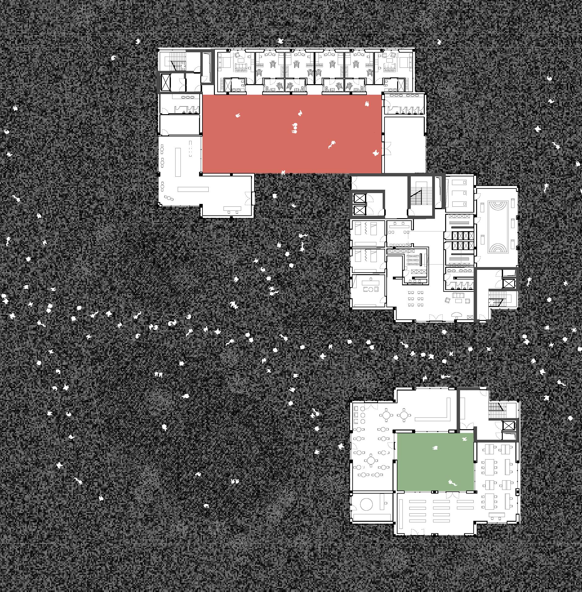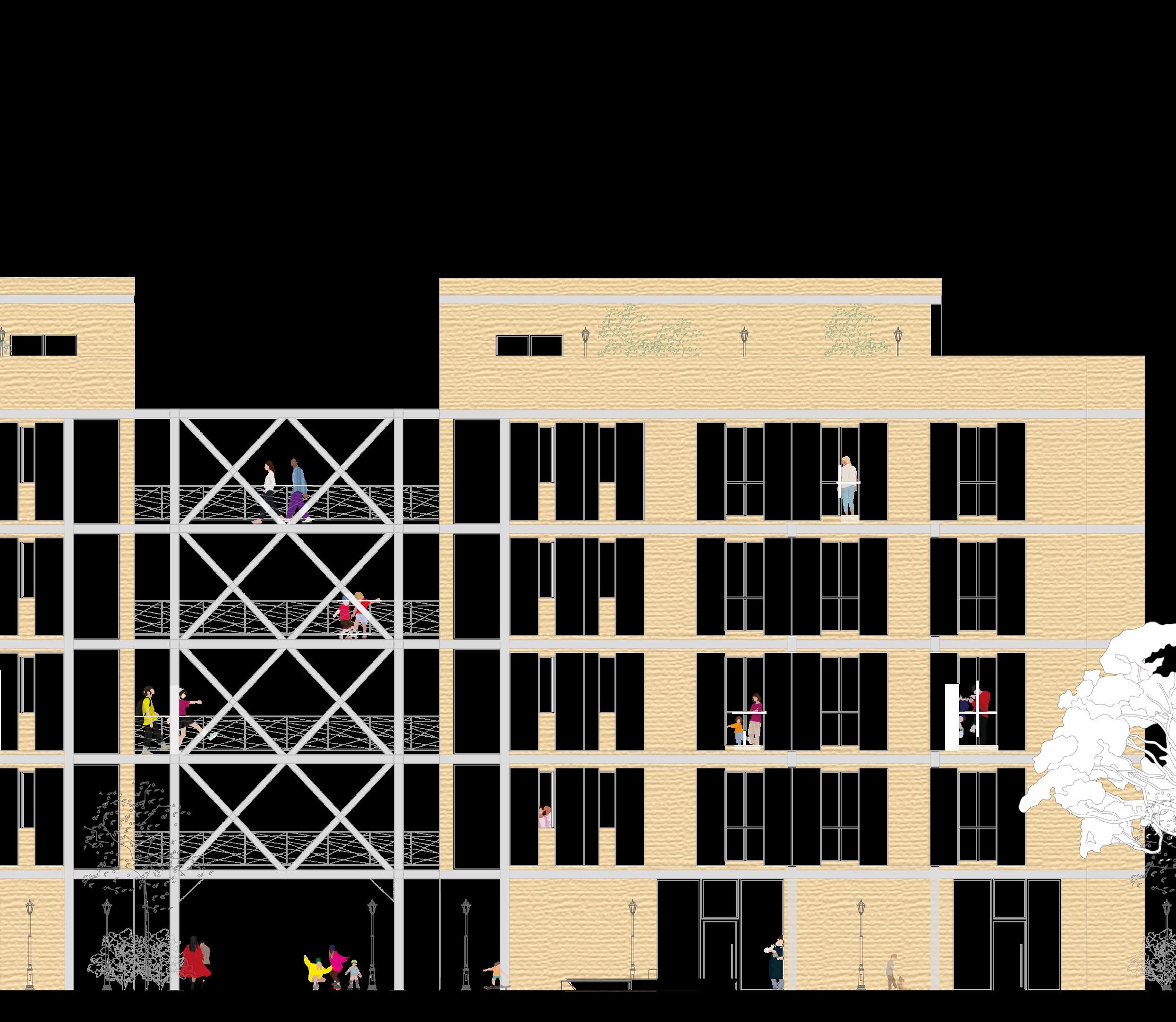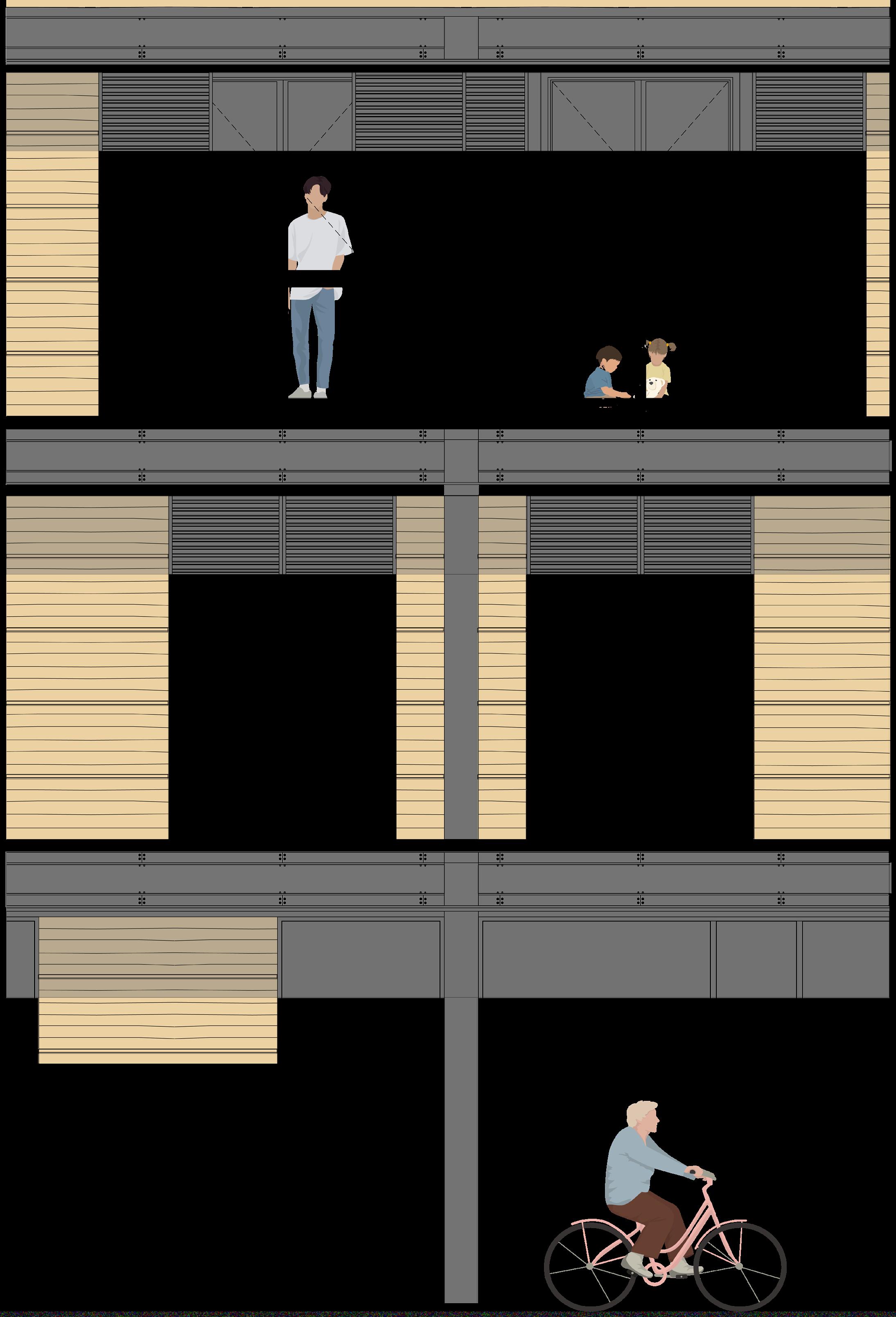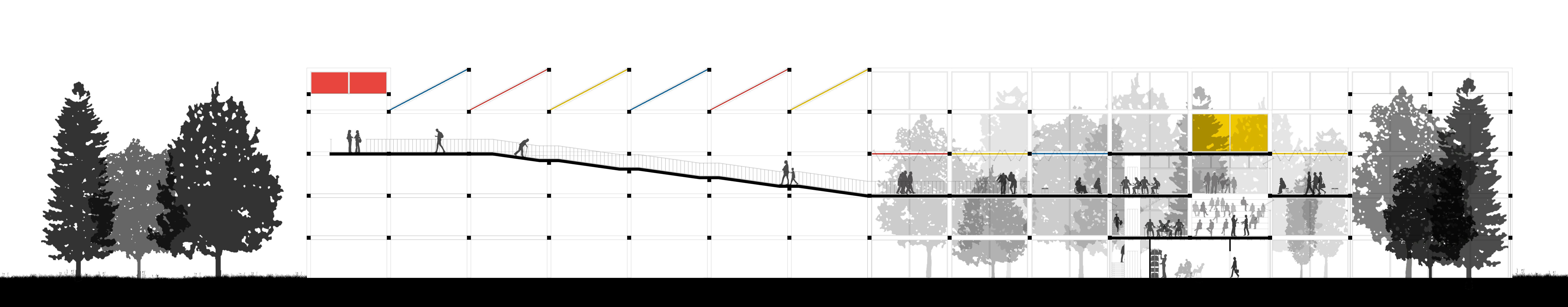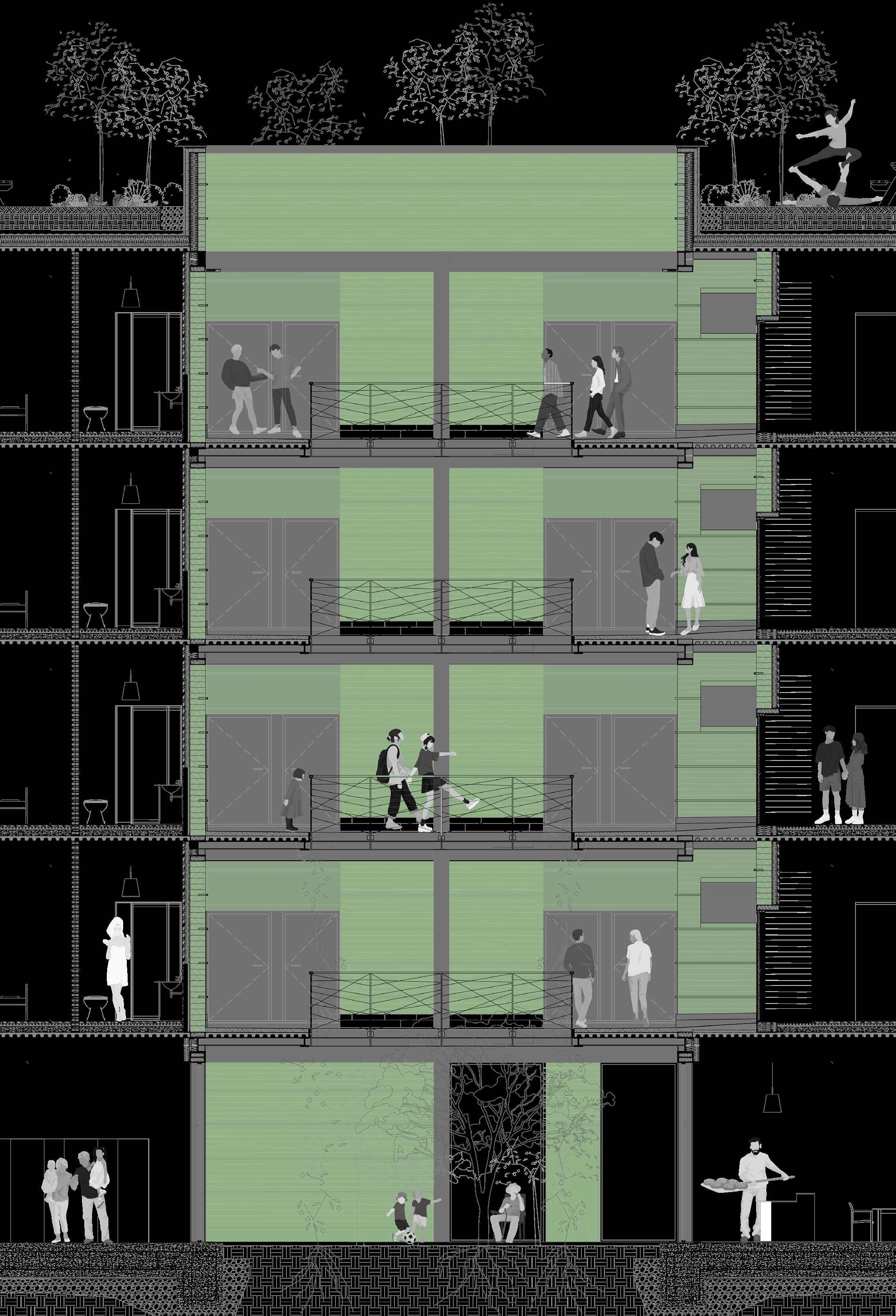 Milan is set to host the 2026 Winter Olympics: for the event the “Scalo Romano” railway junction will become site of the Olympic Village, transformed after 2026 into a student residence. The project concentrates on a part of the large plot, developing three residential buildings with public functions on the glazed ground floor open to a portion of the Olympic Piazza. The Milanese “Casa a Ringhiera” typology was selected for its intrinsic qualities of both privacy and community building with the idea that athletes and, in a second moment students, would collect in the central courtyards. Each residential floor is characterized by different room typologies, with corners fitting vertical connections and a shared kitchen. In the exterior, a sliding shading system was developed to create a dynamic facade controlled by the inhabitants themselves. The materiality was equally important in defining the project. The use of rammed earth, with its insulative properties, opened the possibility of using coloured pigment to define the three different cores (red, blue and green) reinforced with specific choice of vegetation for each, while its natural colour was left in all facades.