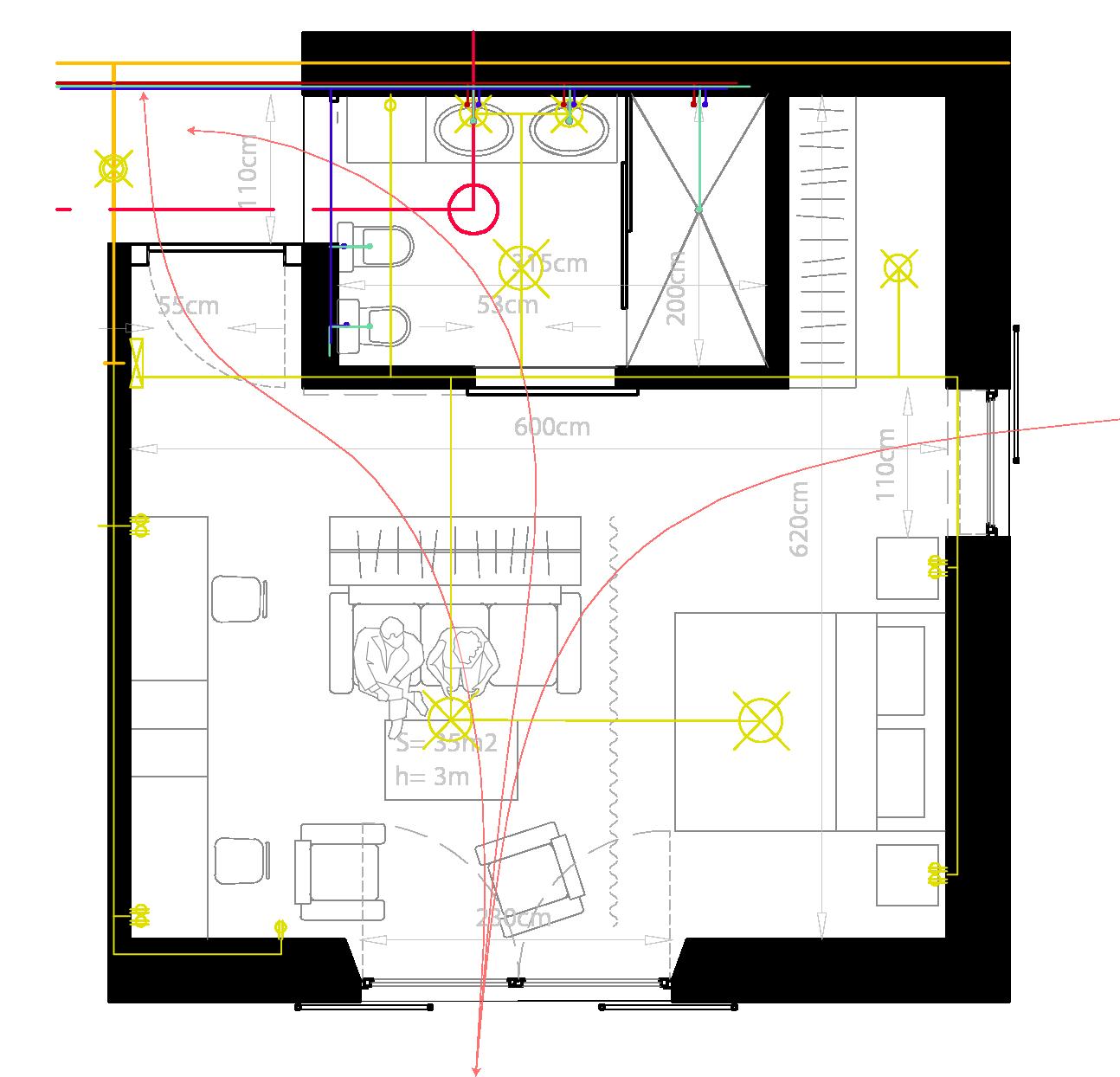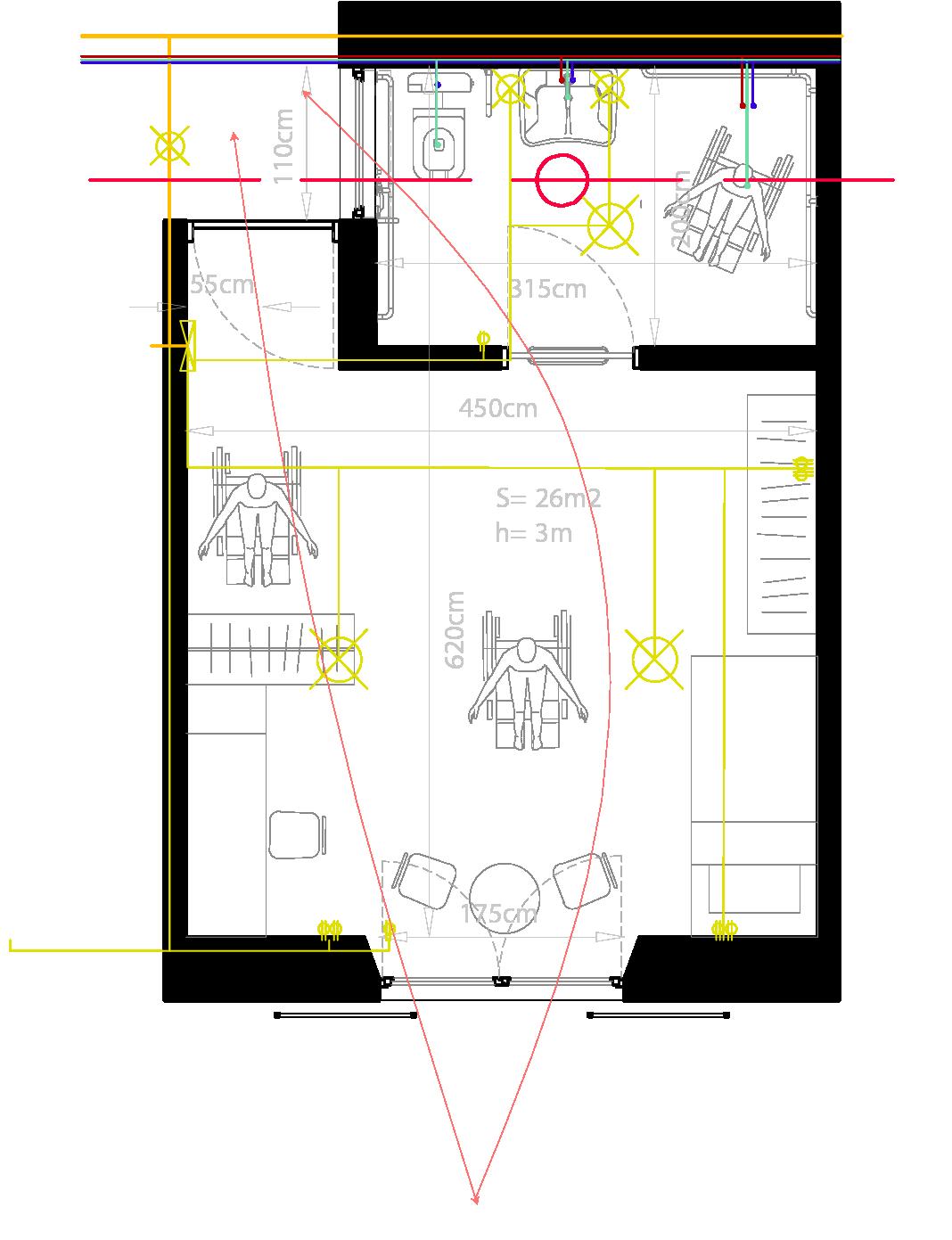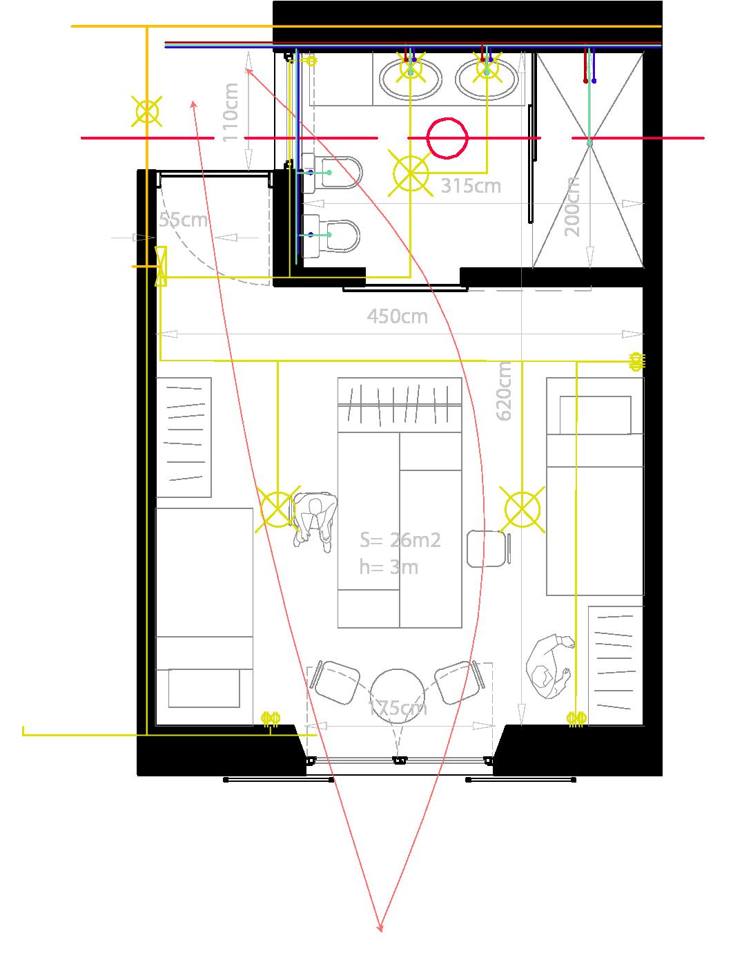 opposite: Floor Plans of Room Types with electrical, ventilation and water systems