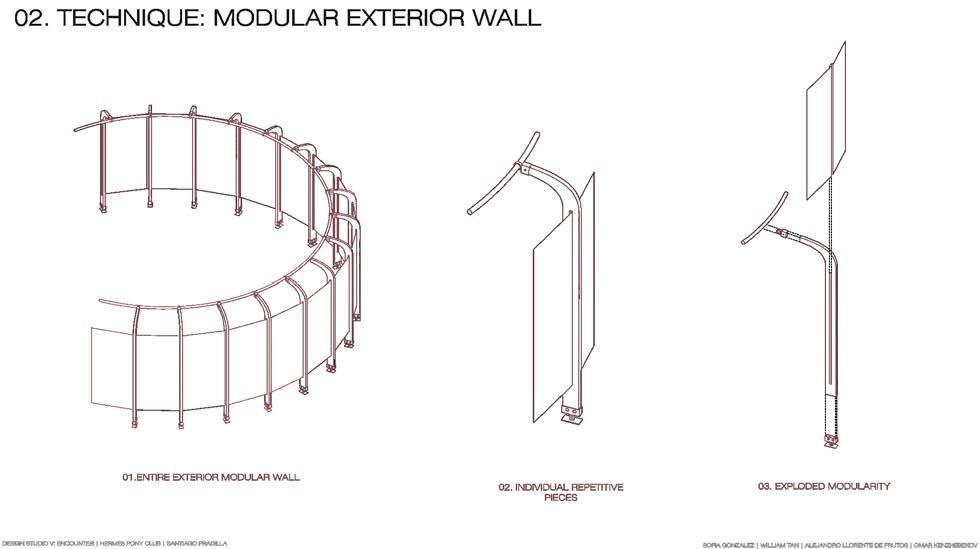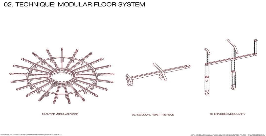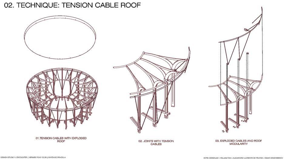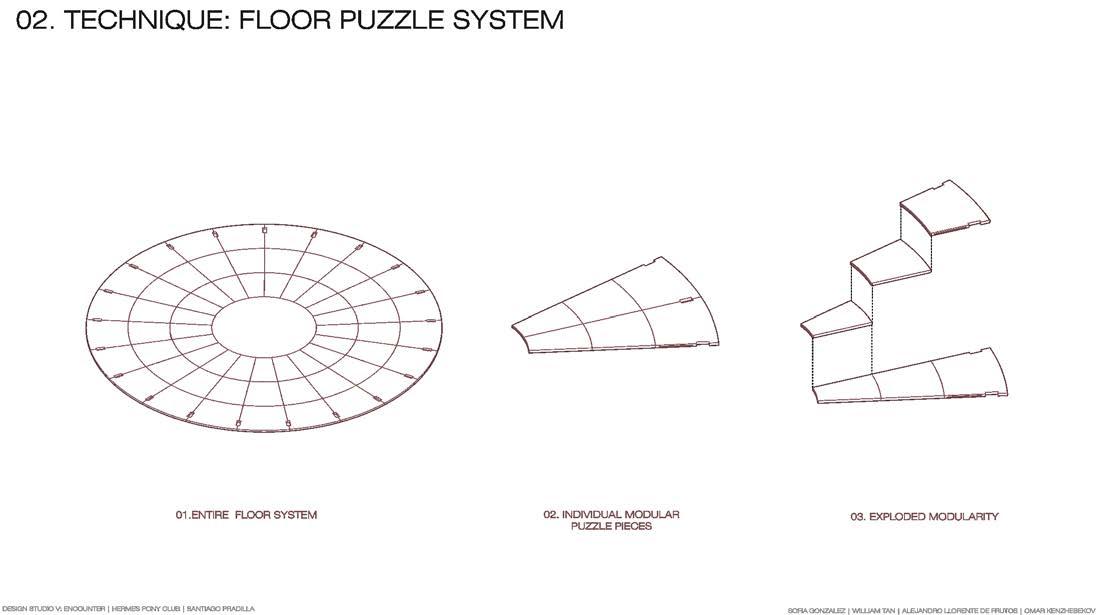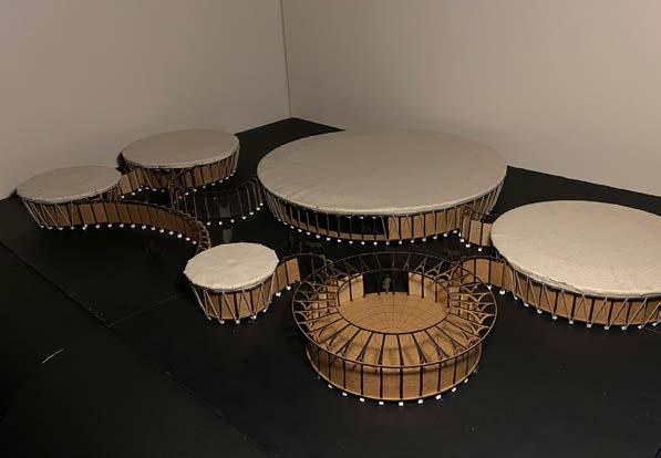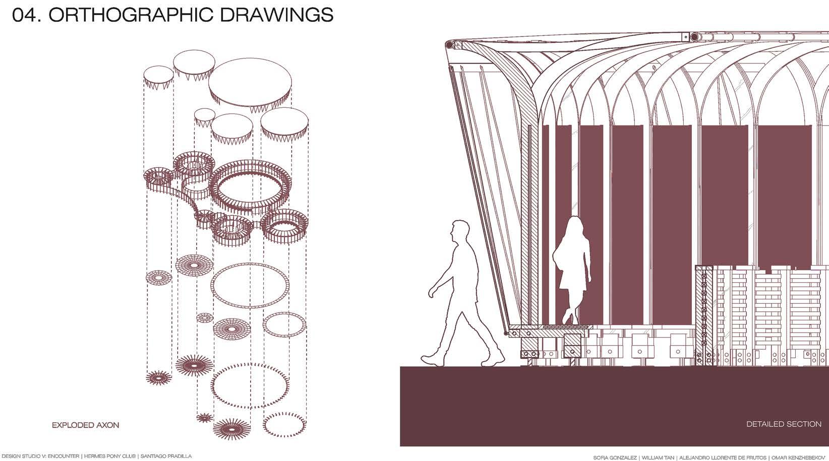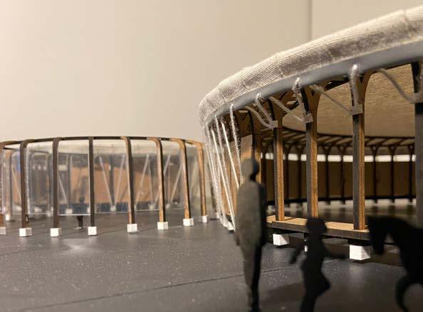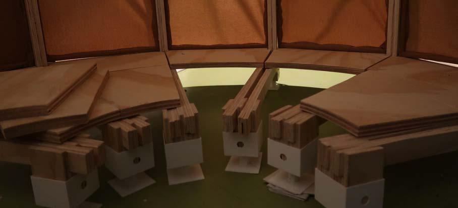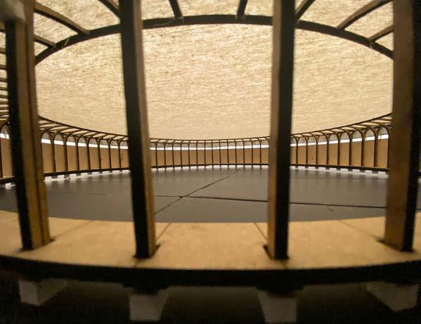 To better explain our project, we created step-by-step axonometric diagrams showing how the structure and materials fit together. Each element, like the cloth roof, leather-wrapped foam, CLT columns, metal rings, rope, leather walls, and wooden puzzle floor, was carefully detailed. This helped show how the materials work together and how the structure can be assembled.