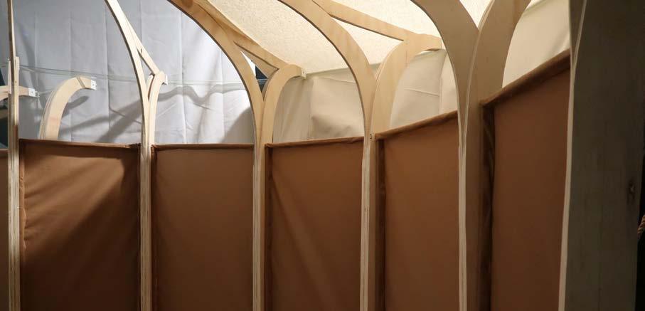 The structure is built with a cloth roof, foam wrapped with leather, metal rings, rope, leather walls, CLT columns, and a wooden puzzle floor supported by a wooden substructure. These materials create a crafted yet impermanent architecture that engages its environment without permanence.