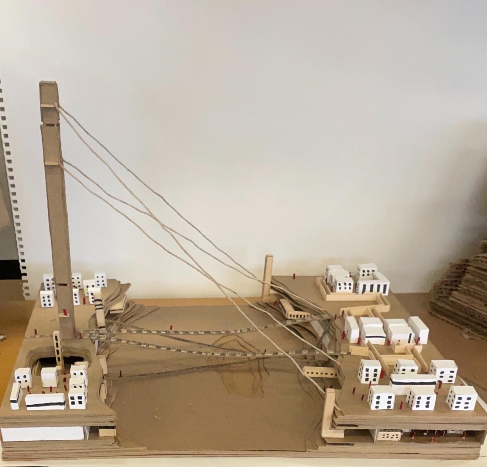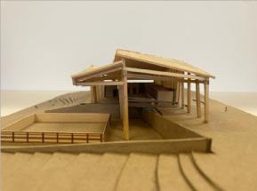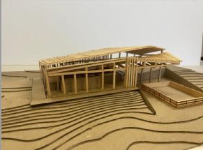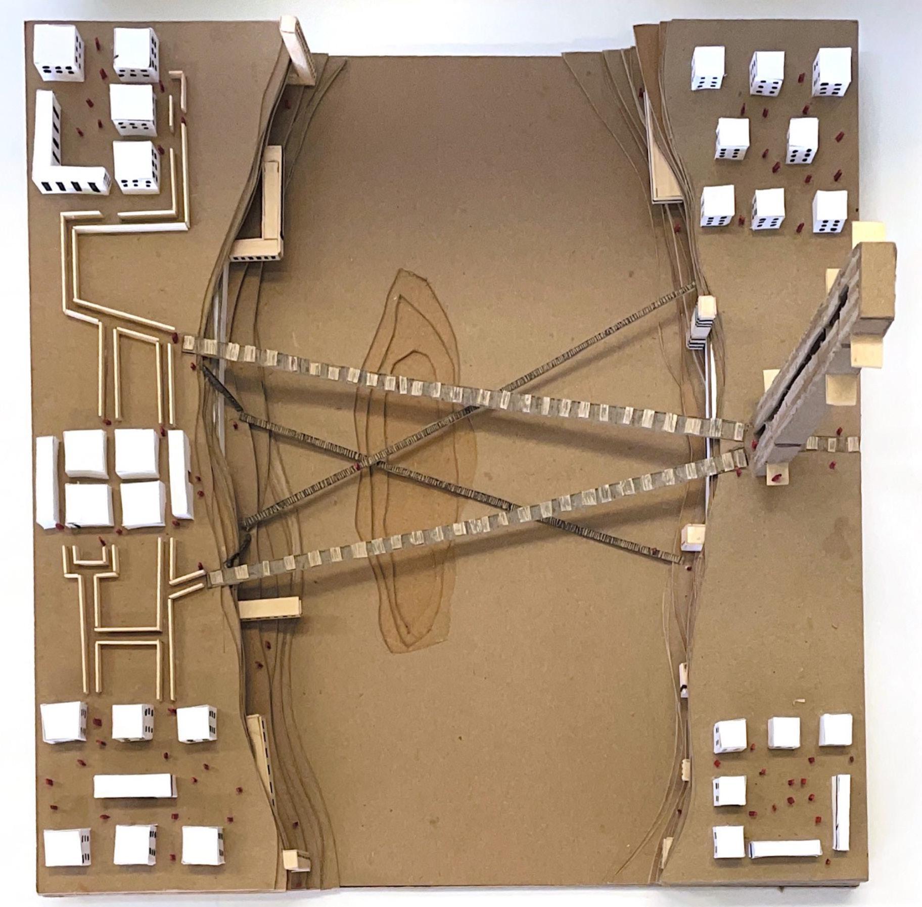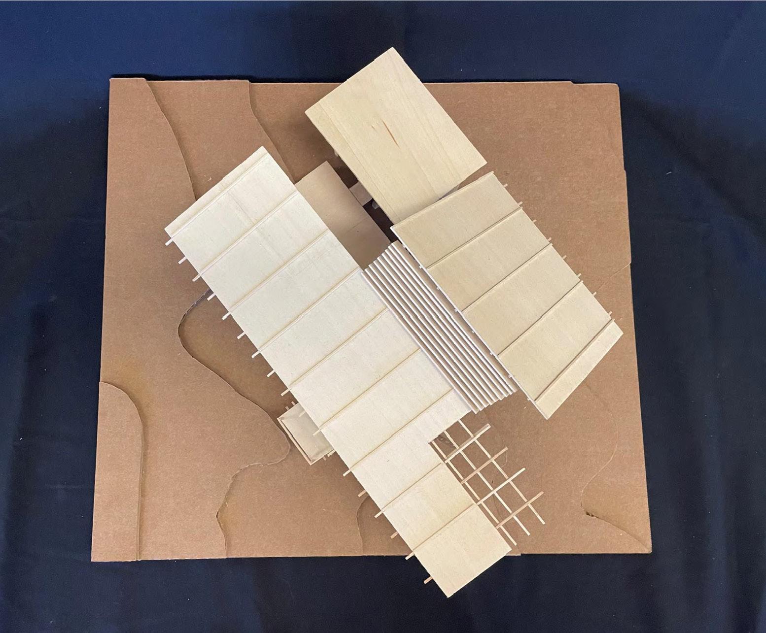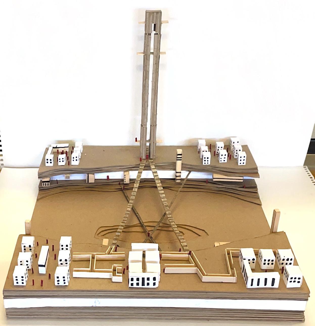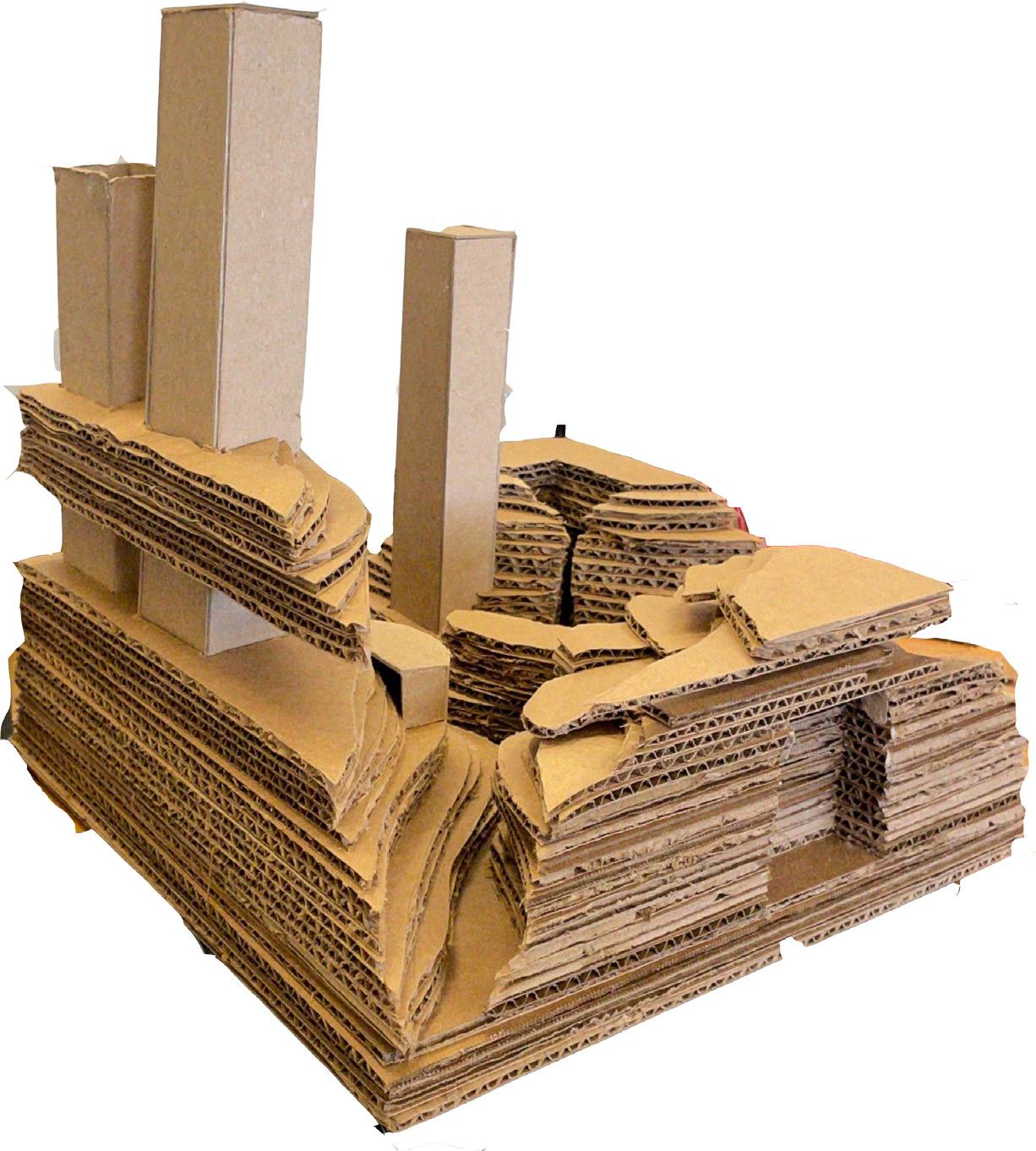 Using carboard, I expiremented with the ideas of buildings being embedded and nestled into the landscape. The main entrance to the city serves as a datum and ties the landscape together.