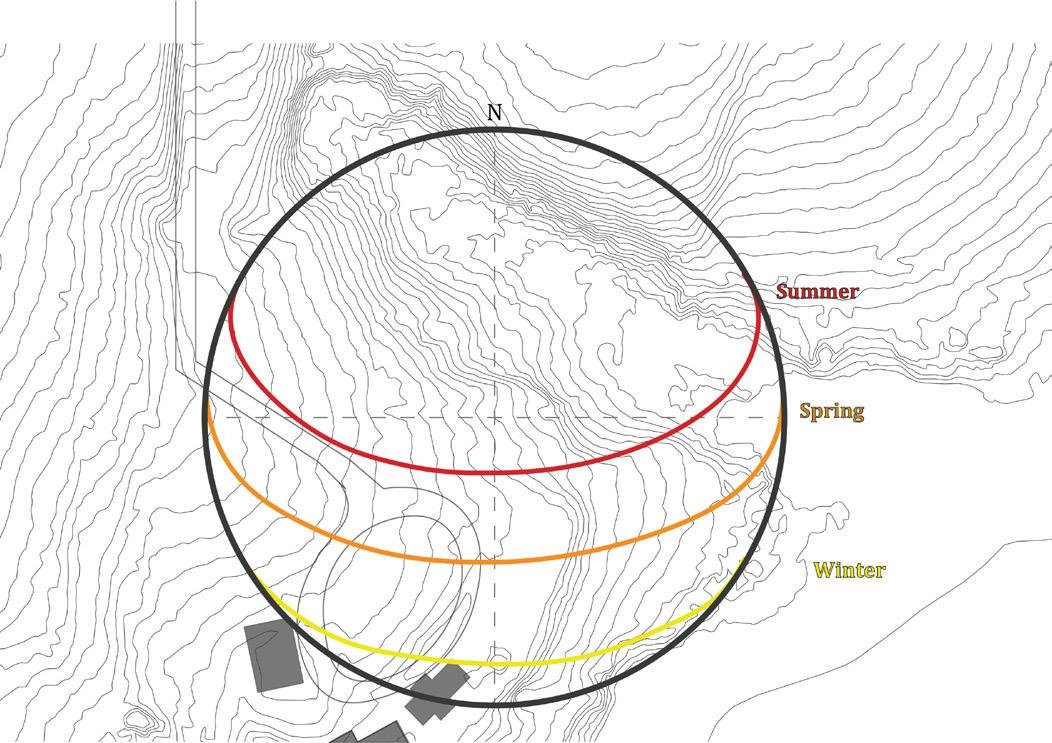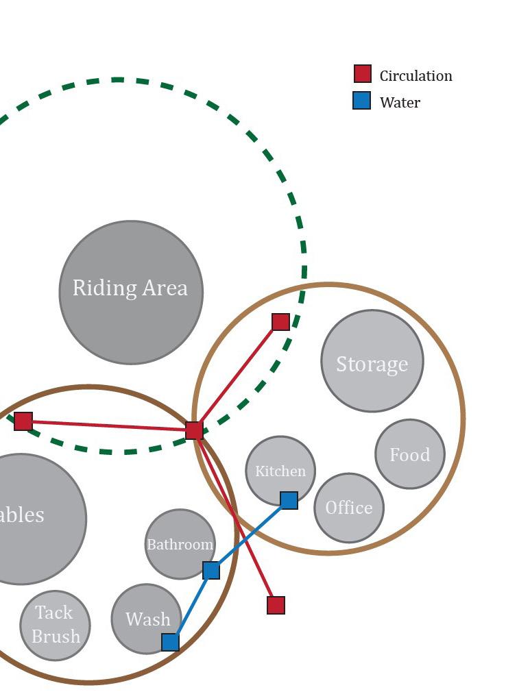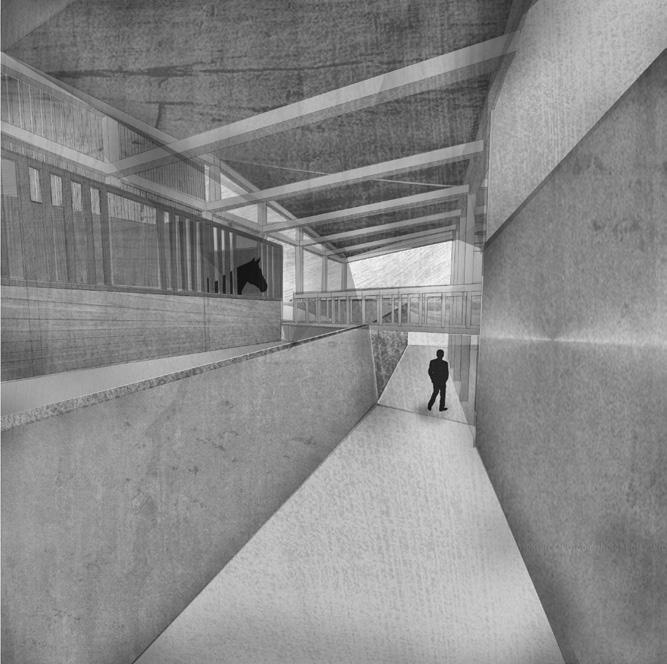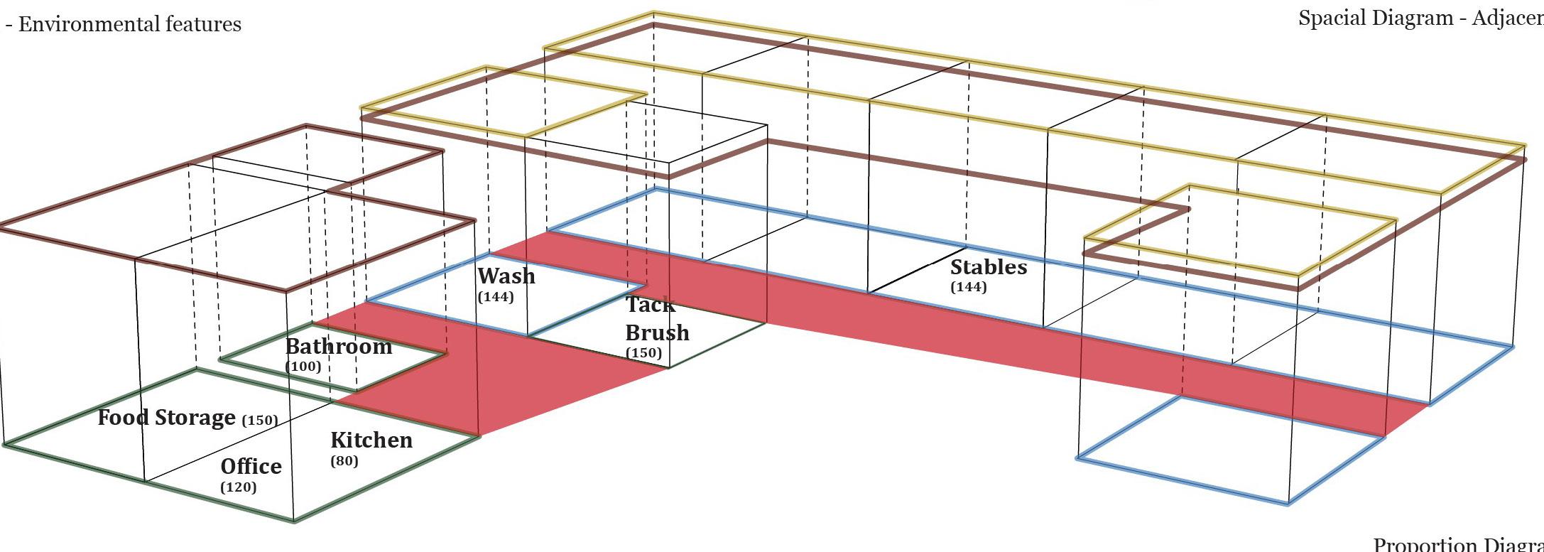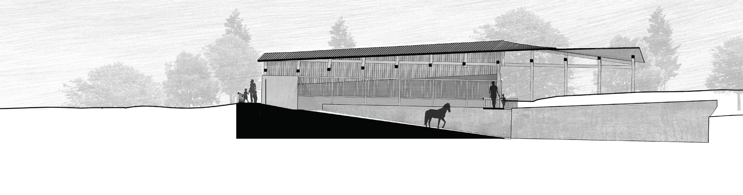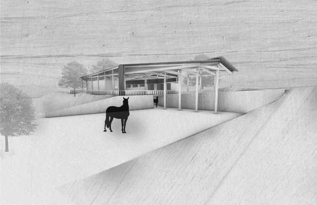 The horse space and human space is divided by a cement wall that meets with a glass panel. The human space is higher creating a moment where the people can observe the horses, nature, and riders all at once. The visitors and riders enter on an elevated walkway that creates a resting point where they can observe everything at once. The path leads into the reception and then around to the stables. The horses and riders then go down a ramp that runs underneath the elevated viewing point.