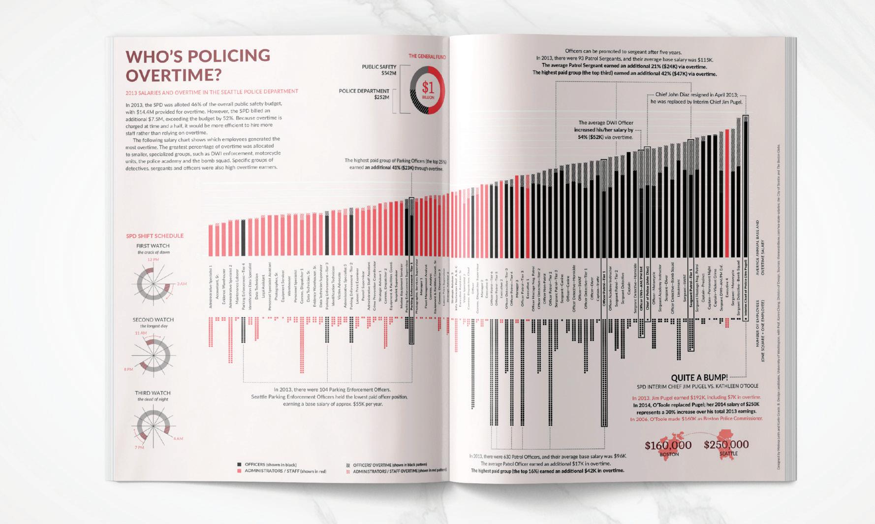 It was in Karen Chengs's data visualization class when I first fell in love with information design. With a partner I created this info graphic on policing overtime, it was basically data to better understand where the money is going within the police force.