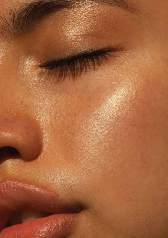 UN PRODUCTO DE ILUMINADOR LÍQUIDO EN TONOS DORADOS (TAMBIÉN A LO LARGO DE LA NARIZ Y EL ARCO DE CUPIDO).