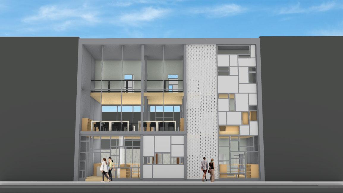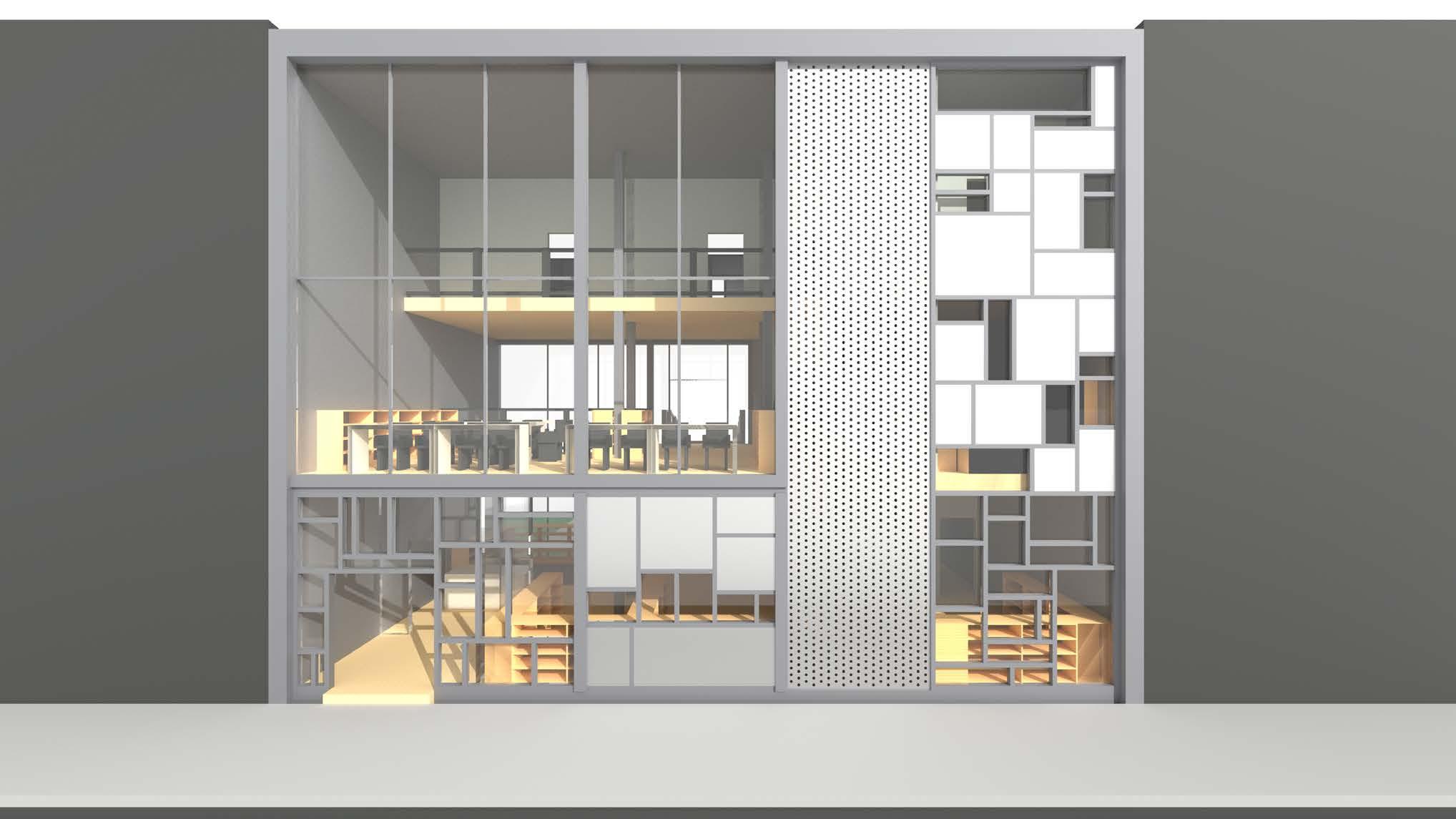 With a consideration for vertical and open space, this urban bookstore incorporates double height ceilings along either face of the building. To compliment, a square column grid is implemented and, in certain areas, are doubled to accentuate a grander space. This parallel relationship creates a partition to separate public and private spaces. A mondriaan design influences the exterior facade to also imply particular levels of privacy.