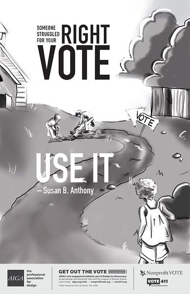 For project three I decided to utilize a quote by Susan B. Anthony and expand upon it with a visual that didn’t describe the quote exactly. After experiment ing with a handful of concepts in my thumbnails I landed on a mix between two. I wanted to use the idea of two individuals paving a path for someone on their way to vote and having historical figures in the piece. So I illustrated both Fredrick Douglas and Susan B. Anthony paving a path for a young girl in the foreground. At this point in the process I have yet to develop the full illustration, what I have now is just the sketch. I plan on elevating the overall