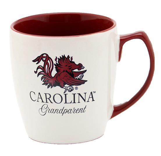 White and garnet colored mug with a gamecock and text reading, “Carolina Grandparent.” The word Carolina is a top the word Grandparent and both words are below the illustration of the gamecock. The inside, bottom and handle of the mug are garnet while the body is white. The exterior of the mug’s walls are slightly curved but still proportional. The handle occupies a large portion of the side and is easy to hold.