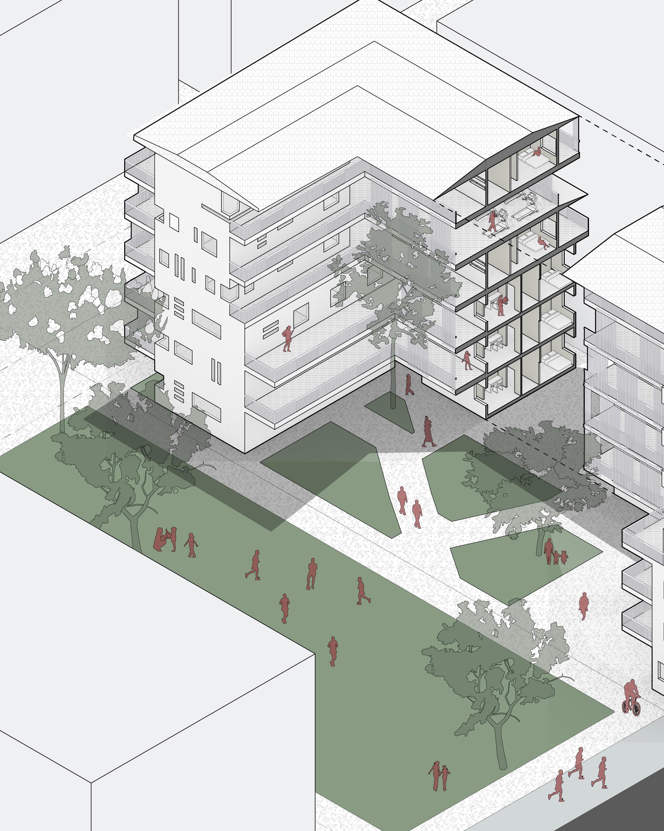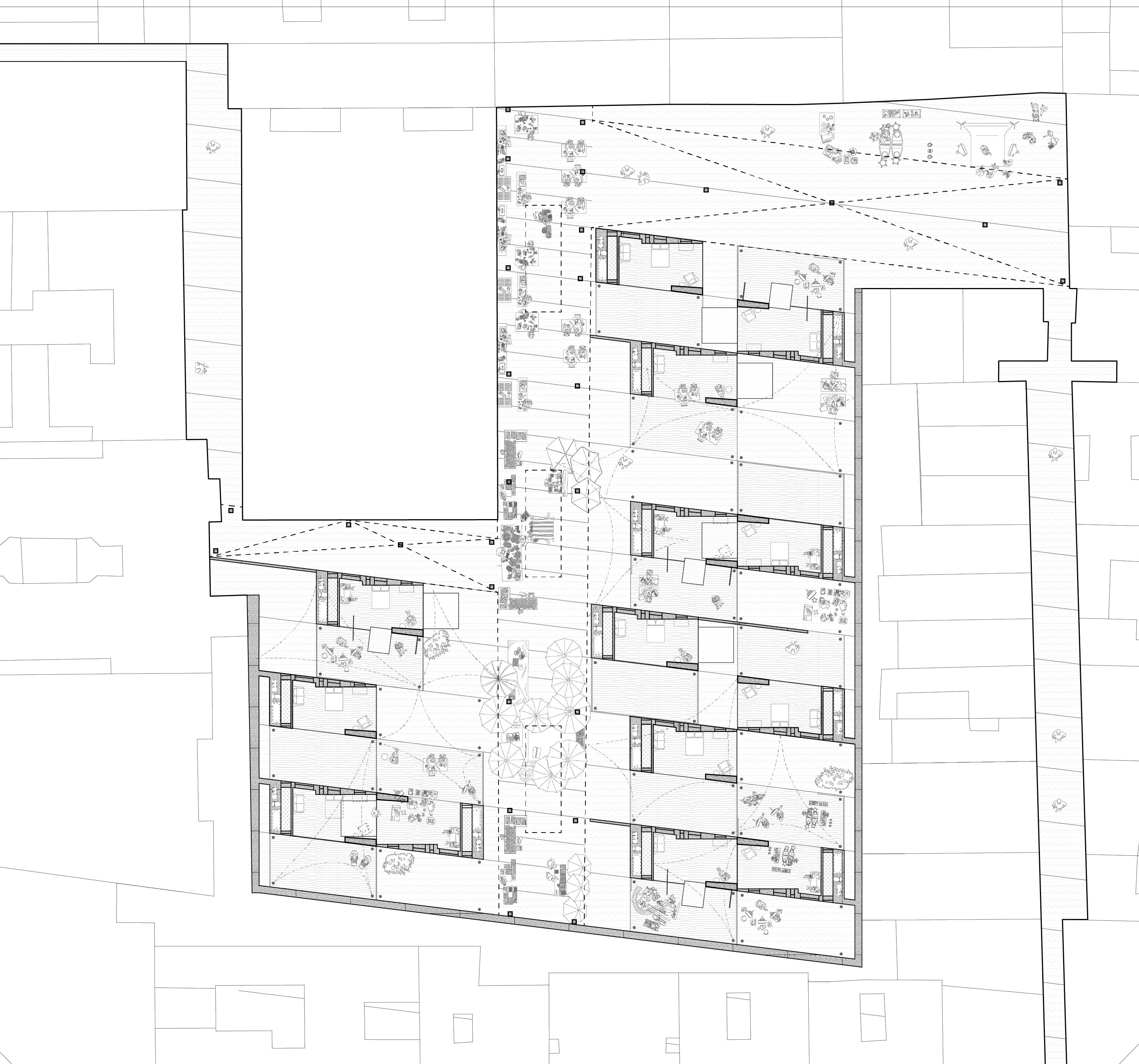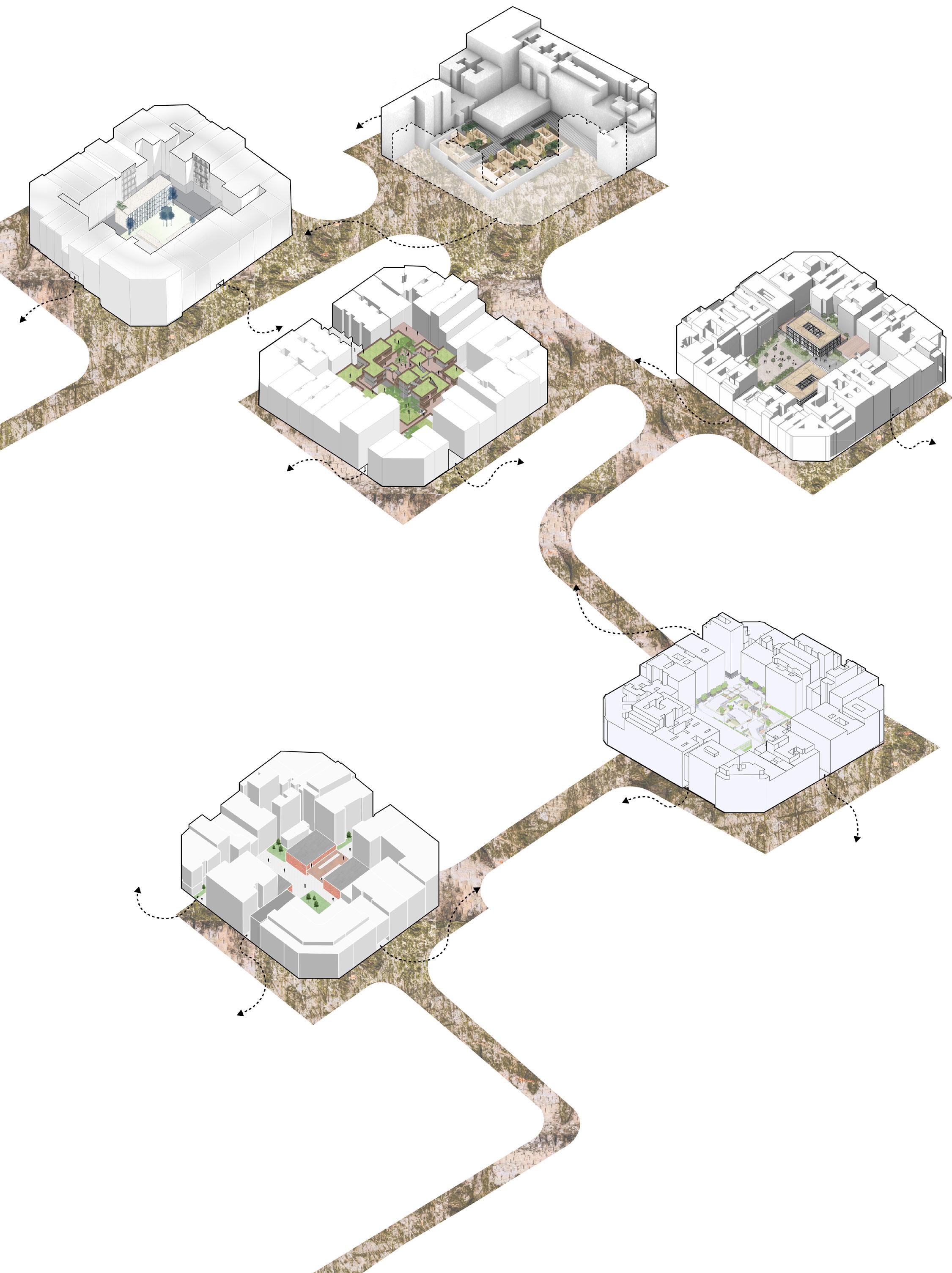 Cámping Urbá reimagines the Cerda block using subtraction as a design strategy to reframe collective life. By removing interior volumes and selective perimeter fragments, the site is opened to form a continuous public passage. What remains is not treated as residual, but as generative: an existing structure is retained and reconfigured as housing for temporary inhabitants. Individual pods are reduced to their essentials that invite spontaneous occupation and redefine belonging through participation rather than permanence, operating as an urban campsite.