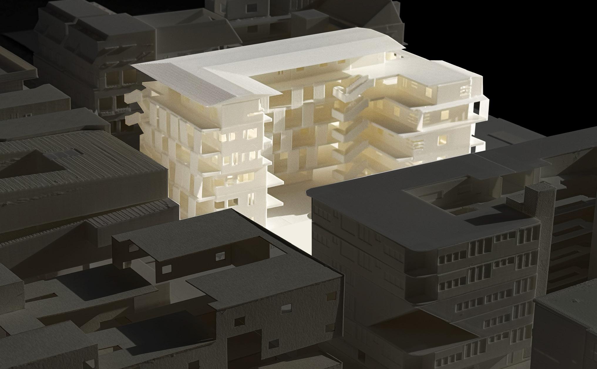 Shifted Views reflects an interest in how architecture shapes both the user experience and how the building’s exterior communicates privacy or openness to those nearby. The moving louvers create an ever-changing facade, serving as shading and privacy screens that shift throughout the day. The unit layouts emphasize a gradient from public to private spaces, with balconies acting as flexible thresholds between them.