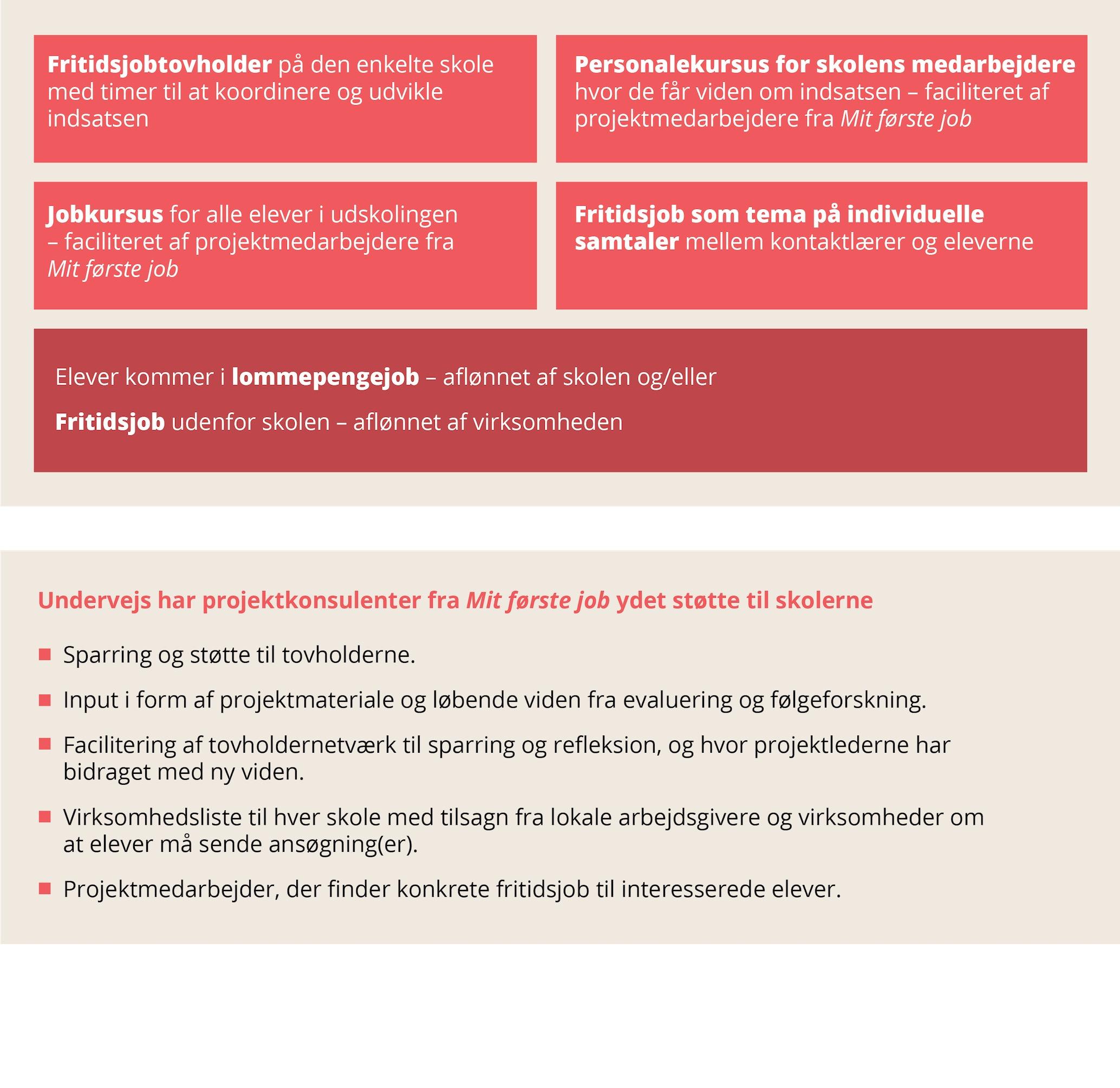 Fritidsjobindsatsen Mit første job har bestået i forskellige elementer og aktiviteter, der er gennemført af både projektkonsulenterne fra Mit første job og af fritidsjobtovholdere og personale på skolerne. De beskrives herunder. Se også et overblik på side 13.