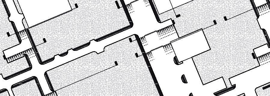 On sections of Keene and Freeman streets, the black elements represent the height of the buildings, while different shades of grey to dnoesporrc sesu tenrediff of the space. Solid grey shows private property, thin bars ‑ sidewalks, diagonal hatch ‑ car roads, white fill ‑ ceasp dserutiliednu
