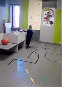 pegar la cinta en el piso haciendo diferentes formas que el niño pueda seguir con sus pies y manos, la idea es crear un laberinto con dificultades Entre las cintas ubicar cestas o cajas donde el niño pueda trepar y mover objetos con las manos o los pies alternadamente. En la mitad del laberinto ubicar la colchoneta para que el niño pueda reptar sobre la misma.