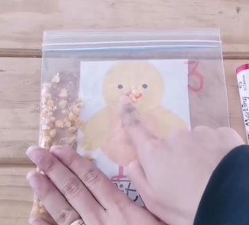 Para la visión y tacto poner pequeñas cantidades de pintura dentro de cada bolsa, pueden mezclase colores si se desean, y se cierran. Al hacer esto el niño puede ver y manipular los objetos que están dentro del paquete.