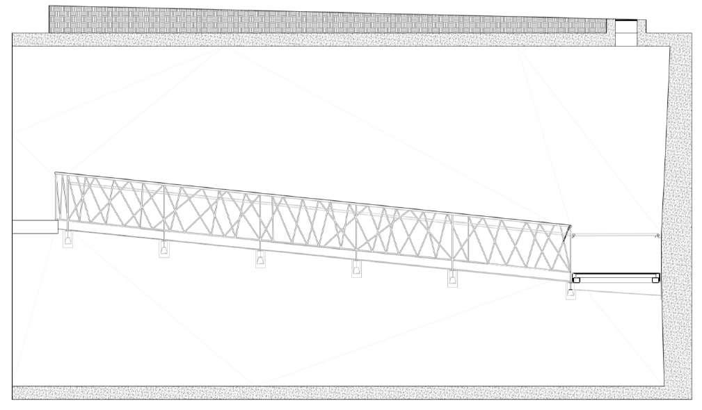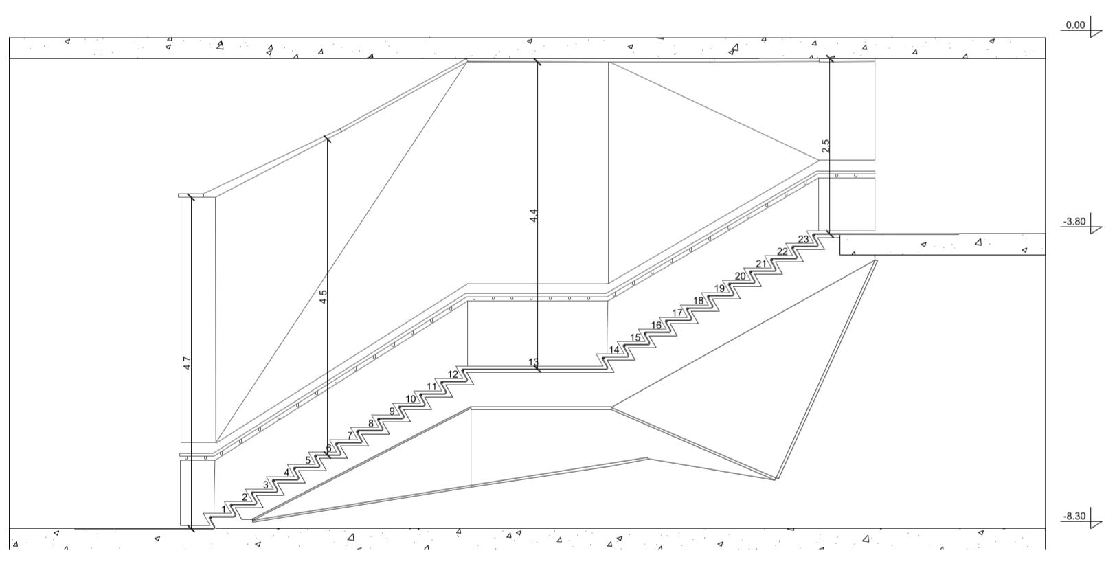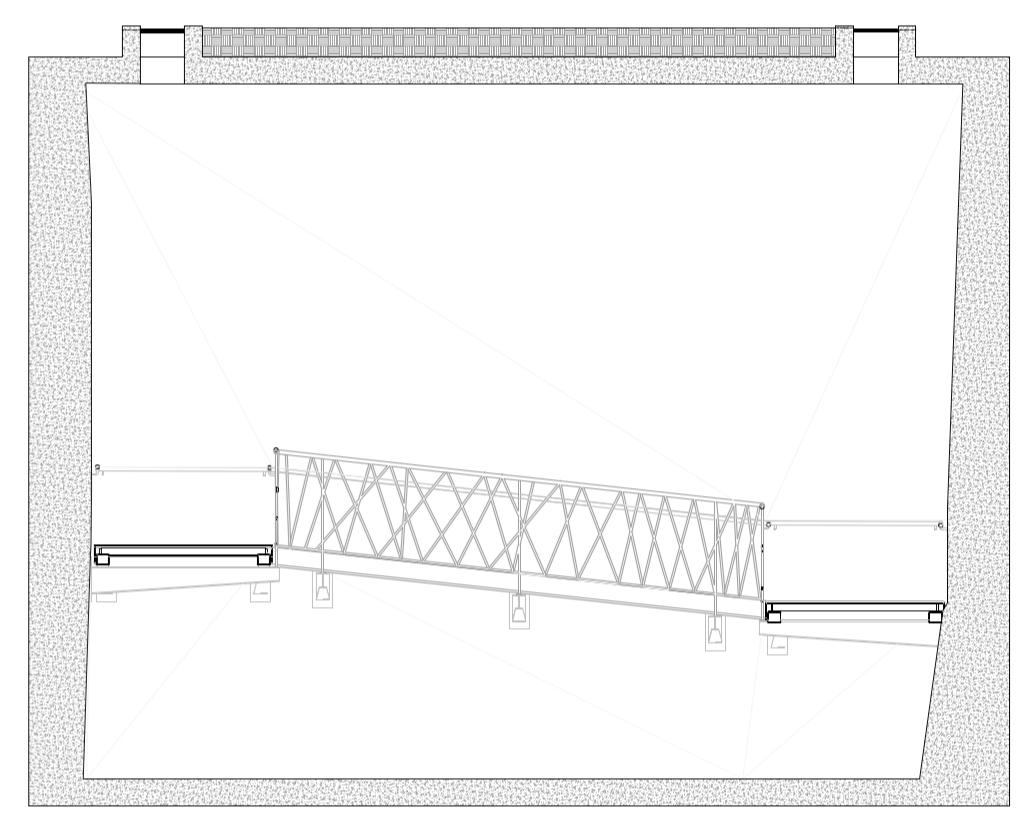 1:50 Plan for the main interventio, designing the base of the plateform on which the main event will occur. It's devided to communal area (right plan) and the screening area (left plan)