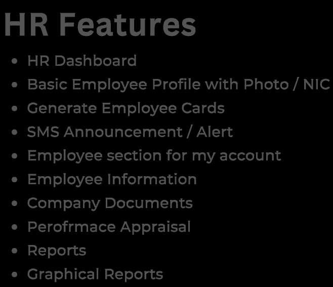 has Features Included PayrollDashboard Employeebasicpaystructure. Employeewisemasterpayroll. EmployeeAllowances&deductionssetups. Monthlypayroll. Payslip. IncomeTaxstatement. EOBIstatements. Providentfund. LoanandAdvancedpaymentschedule. GenerateGraphicalReportsmonthly, payroll,chequedetails,overtime, incometaxandloanetc).