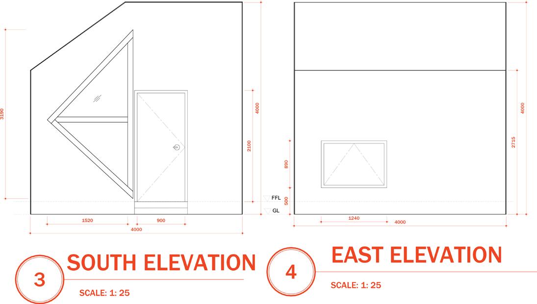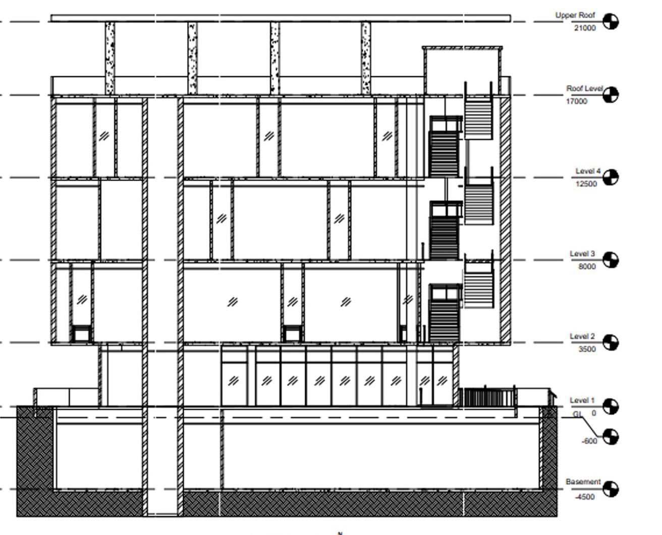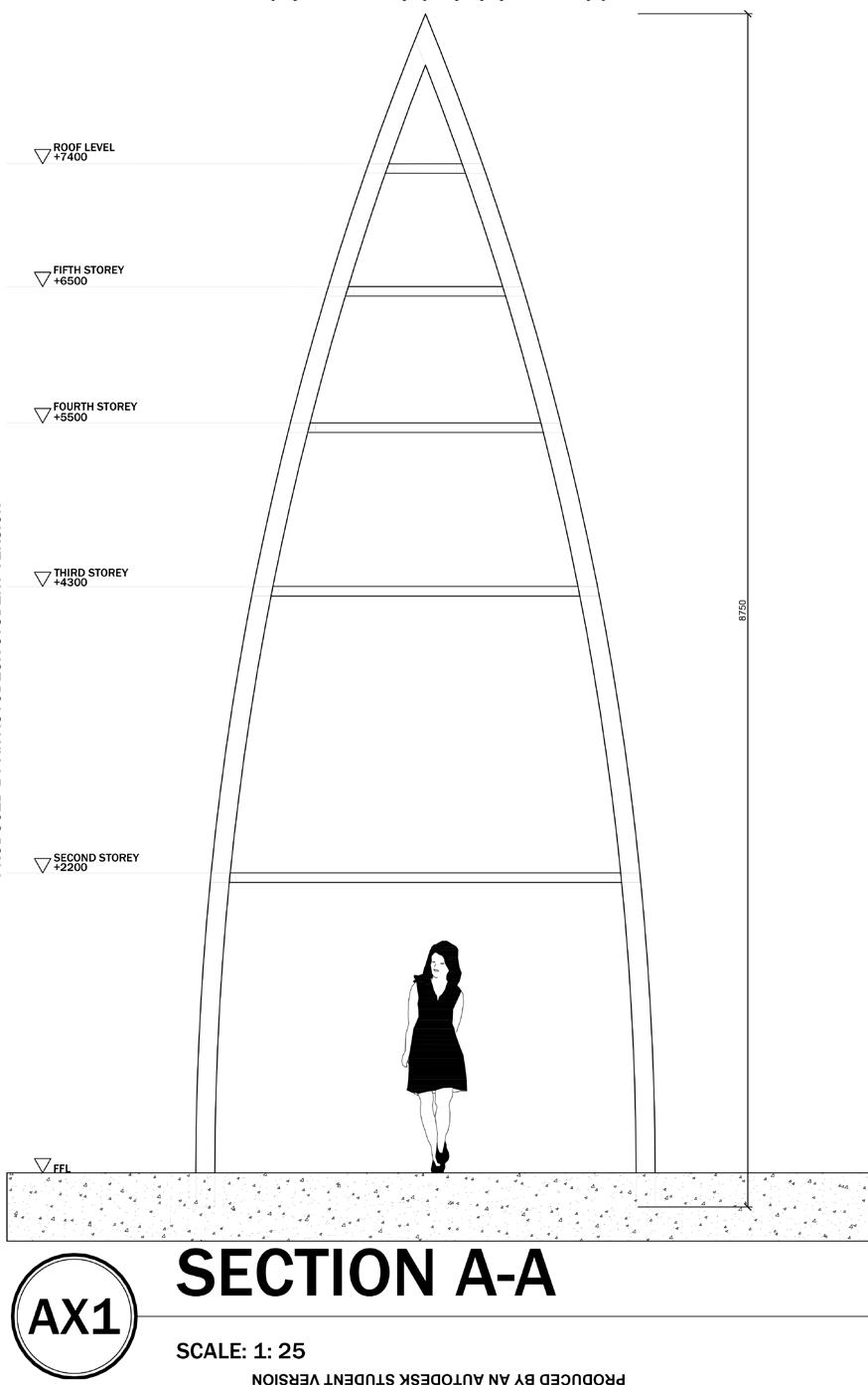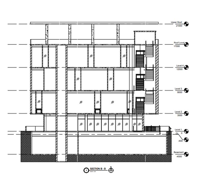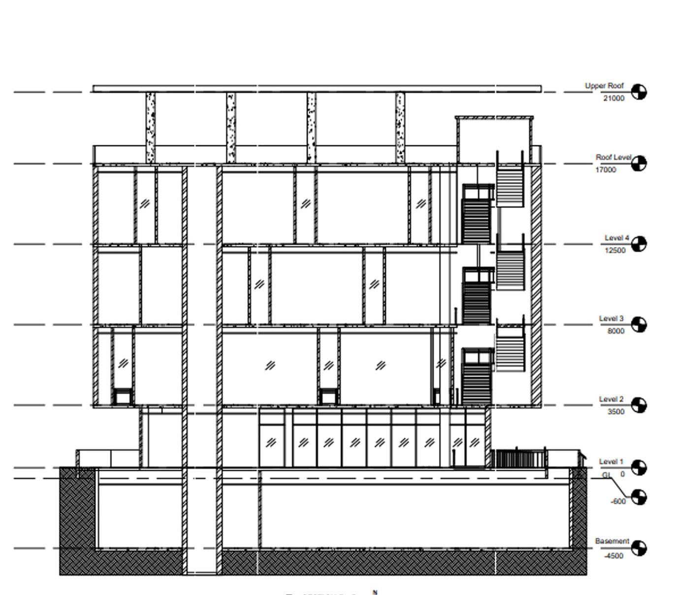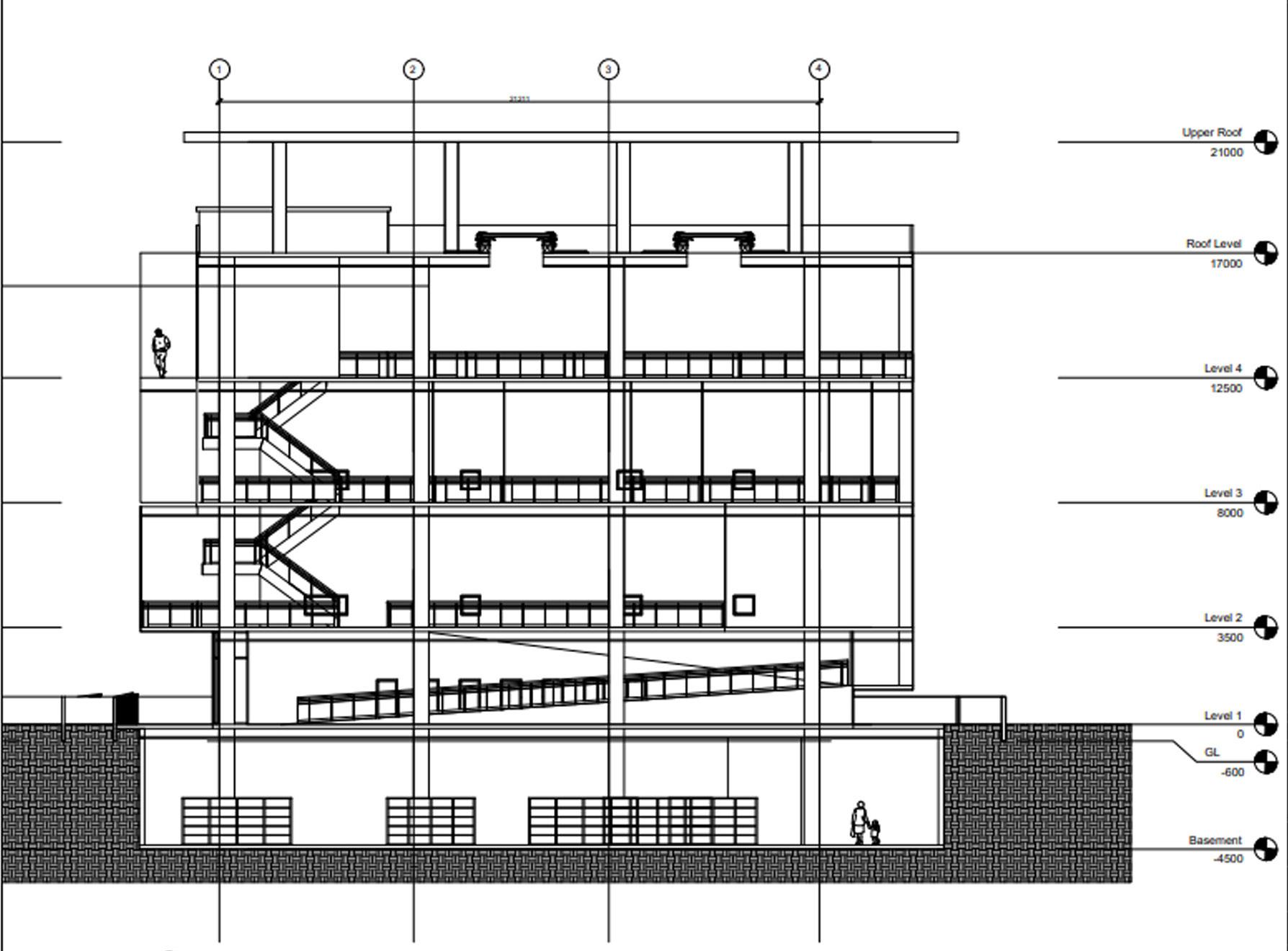 THIRD STOREY + 4300 SECOND STOREY + 2200 FFL FFL SECOND STOREY + 2200 + 4300 THIRD STOREY + 5500 FOURTH STOREY + 6500 FIFTH STOREY + 7400 ROOF FRONT VIEW PLAN VIEW EAST VIEW 8750