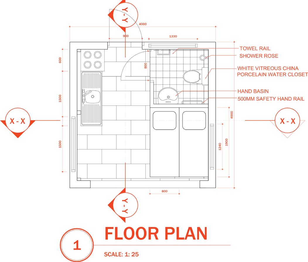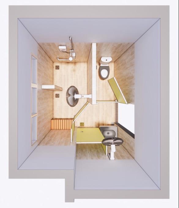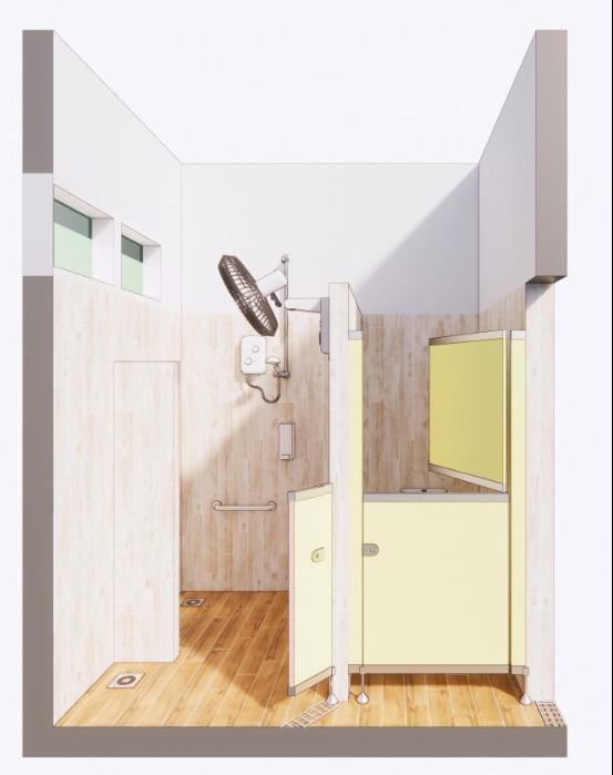 Here is another 3D model that I have done using Revit software. It shows the overall layout of the toilet and to see how the phenolic door looks in the middle of the toilet plan.