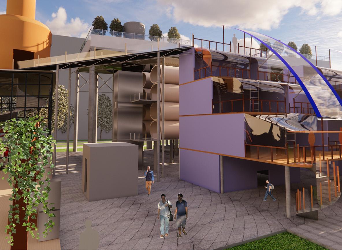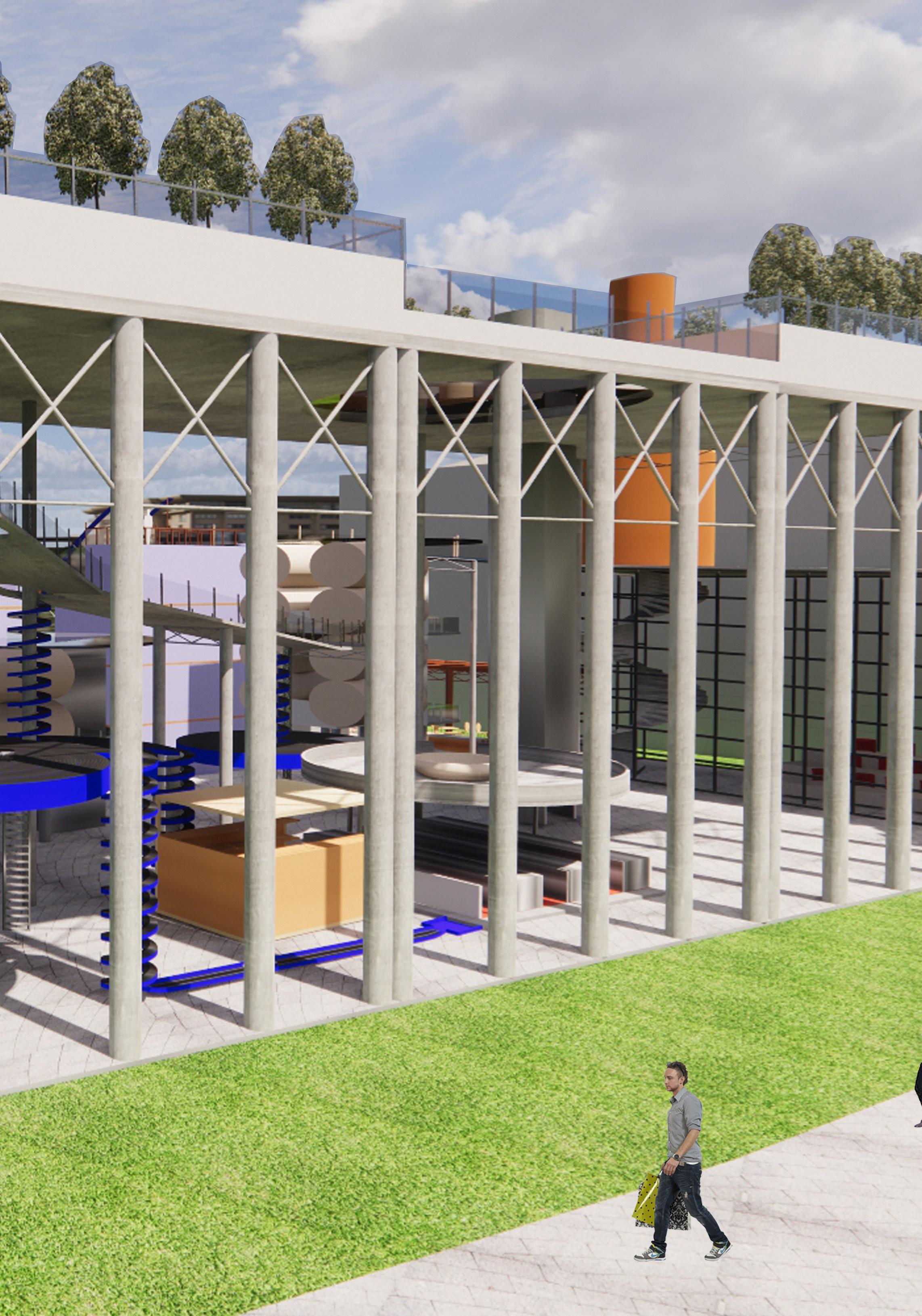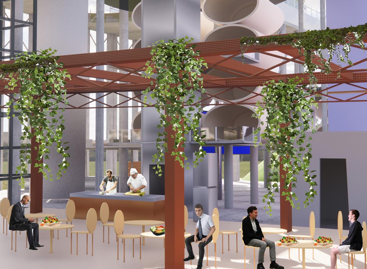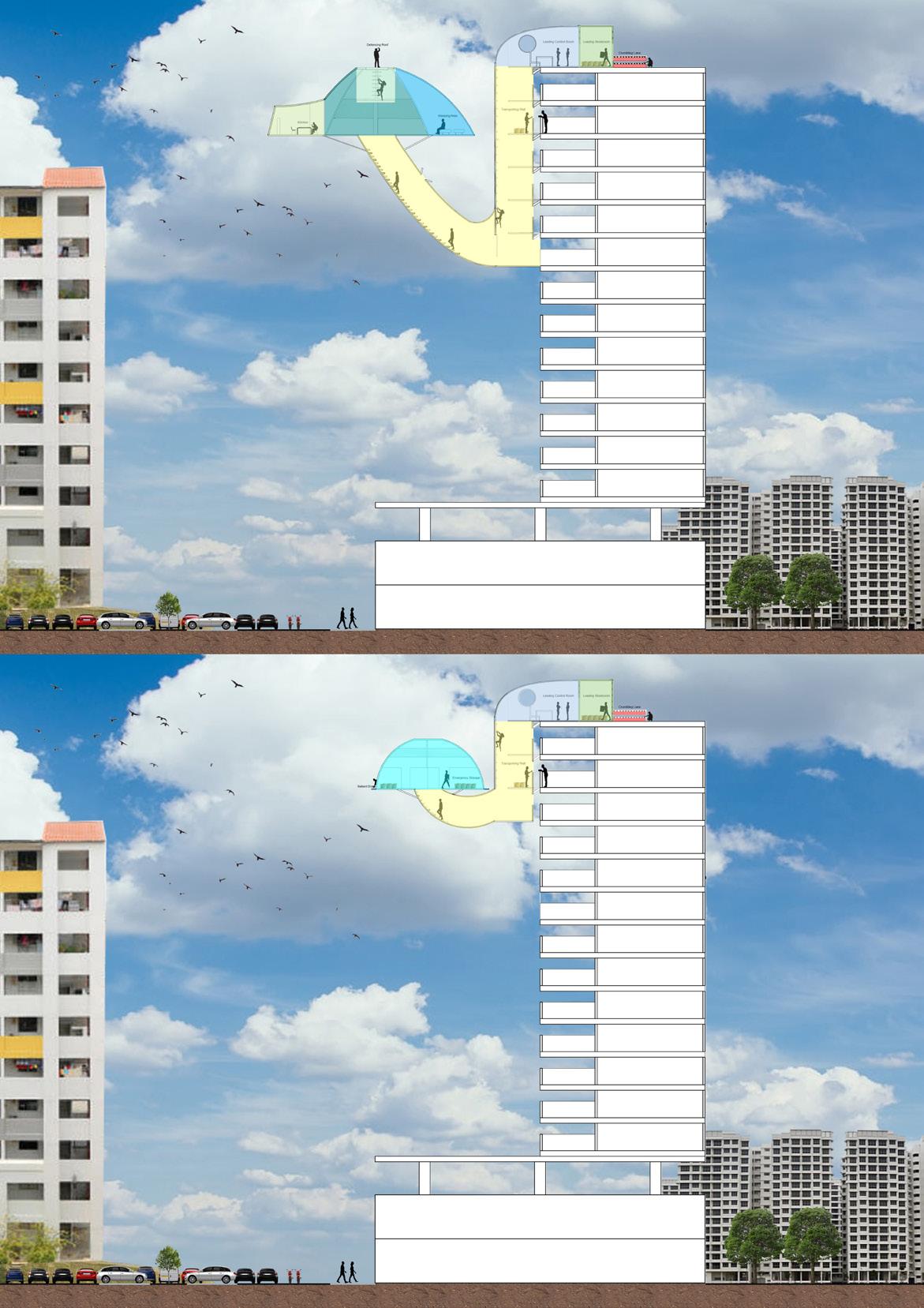 The lead person in the leading control room will guide and lead the community to other spaces that require manpower. The middle part of architecture will have group of community deliver the food to the resident. The upper level will have people store their foods in the emergency storage, rest and eat at the relaxing hall.