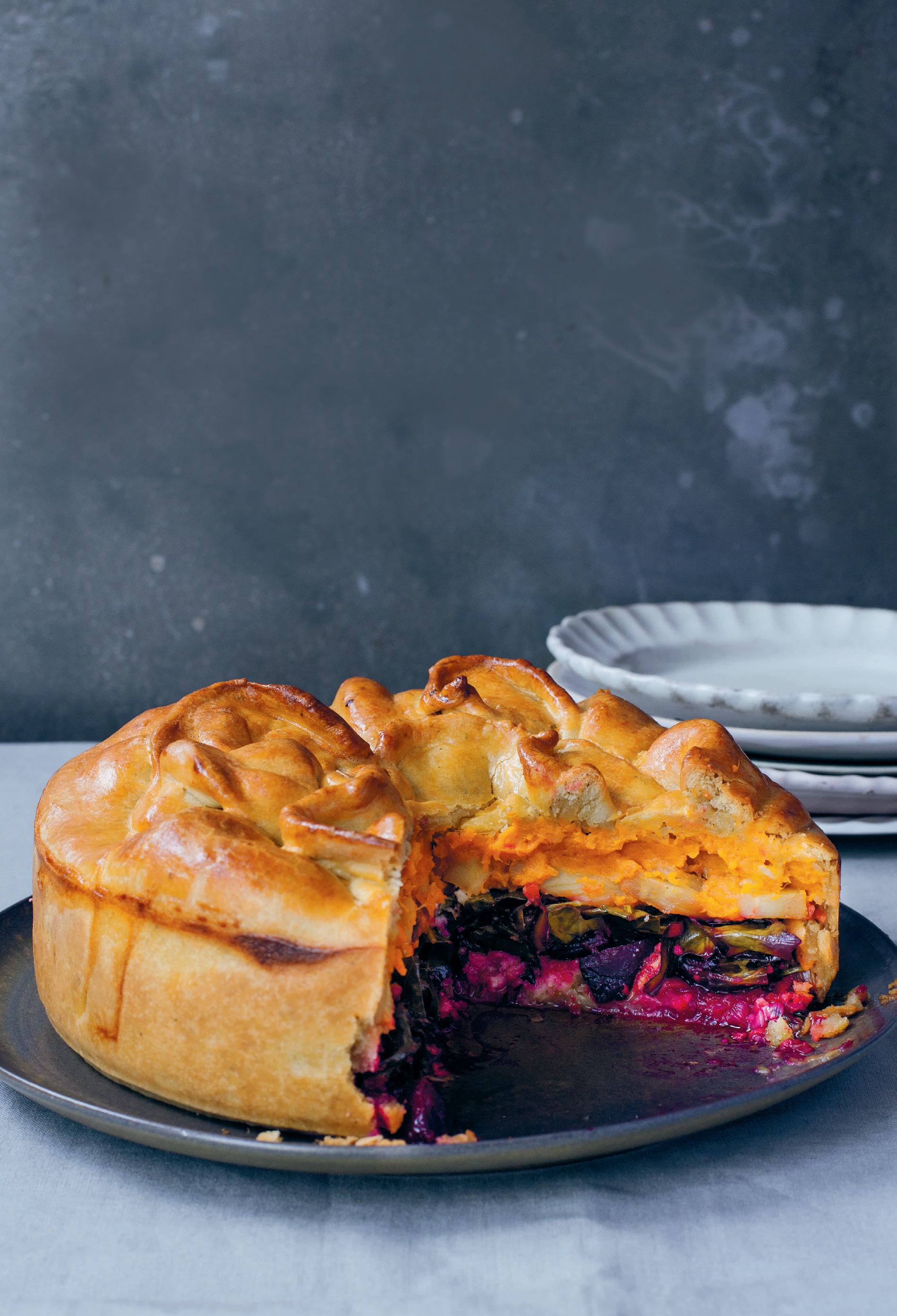 Line a 20cm springform cake tin, leave some hanging over the edges. Create layers by adding the leeks, then a grating of cheese, the beets, the greens, and another layer of cheese, then the parsnips and finally the sweet potato mash.