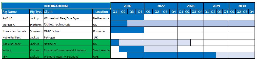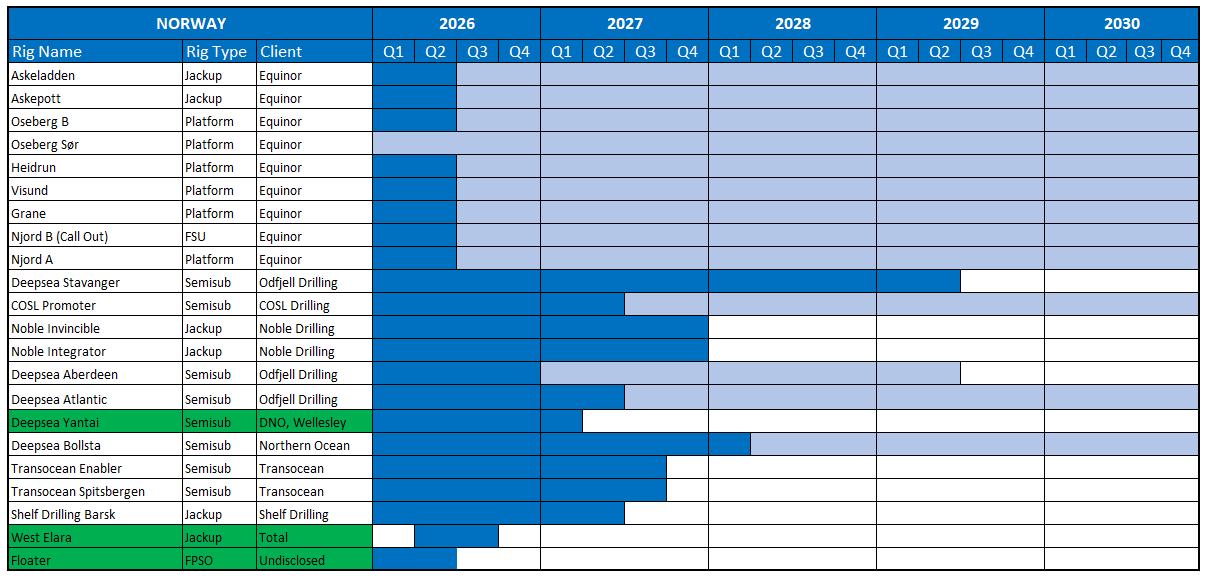 Note: Contract start, and duration is Soiltech’s best estimate. Contracts normally follow the rig’s contract. When change in client there may be periods without operation. Rigs may carry out Special Periodic Surveys and rig moves where there are no activity.