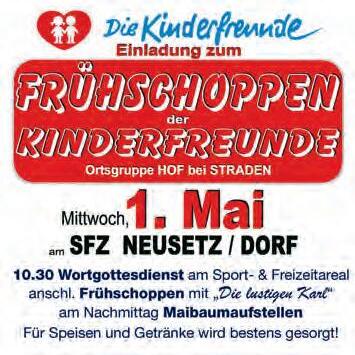 Straden: Frühschoppen der Kinderfreunde OG Hof bei Straden, SFZ Neusetz-Dorf, ab 10.30 2. Mai