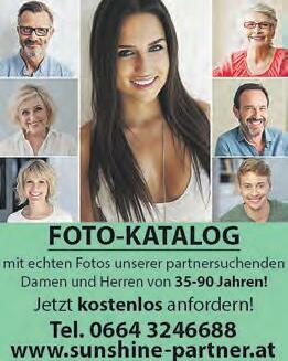 Daniel 66 J. Gepflegt, sportlich und naturverbunden sucht eine Partnerin mit Niveau… Tel. 0664/3246688, www.sunshine-partner.at Katharina 66 J. Tolle Ausstrahlung, sehr spontan, sucht eine Schulter zum Anlehnen… Tel. 0664/3246688, www.sunshine-partner.at