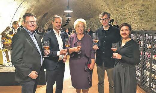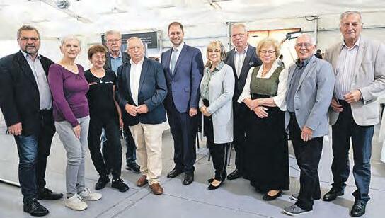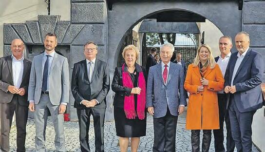 Die Ehrengäste vor der Friedensburg Schlaining, darunter Bundespräsident a.D. Heinz Fischer (4.v.r.) und LH Hans Peter Doskozil (r.).