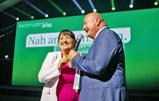 Landeshauptmann-StellvertreterinManuelaKhomwurdebeim außerordentlichenLandesparteitag derSteirischenVolksparteiinder PremstättenHallemit98,6%zur Landesparteiobfraugewählt.417 der423Delegiertenstimmtenfürsie undwähltensiedamiteindrucksvoll alsLandesparteiobfrau.Insgesamt kamenüber1.000GästeundDelegiertezusammen,umeinklaresZeichenderGeschlossenheitzusetzen. InihrerRedewarbdieManuela KhomfürZusammenhaltundGeschlossenheittrotzallerUnterschiede:„UnsereGemeinschaft,dasGefühl,miteuchmiteinanderundSeite anSeitezugehen,tutgut.Nichtjeder fürsichalleine,sondernwirallegemeinsam–alsGemeinschaft–sind wirstark.Wirstehenfüralle.Darum sindwirdieVolkspartei.Wirhaben dieJungen,dieAlten,wirhabeneine starkeFrauenpolitik,einestarke Arbeitnehmerpolitik,wirhabendie Landwirtschaft,dieUnternehmer. DassindkeineGegensätze,sondern dieVielfaltderSteirischenVolkspartei“,sodiefrischgewählteLandesparteiobfrau.„ManuelaKhom wirdunsereParteimenschlichin eineerfolgreicheZukunftführen. MitHerzundHaltungumarmtsie dieganzeSteiermark,weilihrHerz fürdasLandunddieLeuteschlägt“, soKlubobmannLukasSchnitzer, derdenWahlvorschlageinbrachte, undunterstreicht:„DurchdashervorragendeWahlergebnisgehenwir miteinerstarkenMannschaft,einer
